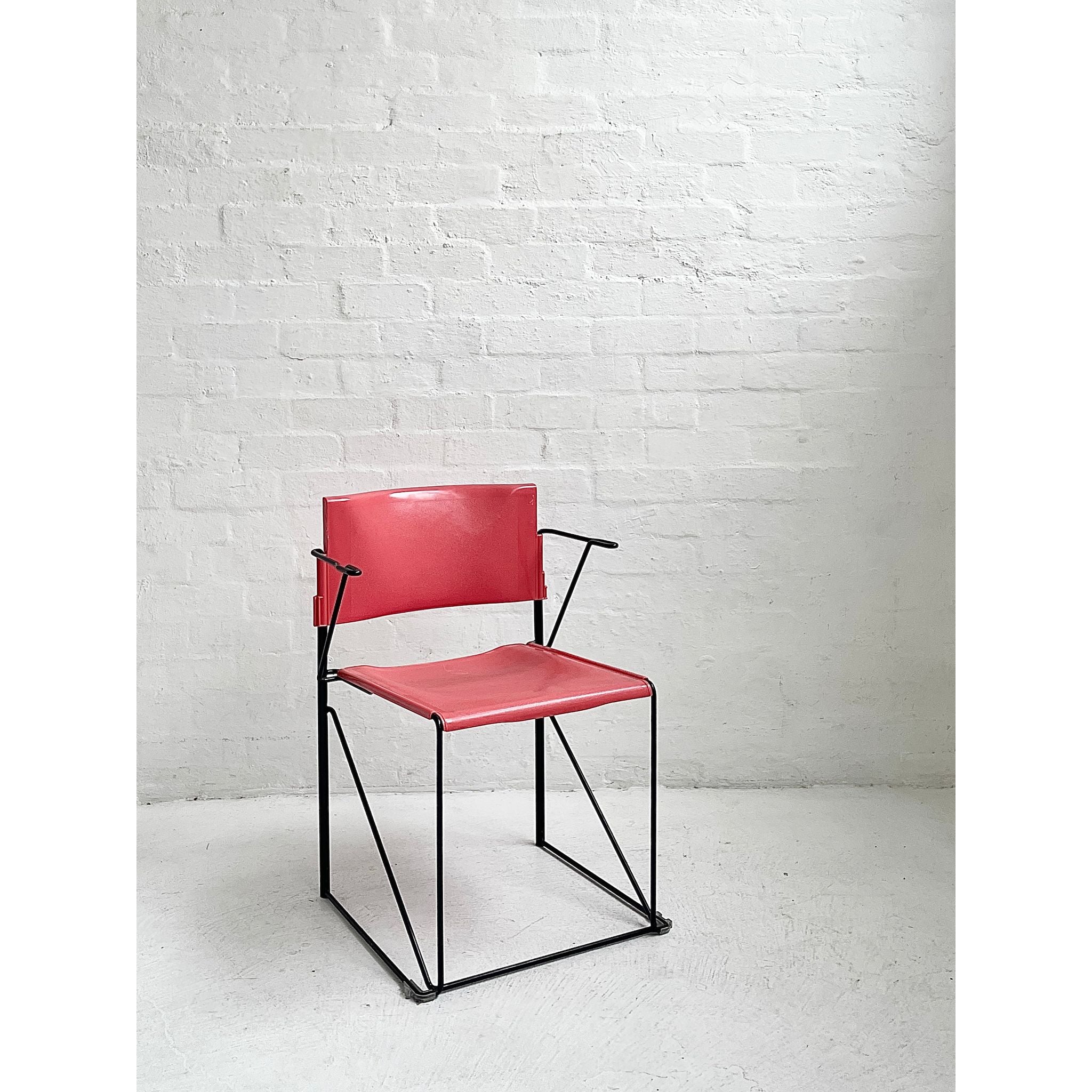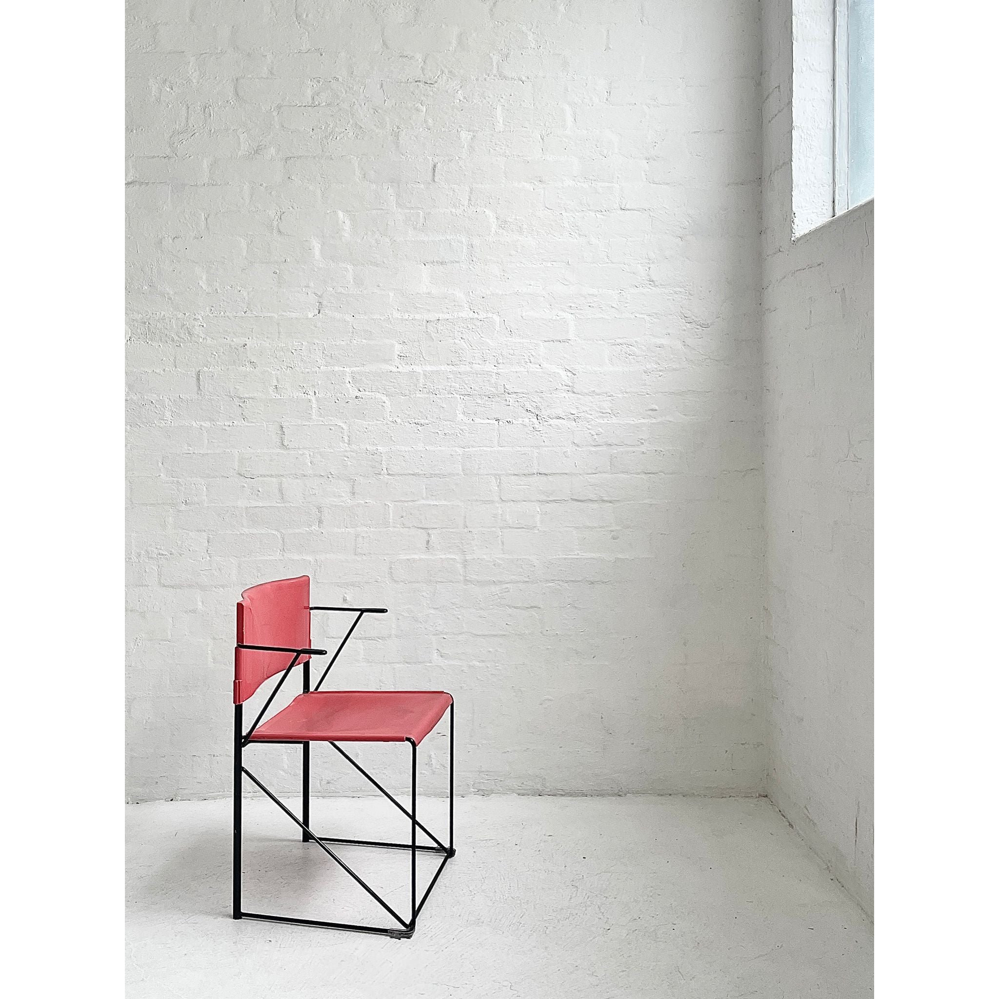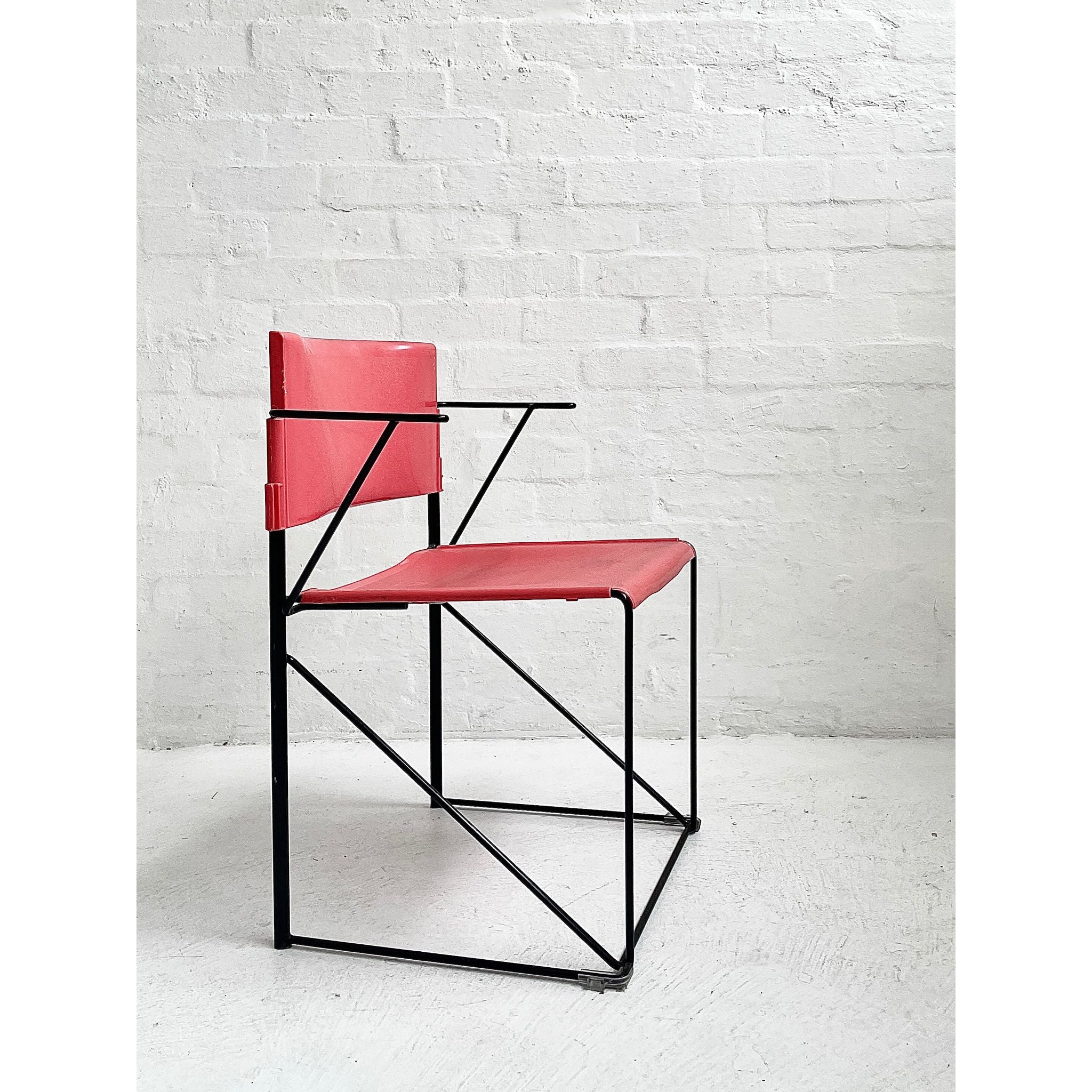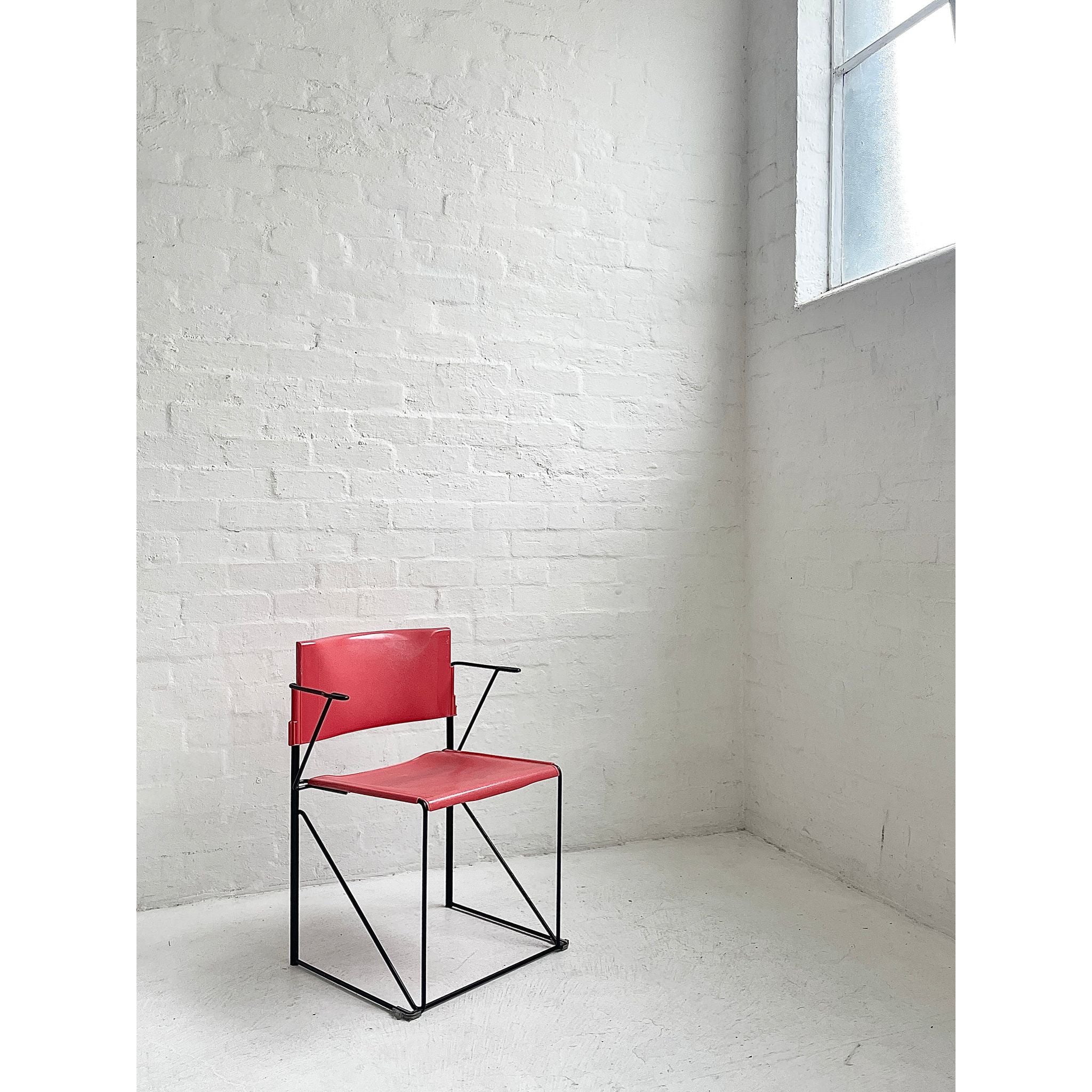 A geometric armchair with a distinctive, sculptural frame. The Vlad Muller Chair features a powder-coated steel structure with moulded plastic seat and back, giving it a strong visual presence while remaining lightweight and practical.