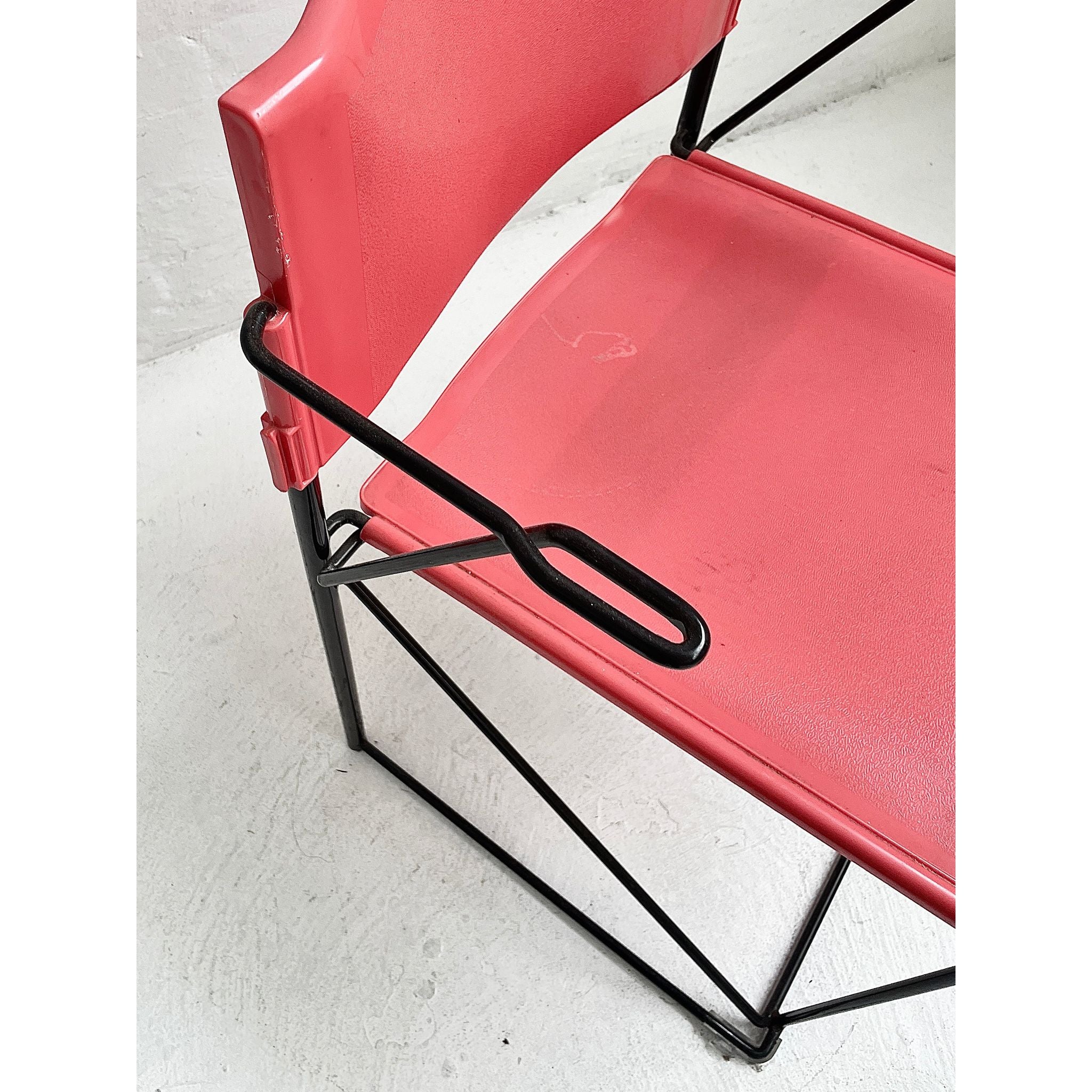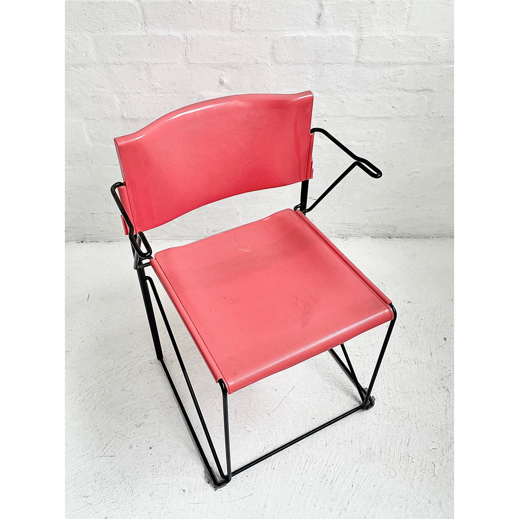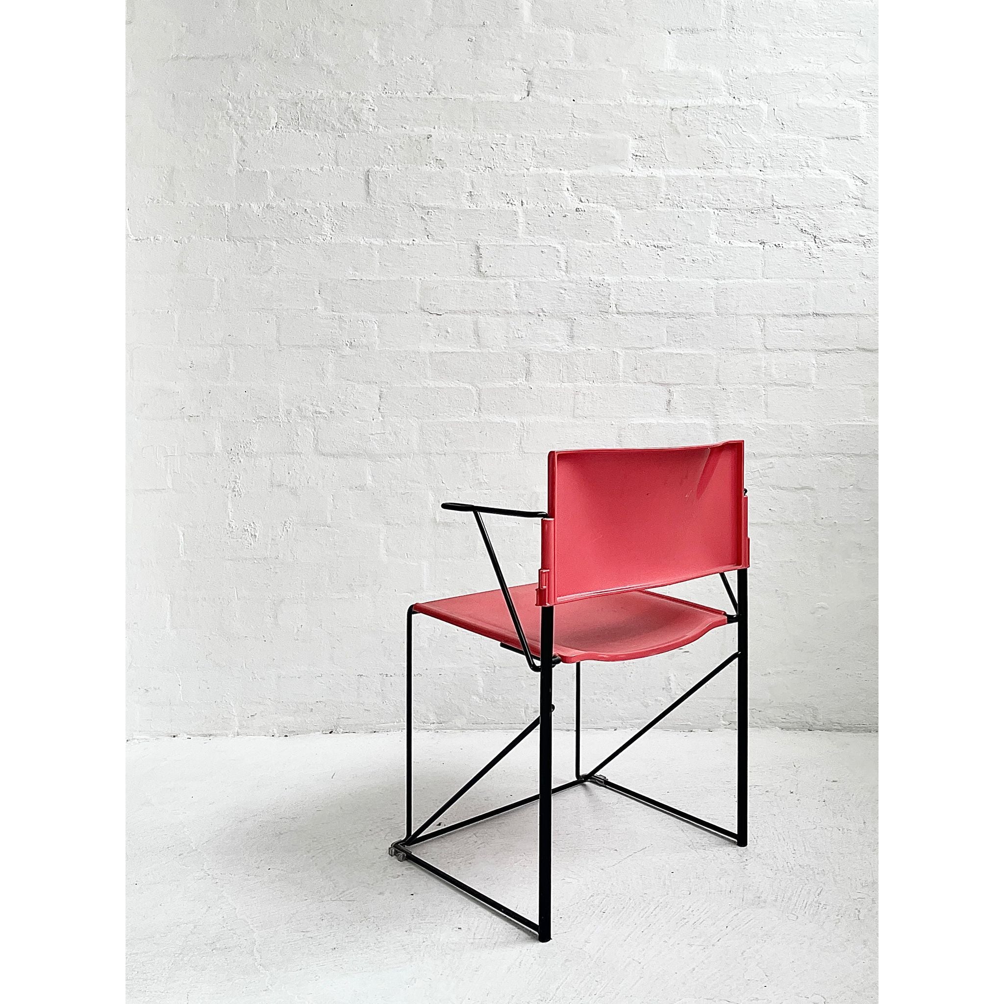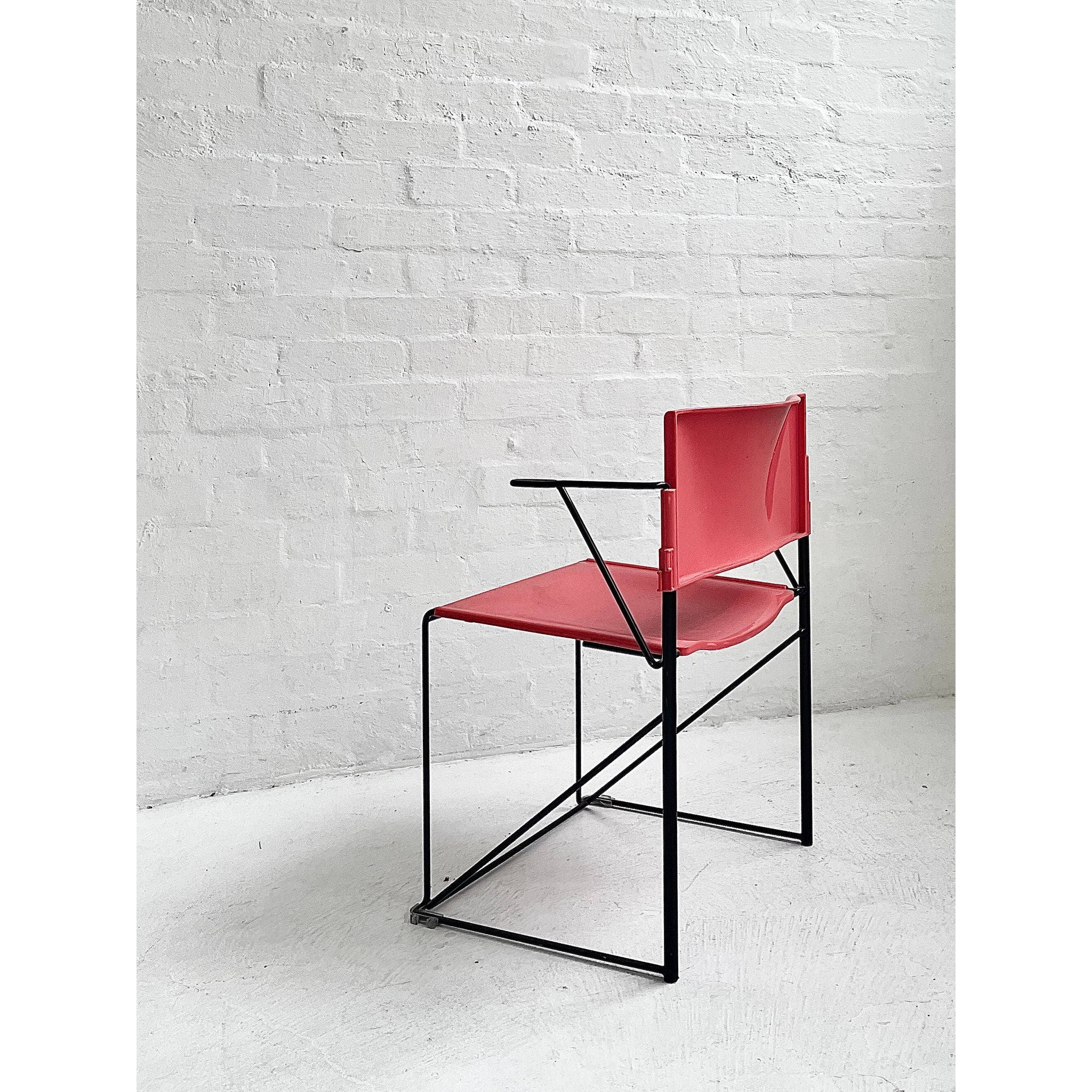 A geometric armchair with a distinctive, sculptural frame. The Vlad Muller Chair features a powder-coated steel structure with moulded plastic seat and back, giving it a strong visual presence while remaining lightweight and practical.