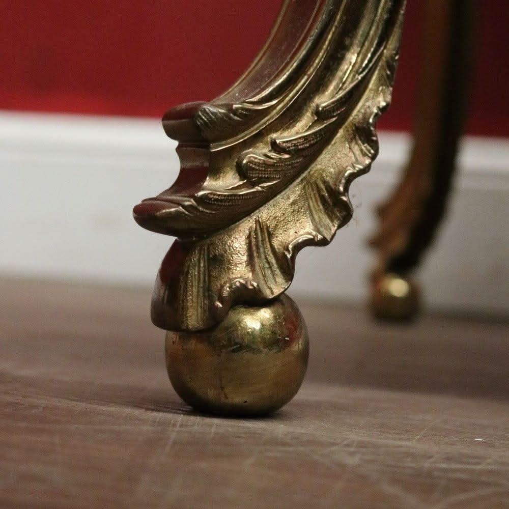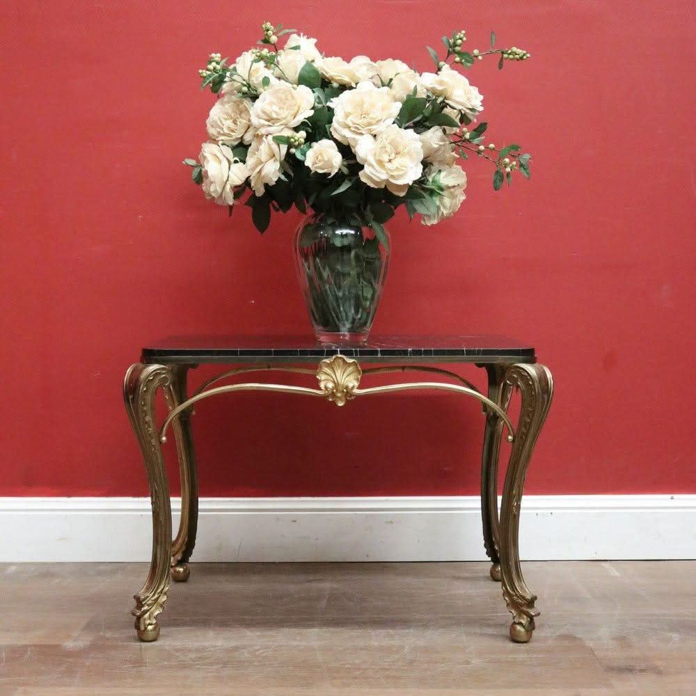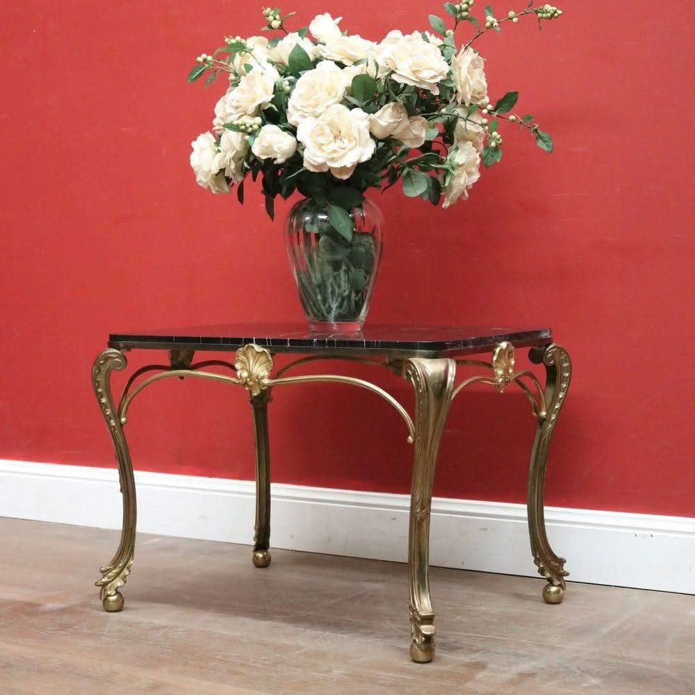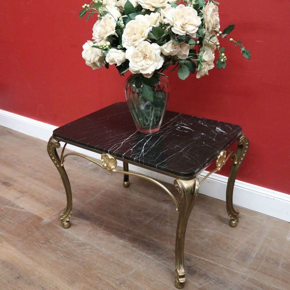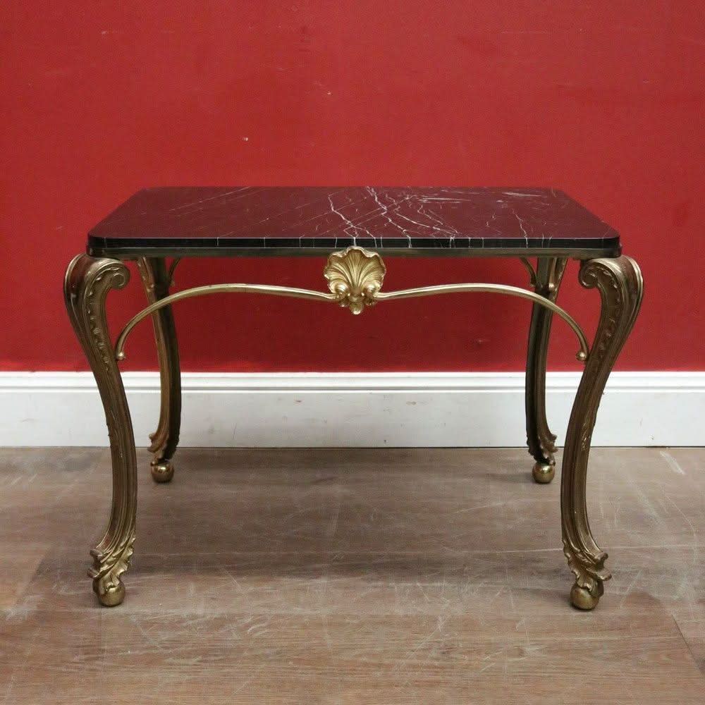 Description: Vintage French coffee table with a brass base and black marble top. It is rectangular and features cabriole legs ending in ball and claw feet. This piece is both elegant and practical.