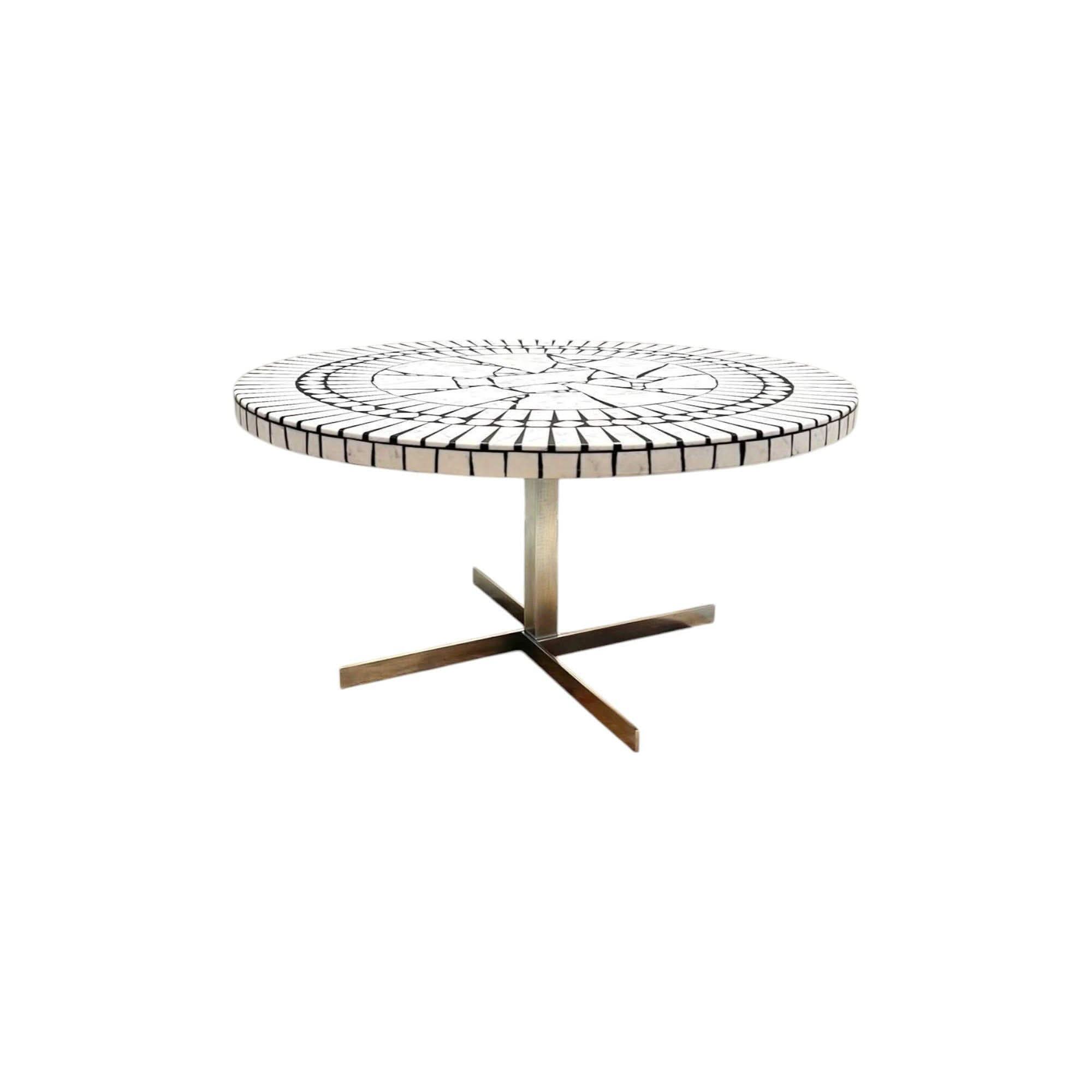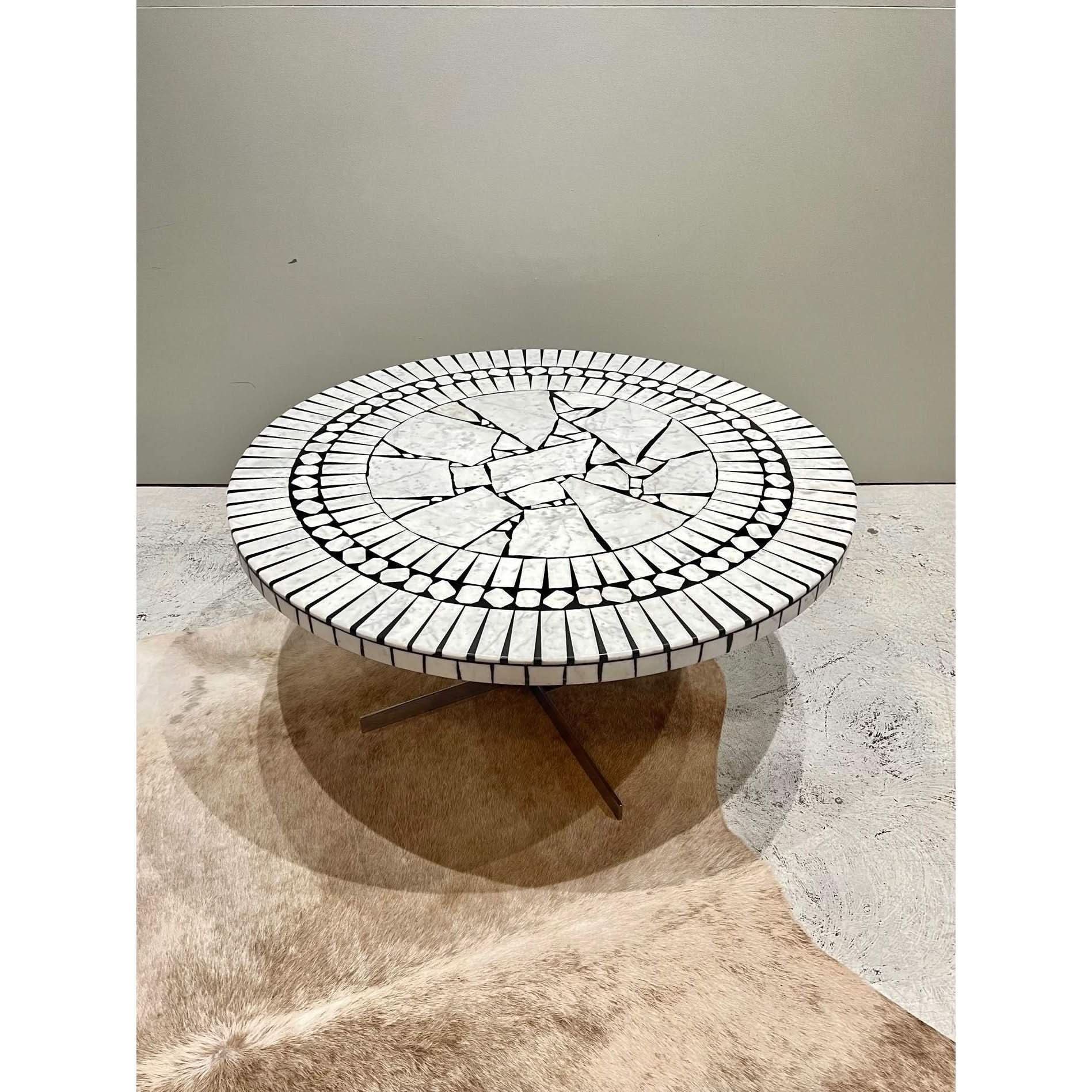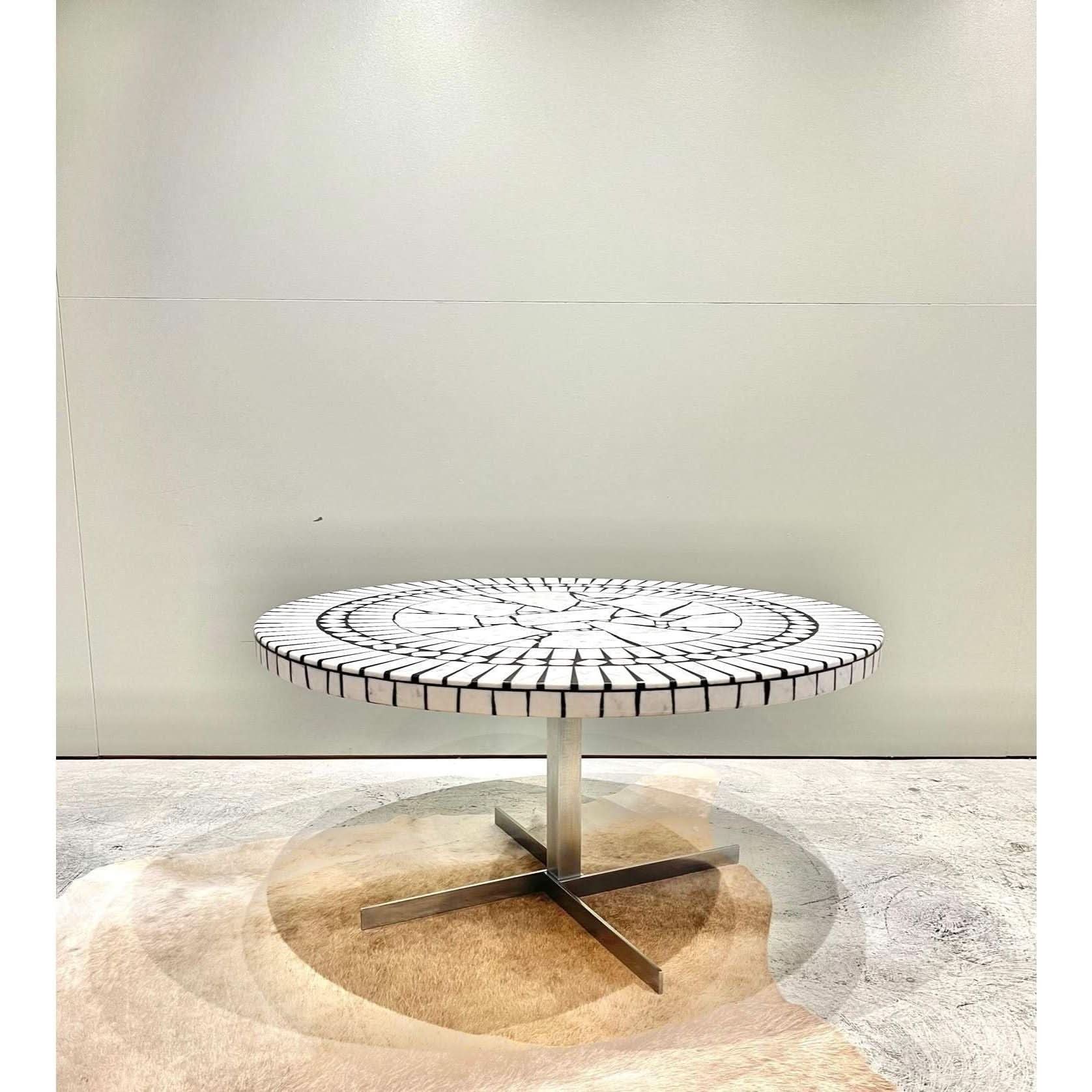 This table is designed and made by Polish born but German raised artist Heinz Lilienthal in the 1970s. The top was created by cutting down marble into small pieces and then crafting them in such a way that the round shape of the marble remains intact. Afterwards, the marble pieces were connected through epoxy and then the entire top was coated in a transparant varnish. The foot is made out of stainless steel and has a typical four-leg foot design.