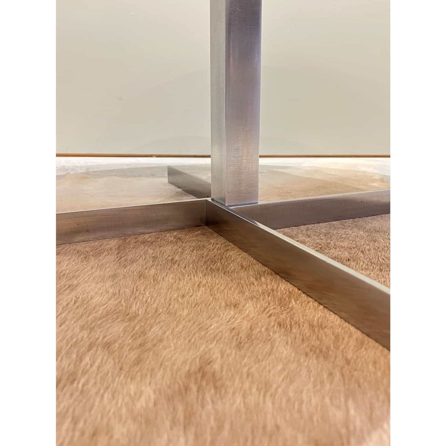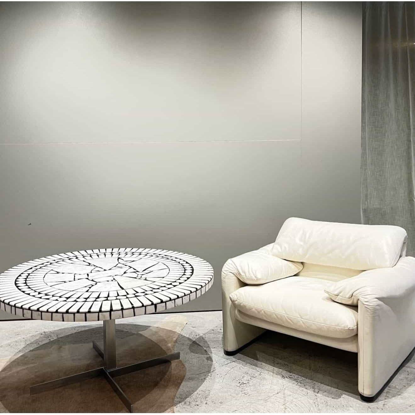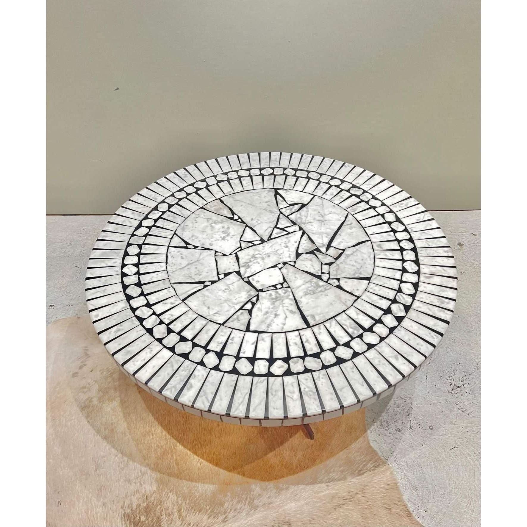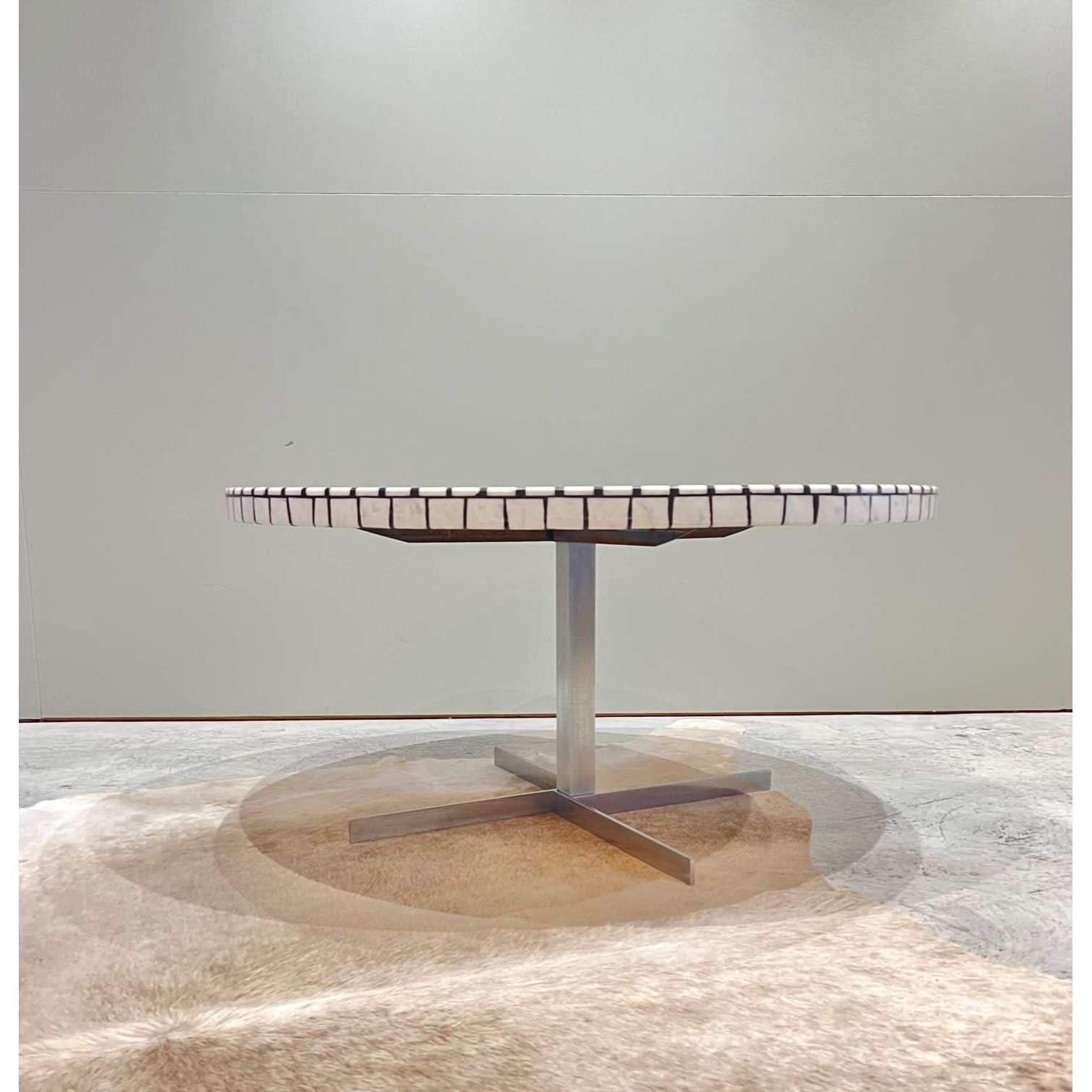 This table is designed and made by Polish born but German raised artist Heinz Lilienthal in the 1970s. The top was created by cutting down marble into small pieces and then crafting them in such a way that the round shape of the marble remains intact. Afterwards, the marble pieces were connected through epoxy and then the entire top was coated in a transparant varnish. The foot is made out of stainless steel and has a typical four-leg foot design.