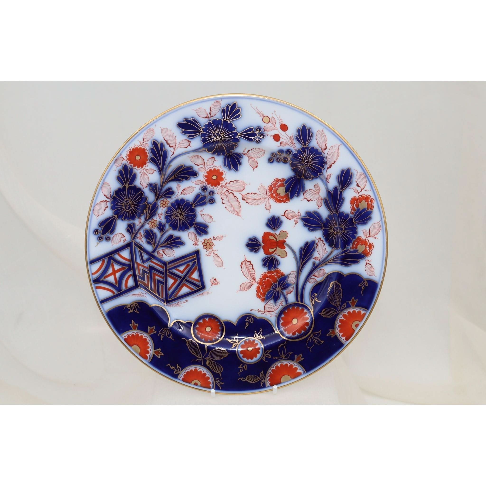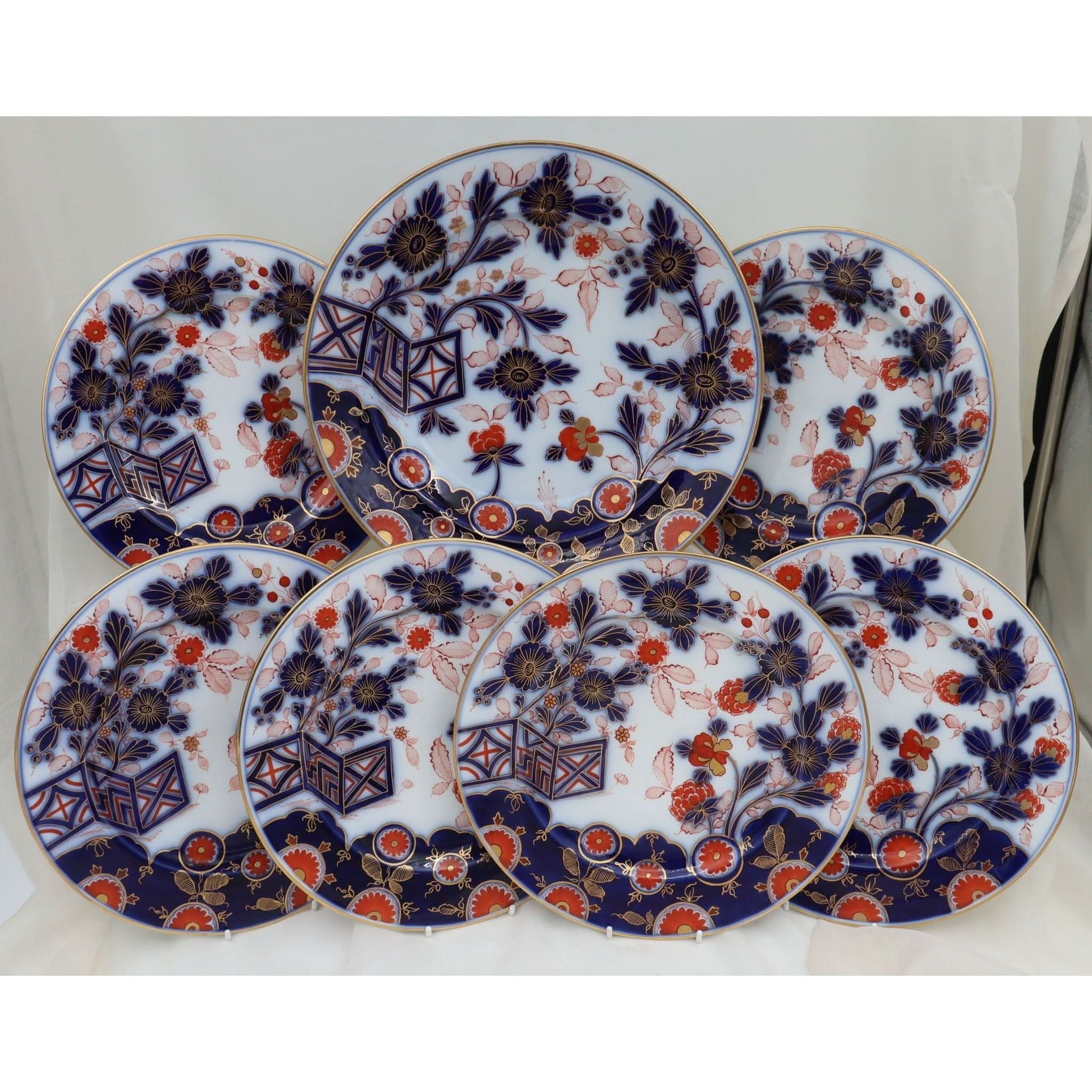 This good quality Fischer & Mieg seven piece hand painted porcelain dessert set consists of six plates and a larger bowl. It is decorated with a hand painted and gilded Imari pattern using the traditional colours of cobalt blue, iron red and gold, and imitates a Japanese design. Fischer and Mieg were situated in a town known as Pirkenhammer in Bohemia, now named Brezova in the Czech Republic, and were well known for producing good quality items. The plates have a diameter of 242 mm (9.5 inches), while the bowl measures 300 mm (11.5 inches) in diameter and stands 40 mm (1.5 inches) high. The set is in very good condition, with one plate having a small shallow chip to the back of the rim. This can't be seen from the front. It dates from the 1870's.