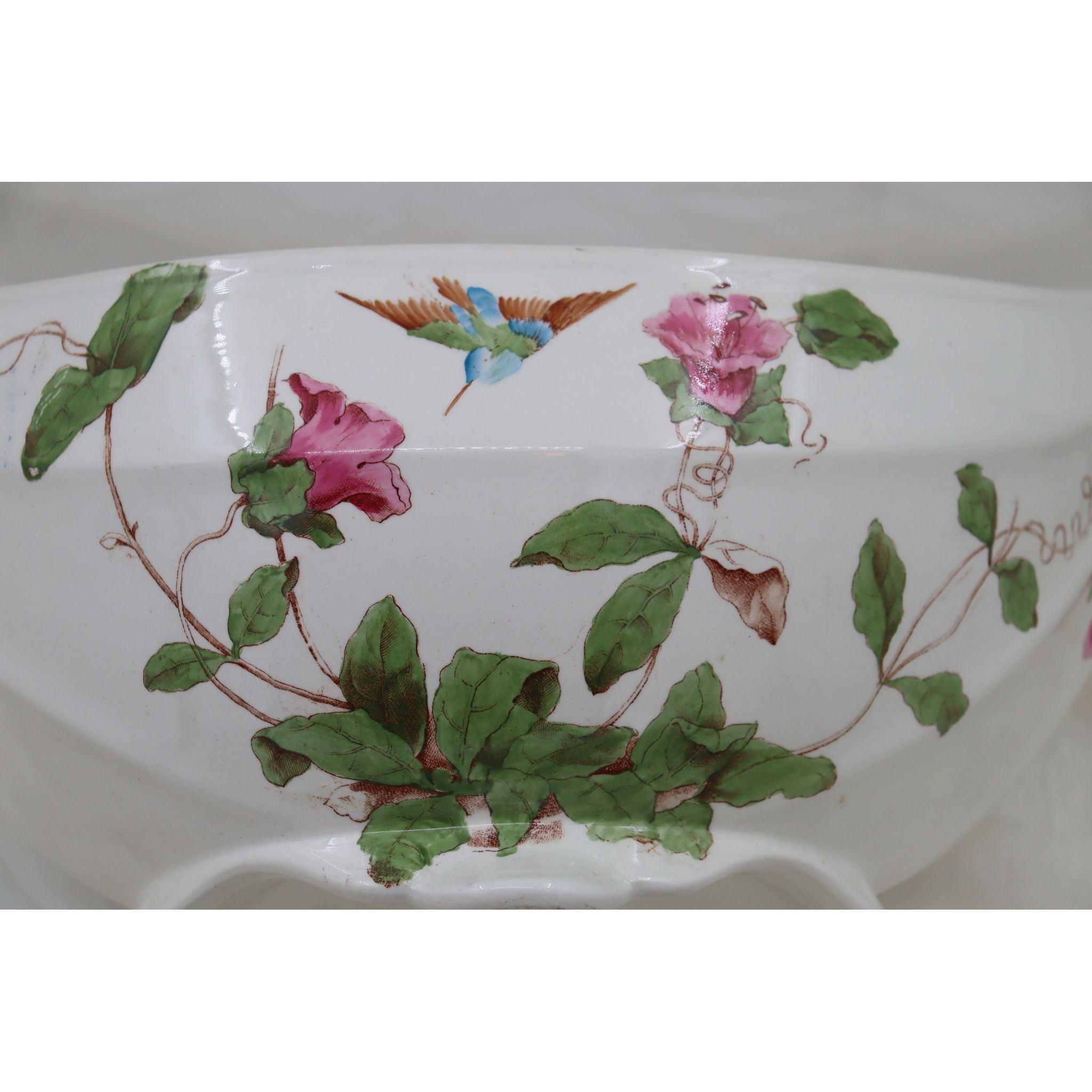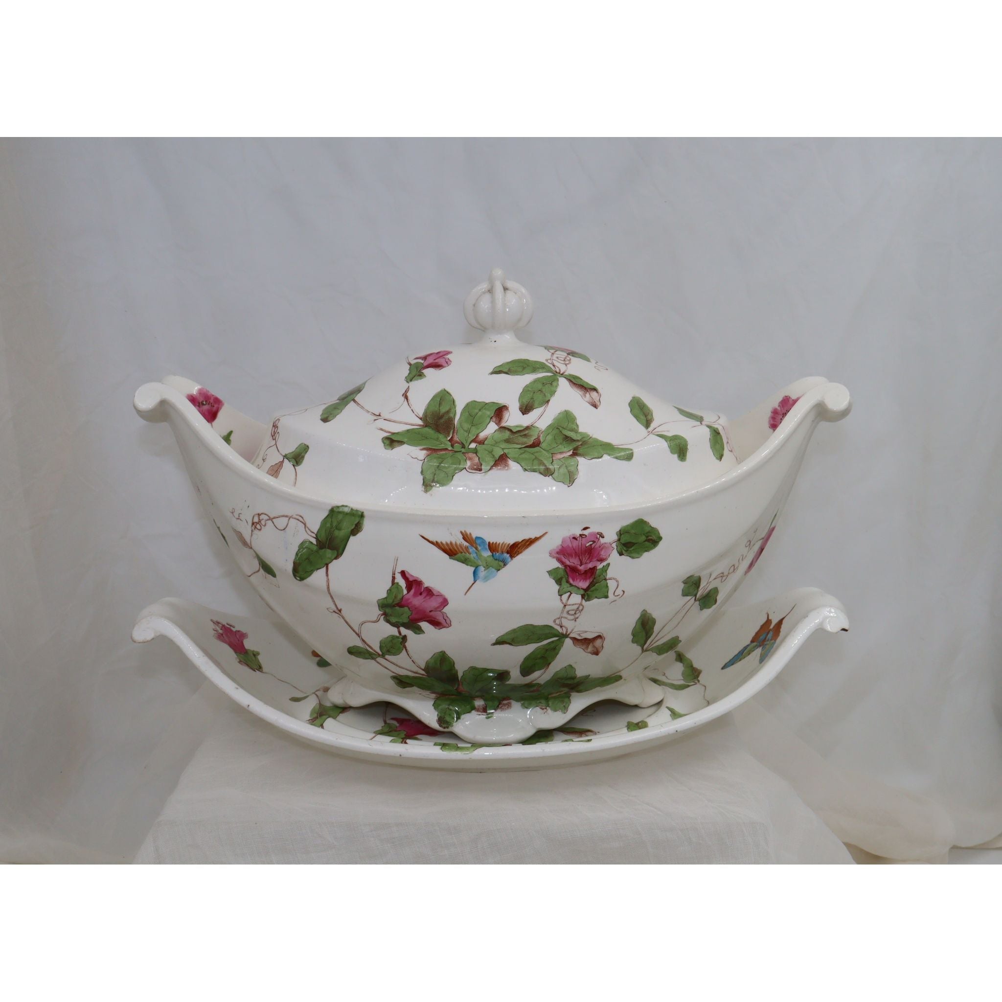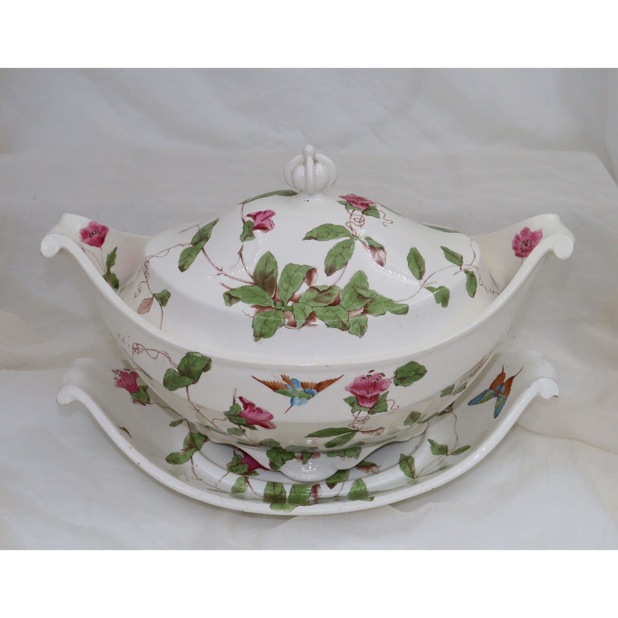 This large W T Copeland boat shaped, lidded soup tureen on stand, is decorated with a hand coloured printed pattern featuring climbing plants, flowers, hummingbirds and butterflies. Fittingly the name given to this shape of dinnerware is Venice, with the shape (Rd 143192) being registered on the 31st of January 1890. The pattern number is 2/3266 and the impressed date mark is for 1890. The overall height is 275 mm (10.75 inches), the depth 256 mm (10 inches) and the width 430 mm (17 inches)-quite an impressive piece. There are two small chips to the underside of one of the stand's handles and two smaller ones to the edge of the stand. There is also some crazing, and, as usually happens, the ladle has gone missing. Overall the condition is very good.