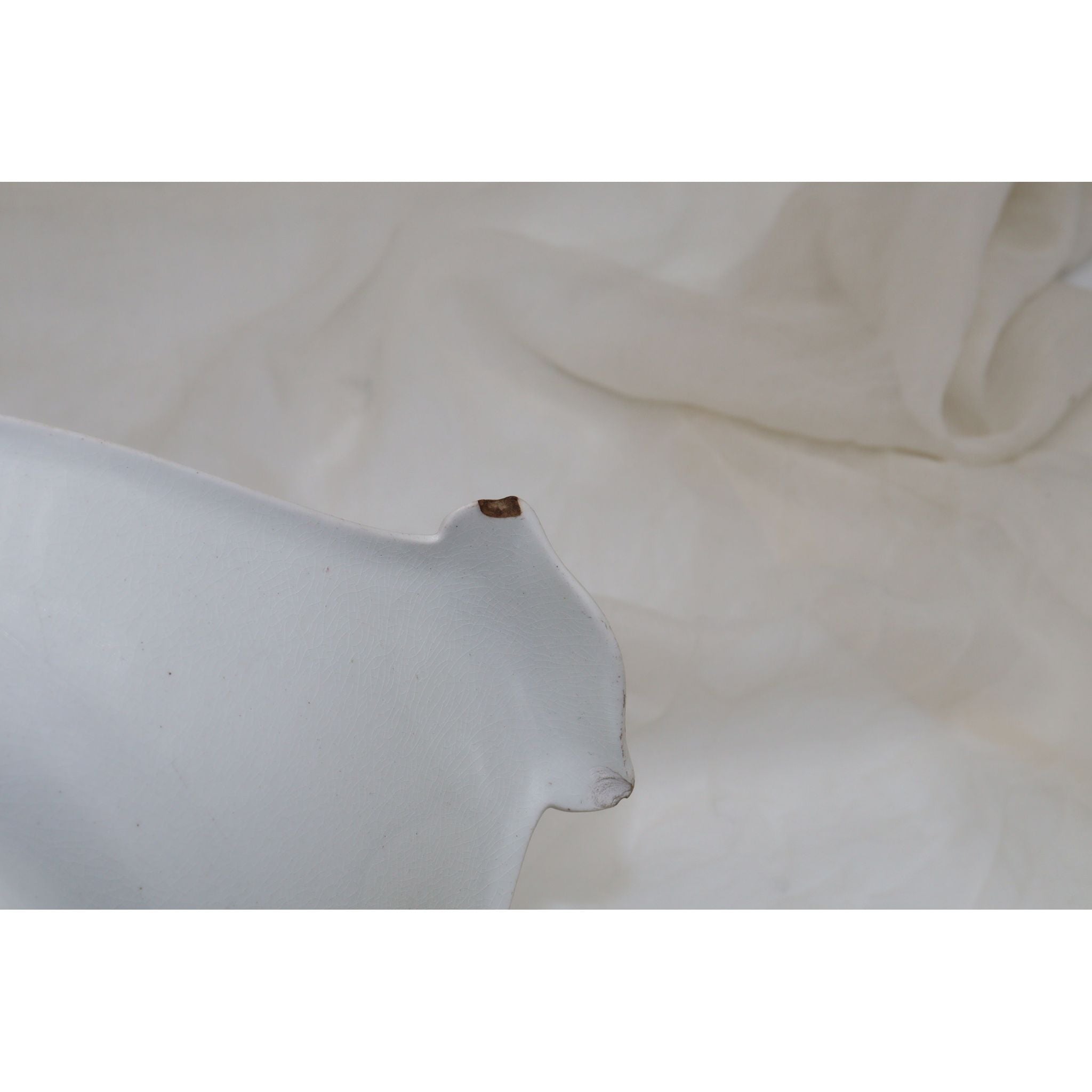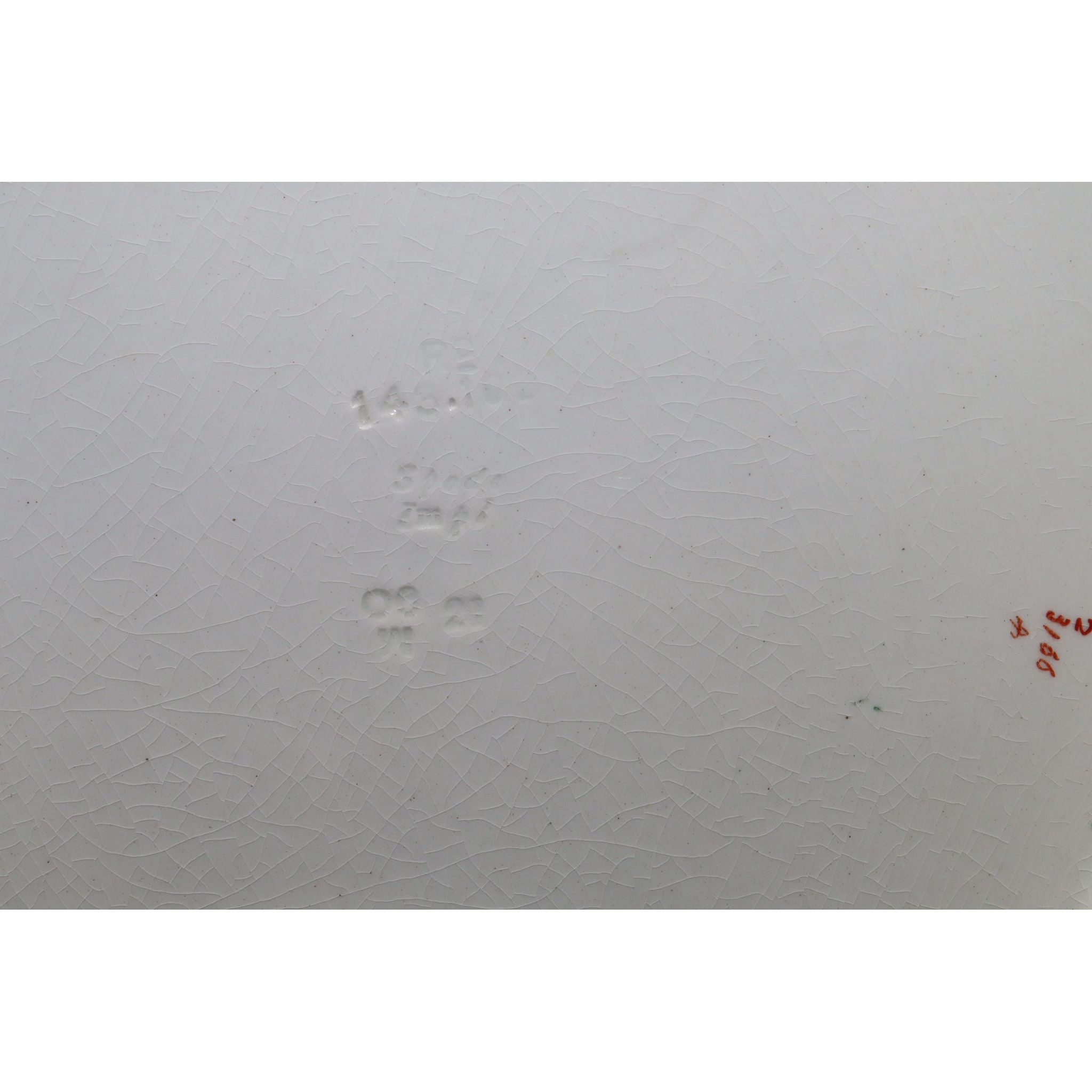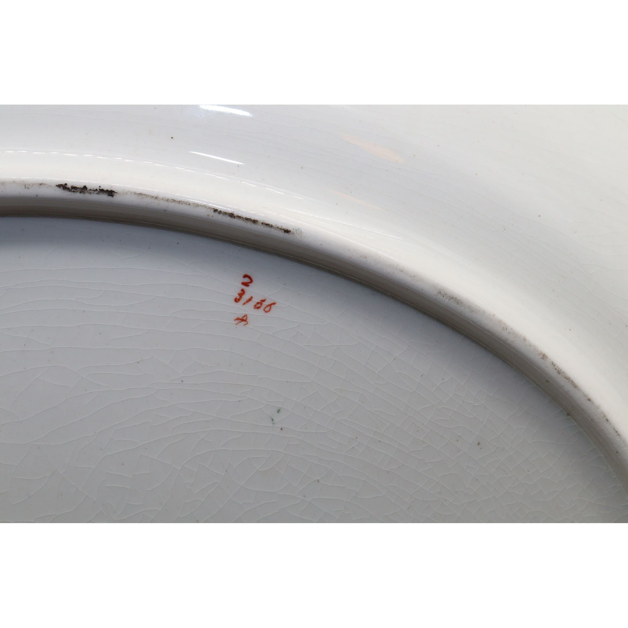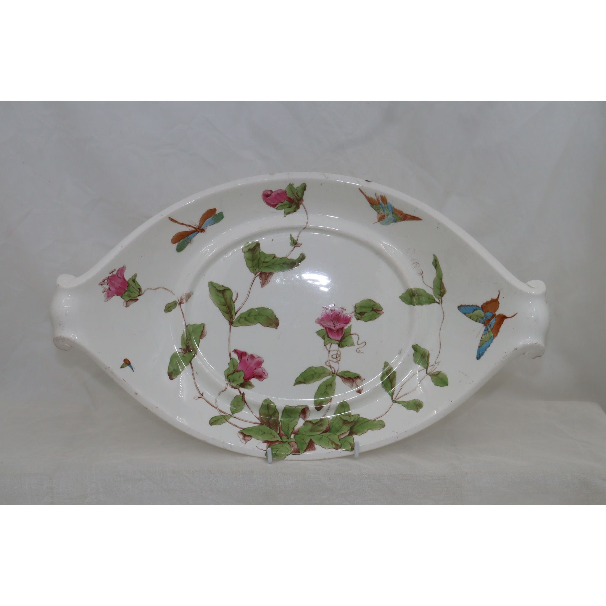 This large W T Copeland boat shaped, lidded soup tureen on stand, is decorated with a hand coloured printed pattern featuring climbing plants, flowers, hummingbirds and butterflies. Fittingly the name given to this shape of dinnerware is Venice, with the shape (Rd 143192) being registered on the 31st of January 1890. The pattern number is 2/3266 and the impressed date mark is for 1890. The overall height is 275 mm (10.75 inches), the depth 256 mm (10 inches) and the width 430 mm (17 inches)-quite an impressive piece. There are two small chips to the underside of one of the stand's handles and two smaller ones to the edge of the stand. There is also some crazing, and, as usually happens, the ladle has gone missing. Overall the condition is very good.