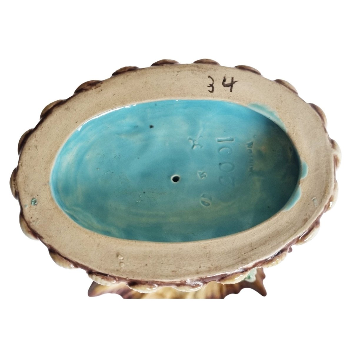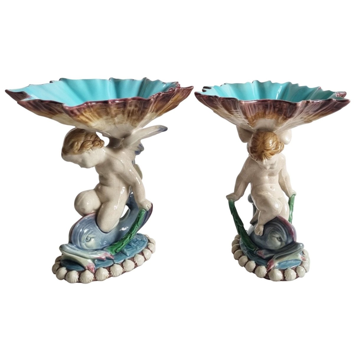 A pair of Minton Majolica dolphin & cherub dishes - MAJ 49