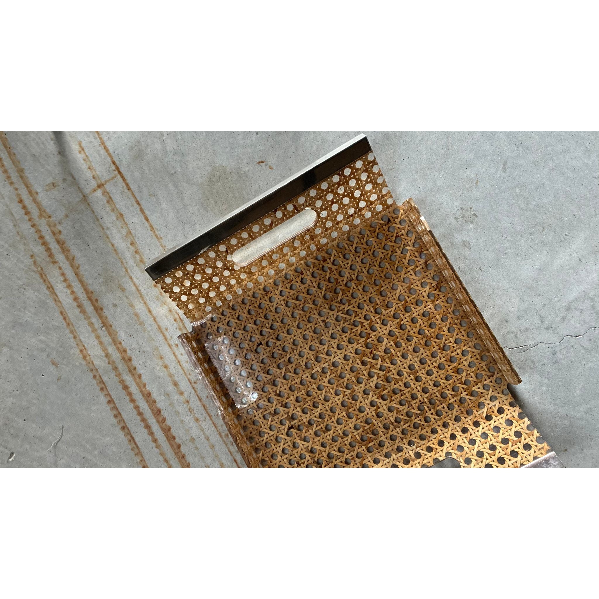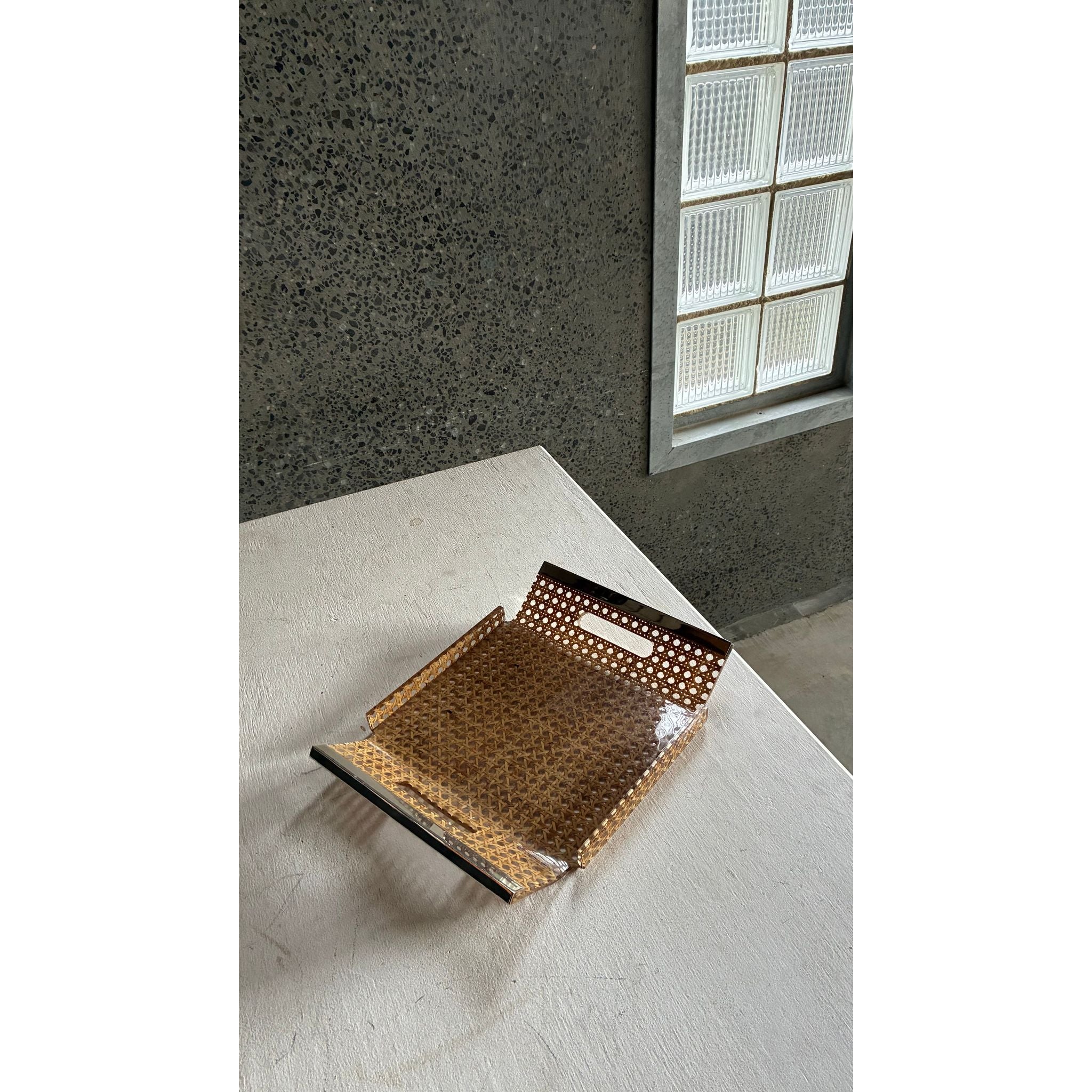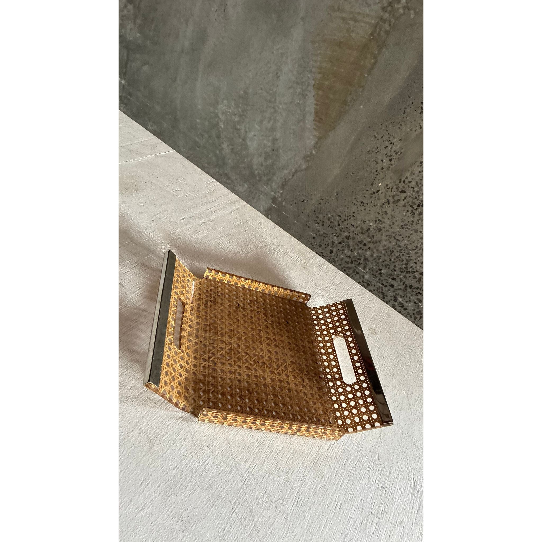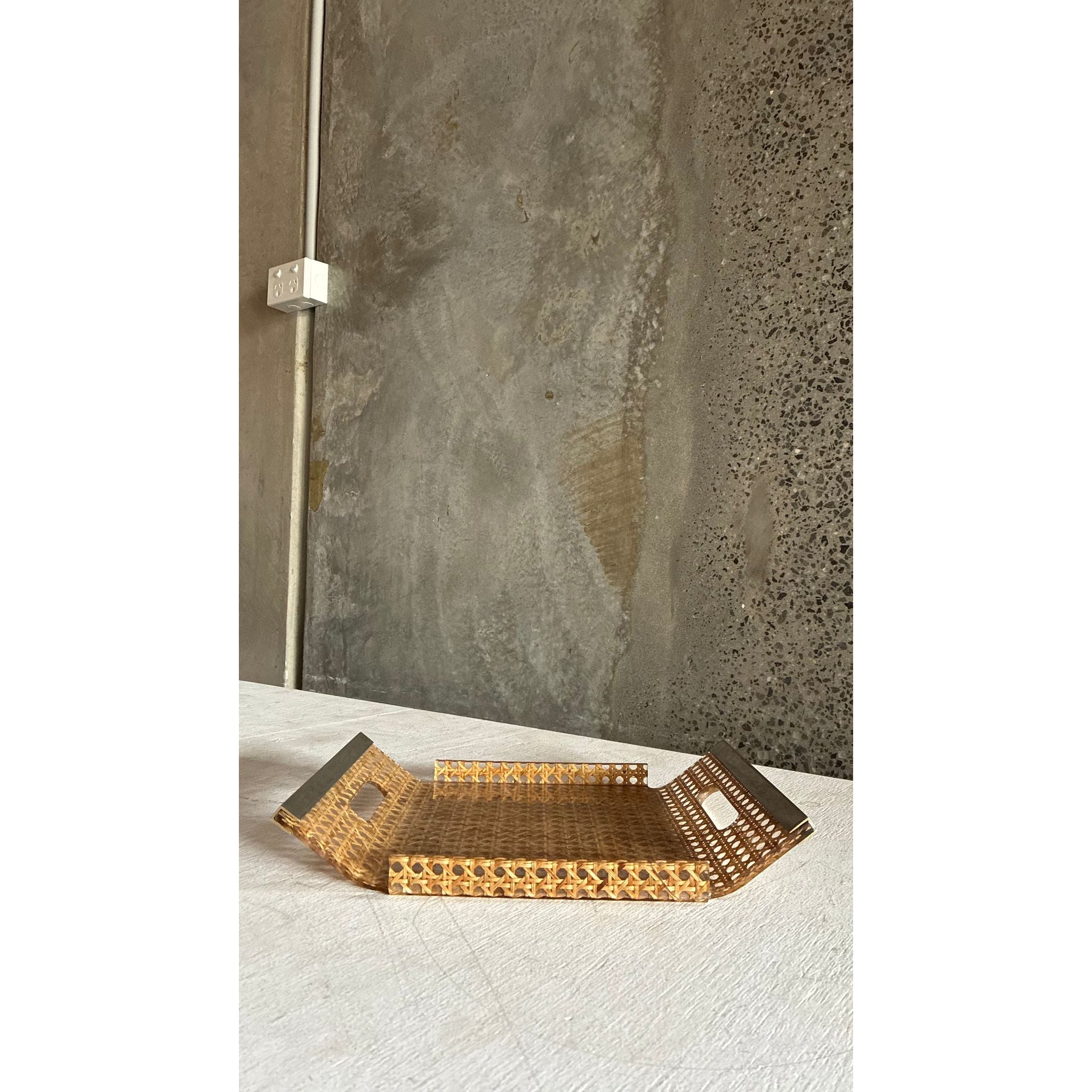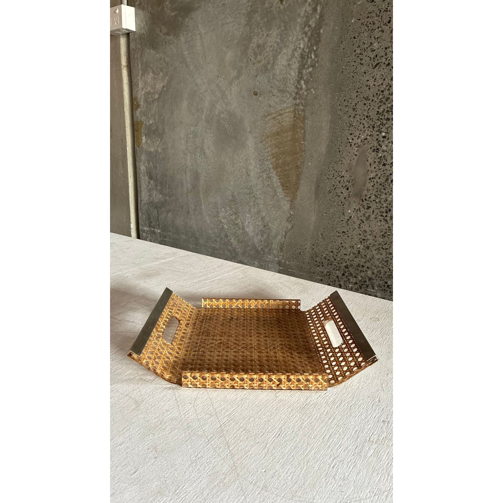 A refined French tray from the 1980s, crafted in woven cane with a clear plexiglass frame and integrated hand-cut openings trimmed in brass. The mix of warm natural fibre and crisp acrylic gives it that light, modern decorative language seen in French design of the era: understated, airy and effortlessly elegant.