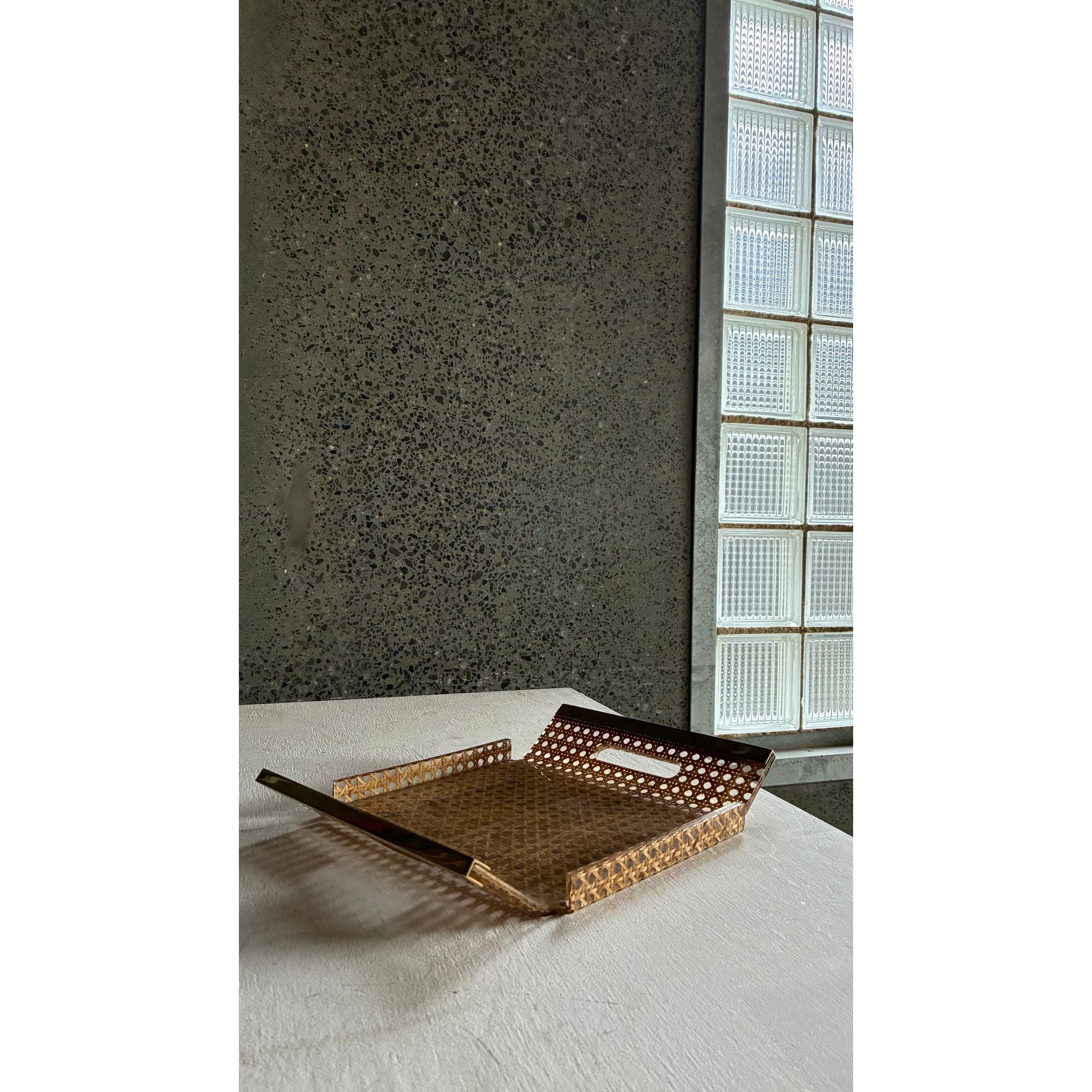 The form is simple; a clean rectangular profile, gently raised edges and a beautifully woven rattan base that brings texture without heaviness. A versatile styling piece for consoles, bedside tables or bar settings.
