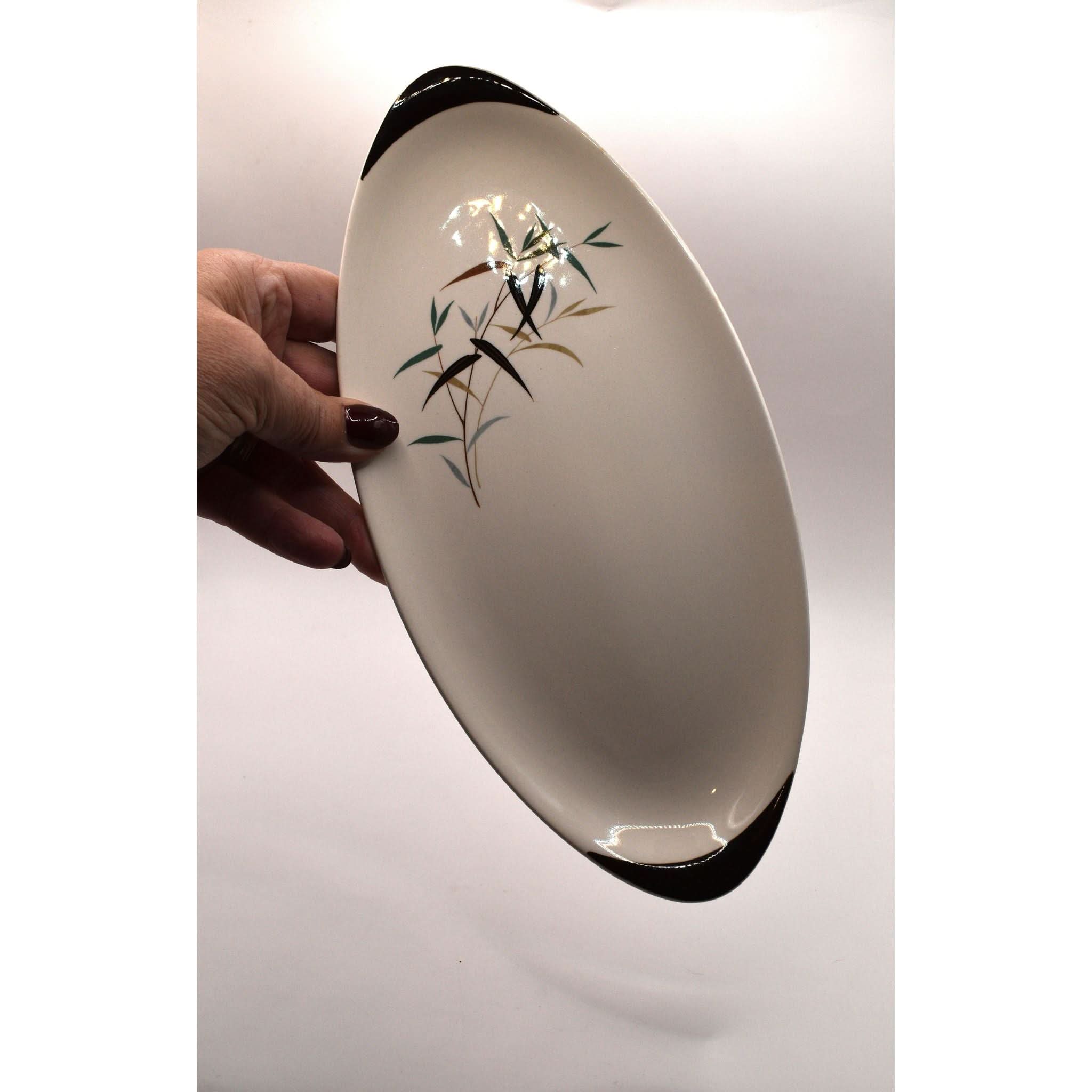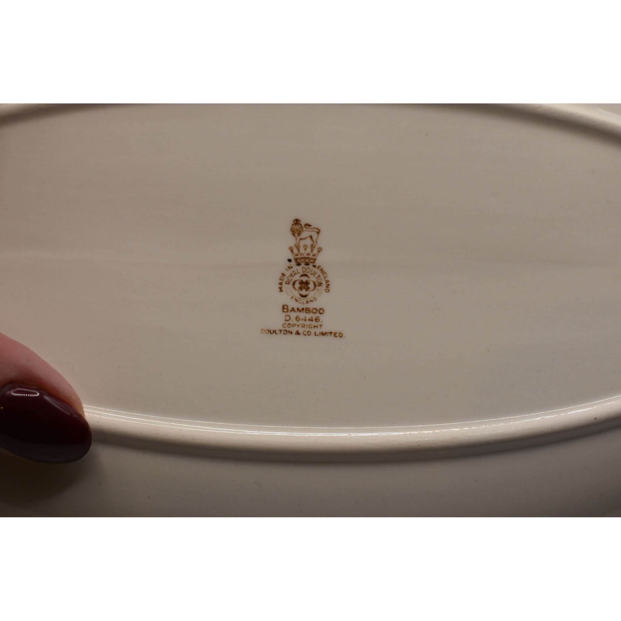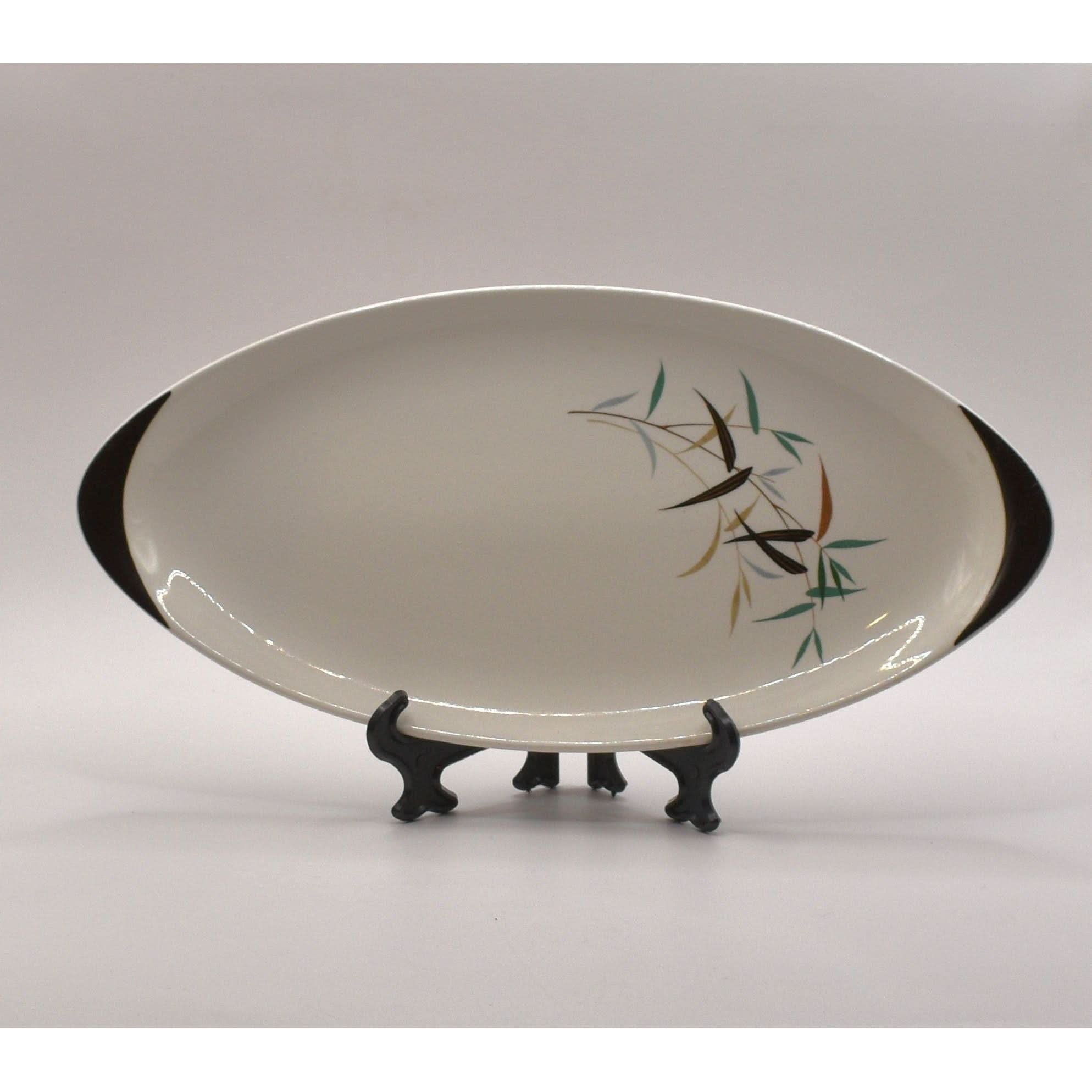 This charming small platter from the mid-20th century brings a touch of vintage elegance to your table. Crafted from smooth white ceramic, it showcases a delicate bamboo motif with leaves and stems in earthy greens, browns, and blacks. Its clean, minimalist design perfectly captures the timeless style of Royal Doulton’s classic tableware. Whether serving appetizers or displaying treats, this platter adds a playful yet sophisticated flair to any dining setting, making every meal feel a little more special. A delightful piece for collectors and everyday use alike!