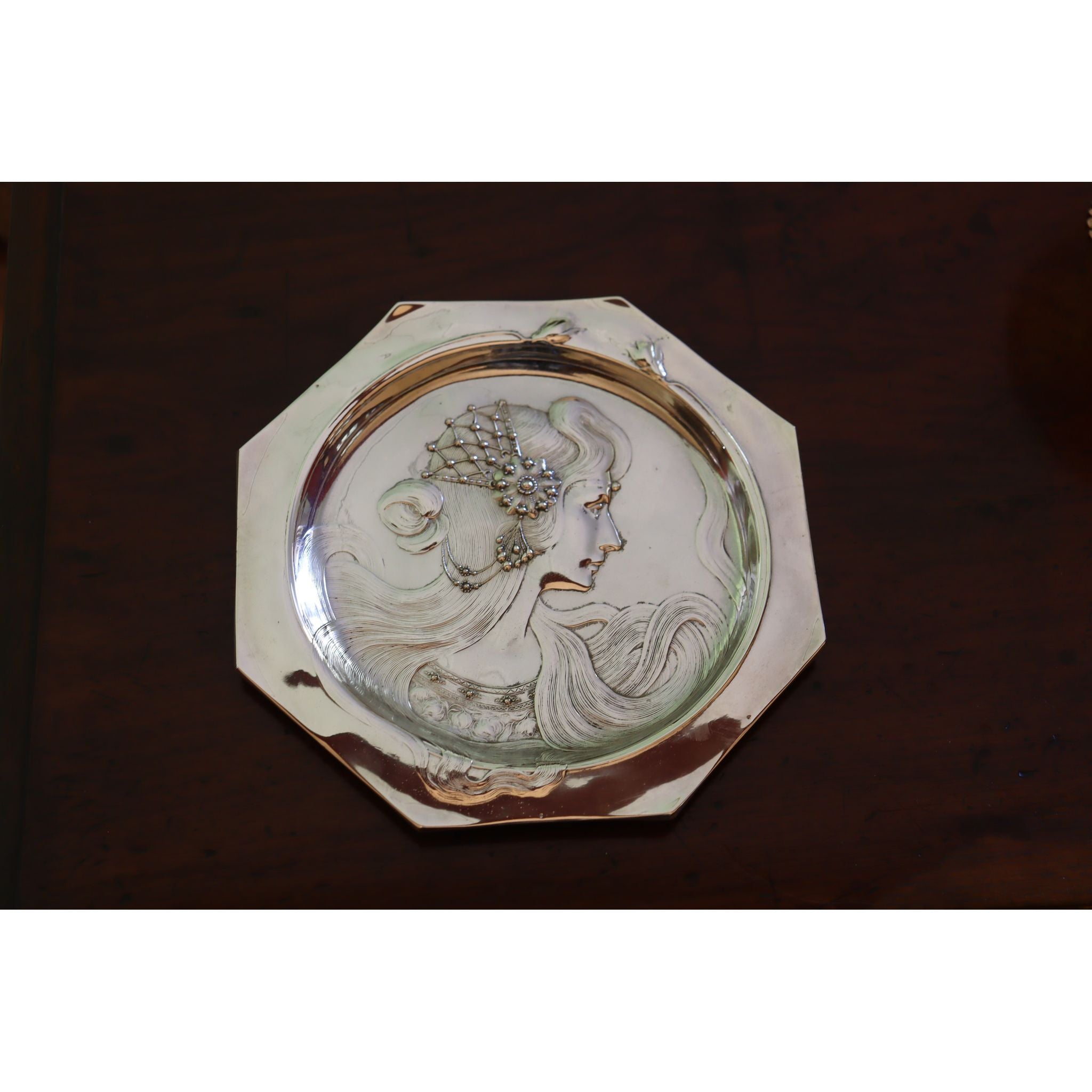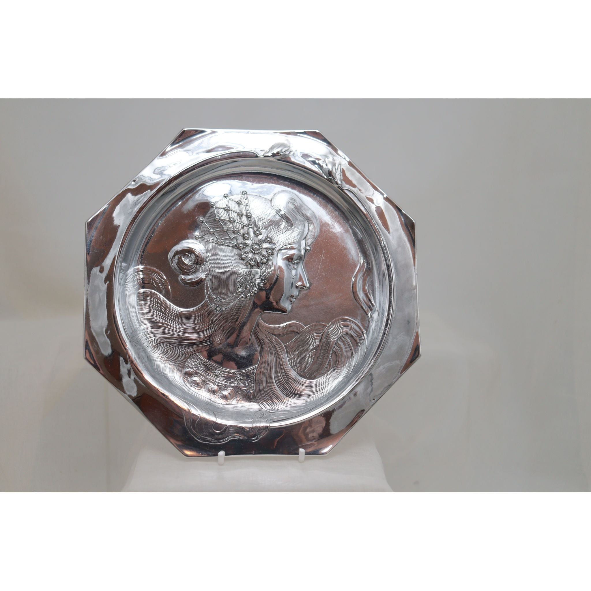 This unmarked octagonal WMF visiting card tray is shown in the WMF English catalogue for 1906 as model 190a. It is shown on page 169 of the reprint issued by the Antique Collectors Club in 2008 and its original price was 10 shillings. Its decorative features are quintessentially Art Nouveau (known as Jugendstil in Germany) with stylised flowers and a young woman with long flowing hair. On her head she wears a detailed and intricate head piece, and her bodice is equally detailed. The tray would have sat on a table in the hallway, near the front door. When visitors called, their visiting (also called calling) cards could be left on the tray, for when the occupants returned, or if they were home, then the tray would be carried to them by a servant. It measures 216 mm (8.5 inches) across and stands 13 mm (.5 of an inch) high. It was resilvered several years ago, and is in very good condition. C1906.