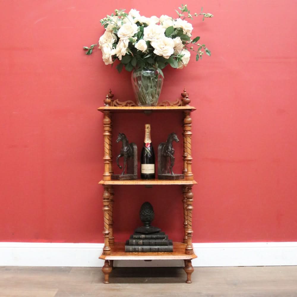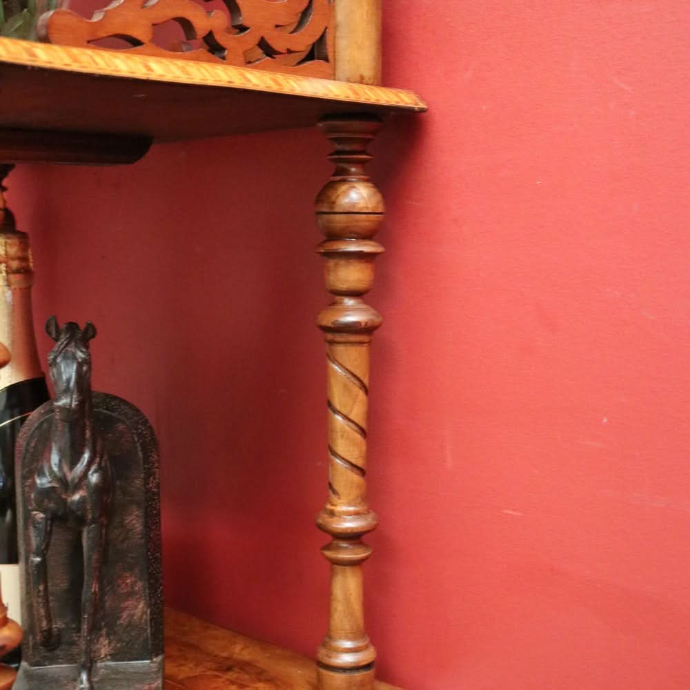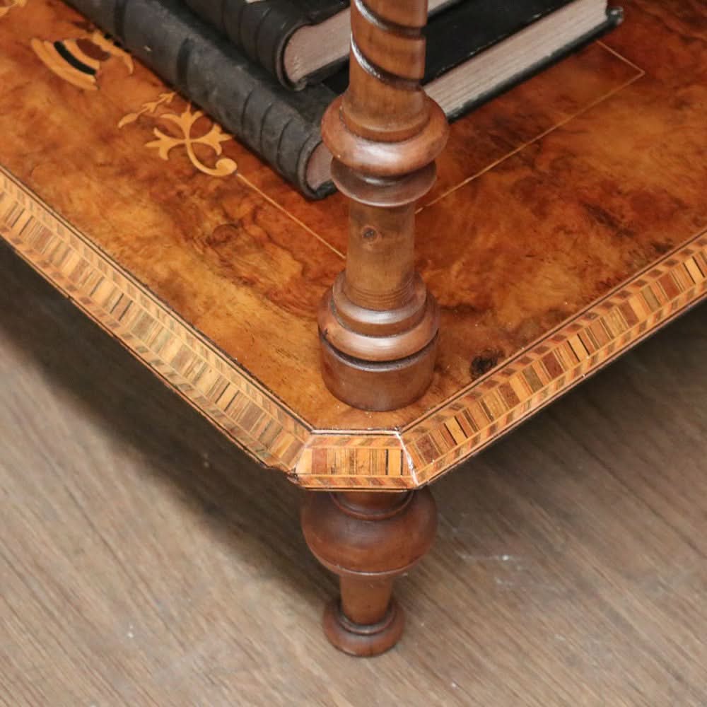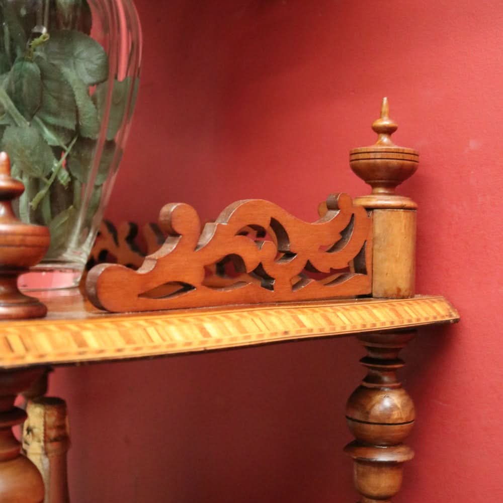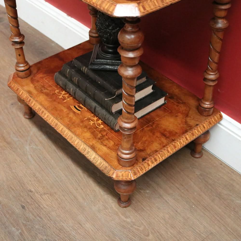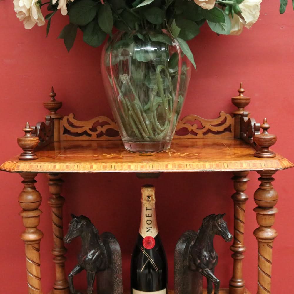 Description: This Antique English Walnut What Not is a versatile and elegant piece for displaying plants, collectibles or decorative items. The stunning spiral carved columns turned finials, and marquetry inlay adds a touch of sophistication to any space. The Tunbridge ware pattern on each tier adds a unique and intricate detail.