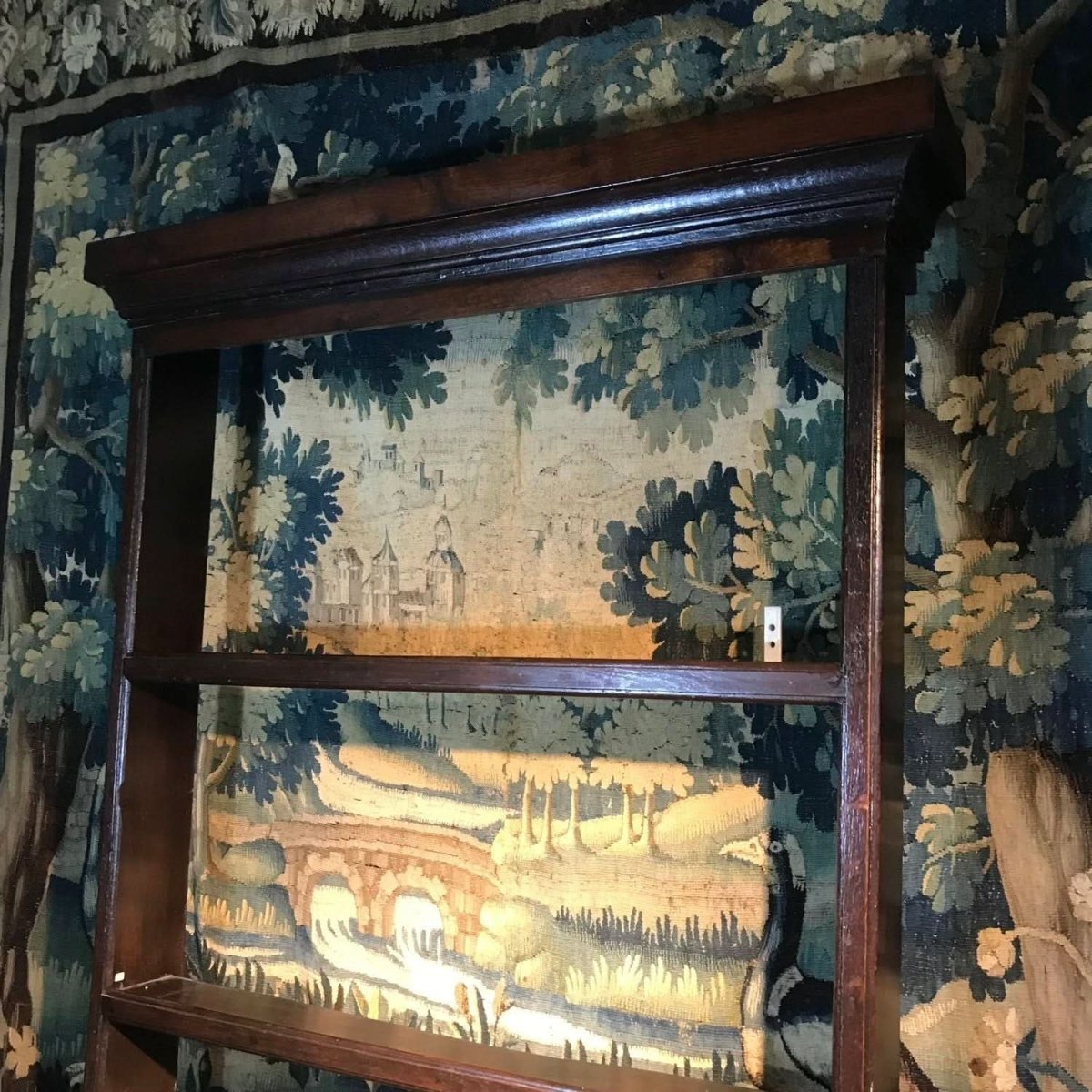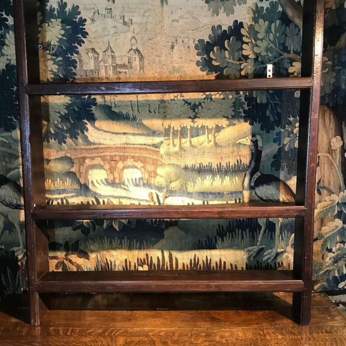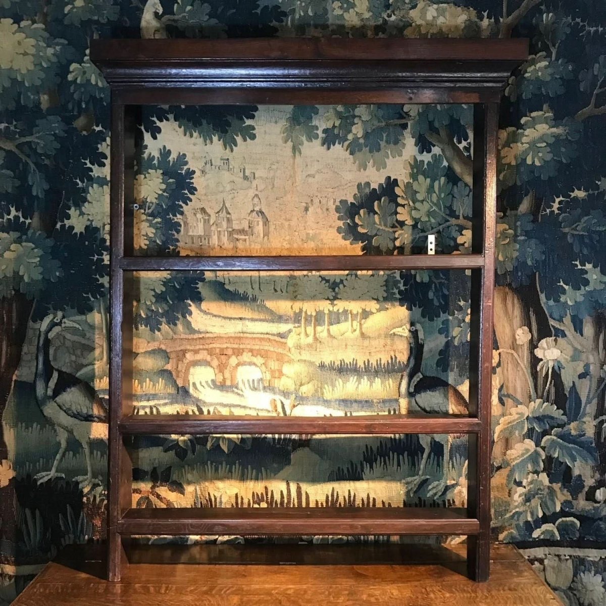George III oak hanging dresser rack of simple form, with a pediment above three shelves.