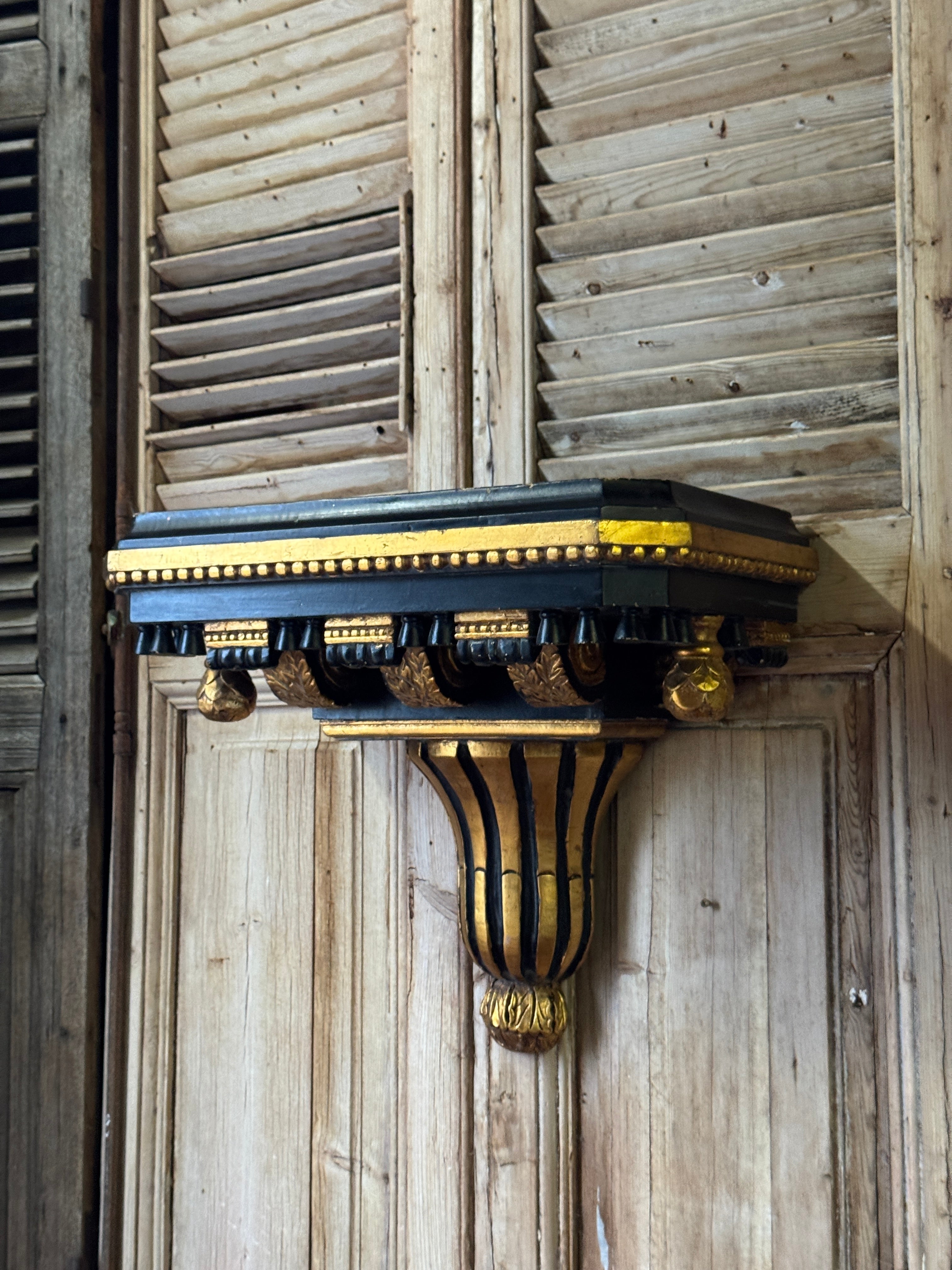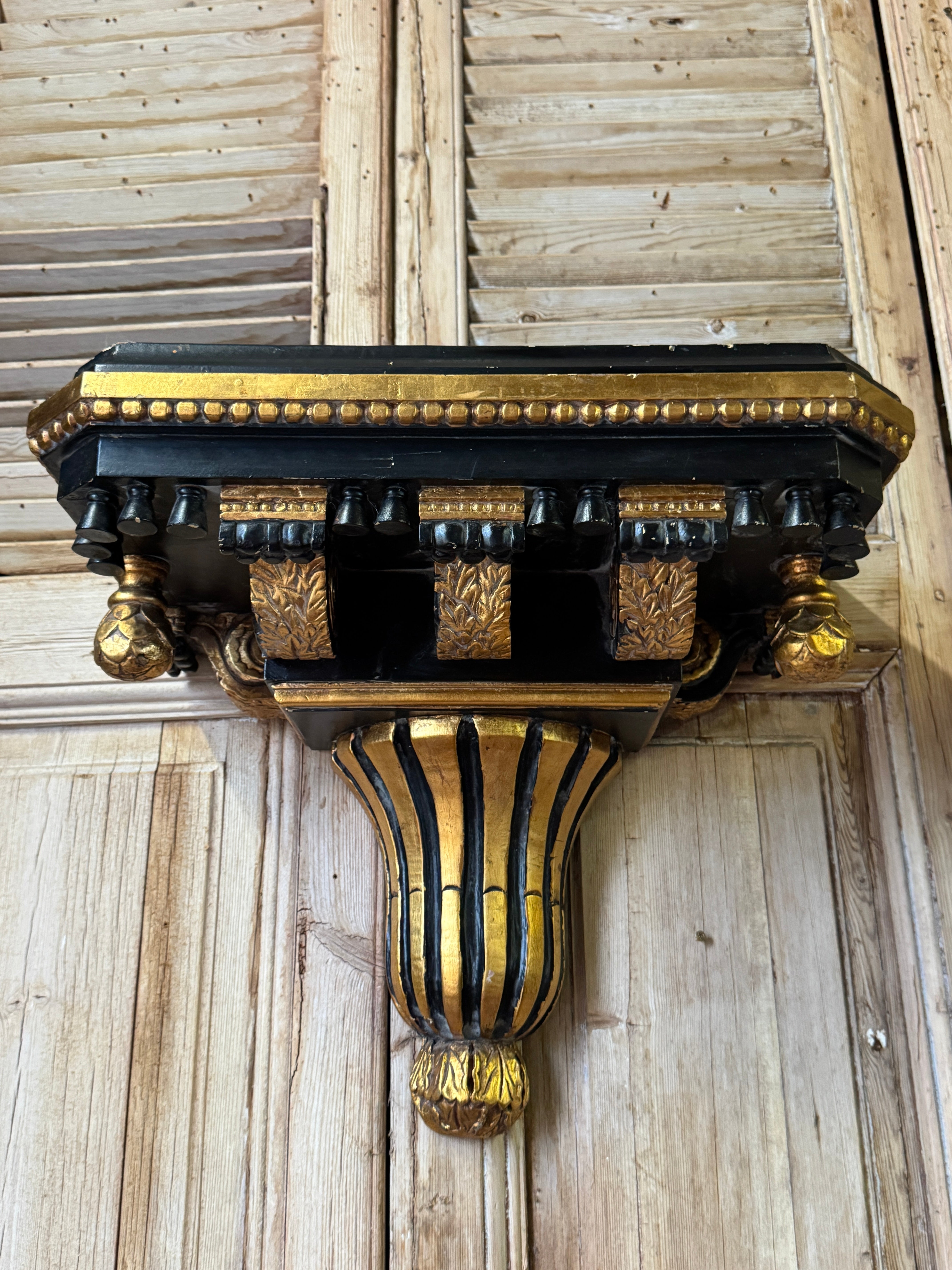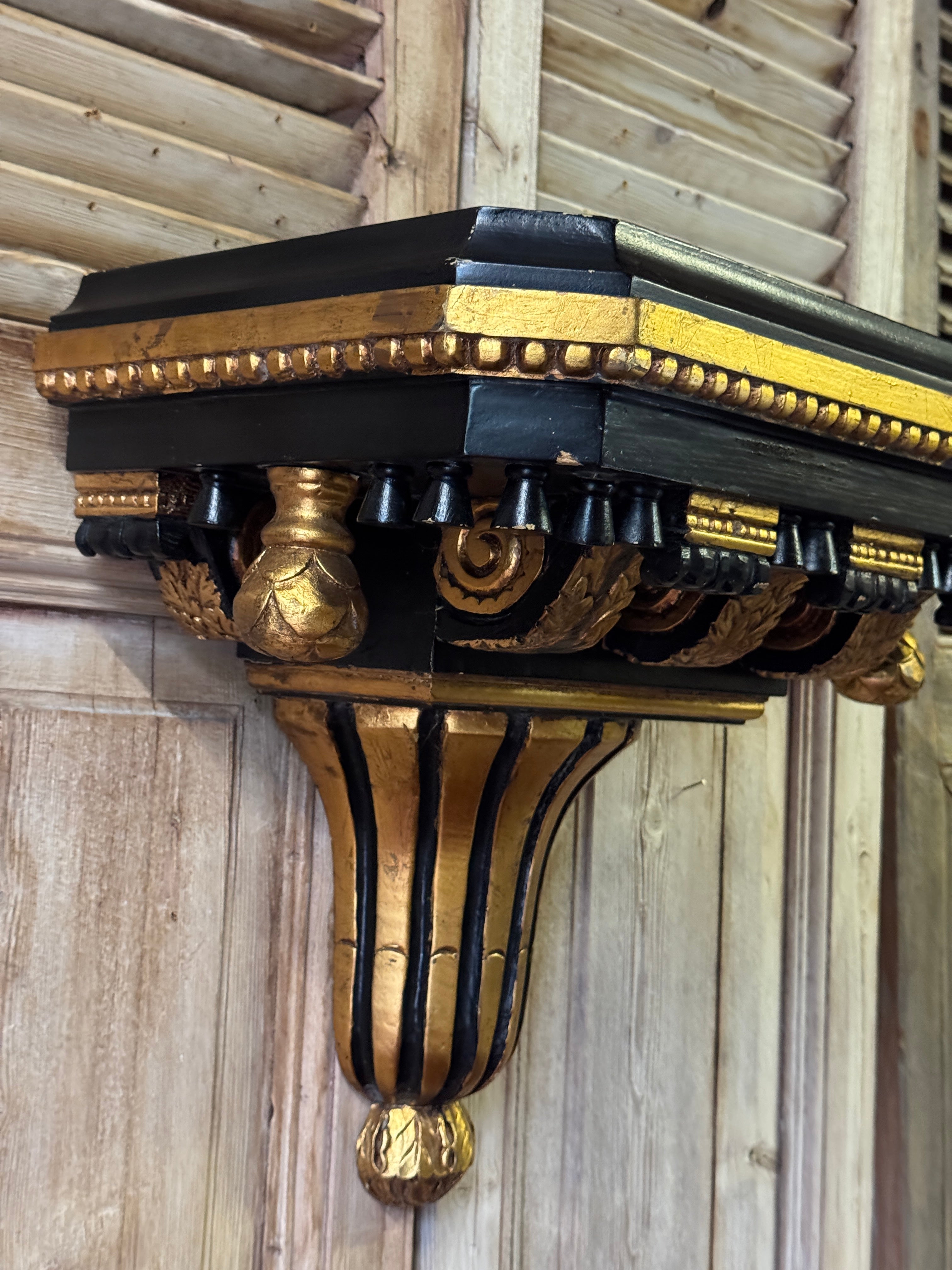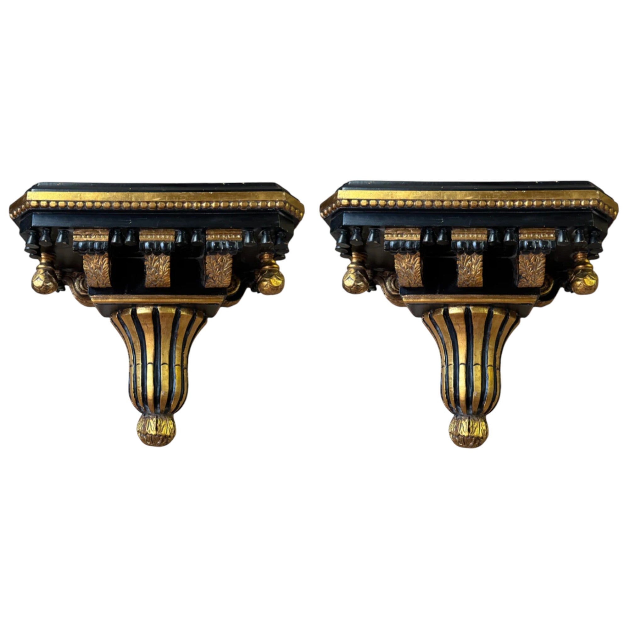 A substantial pair of vintage neoclassical wall brackets, crafted in timber with composite and gesso detailing and finished in a classic black and gilt scheme. Designed with a generous flat top, they function equally well as decorative corbels or practical wall shelves. The detailing includes dentil moulding, carved foliate blocks and fluted supports, all terminating in a rounded gilt drop. Being larger in scale than most wall shelves, they’re ideal flanking a mirror, artwork or doorway, or styled with objects, busts or lighting. Signs of wear consistent with age. Sold as a pair.