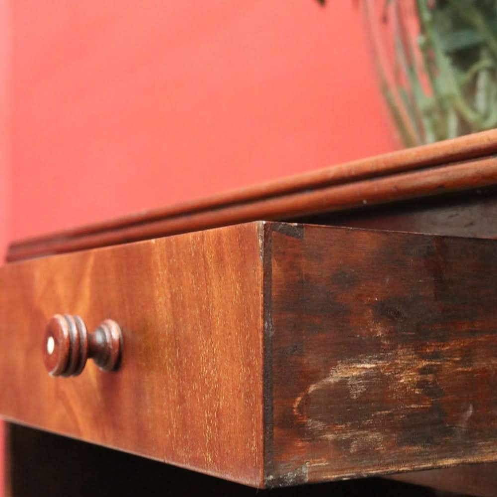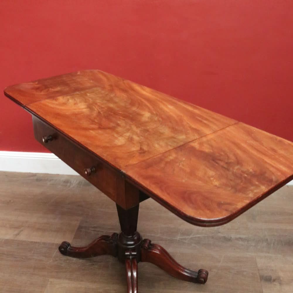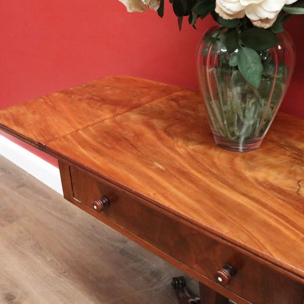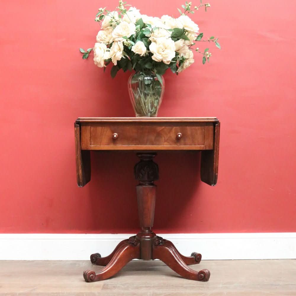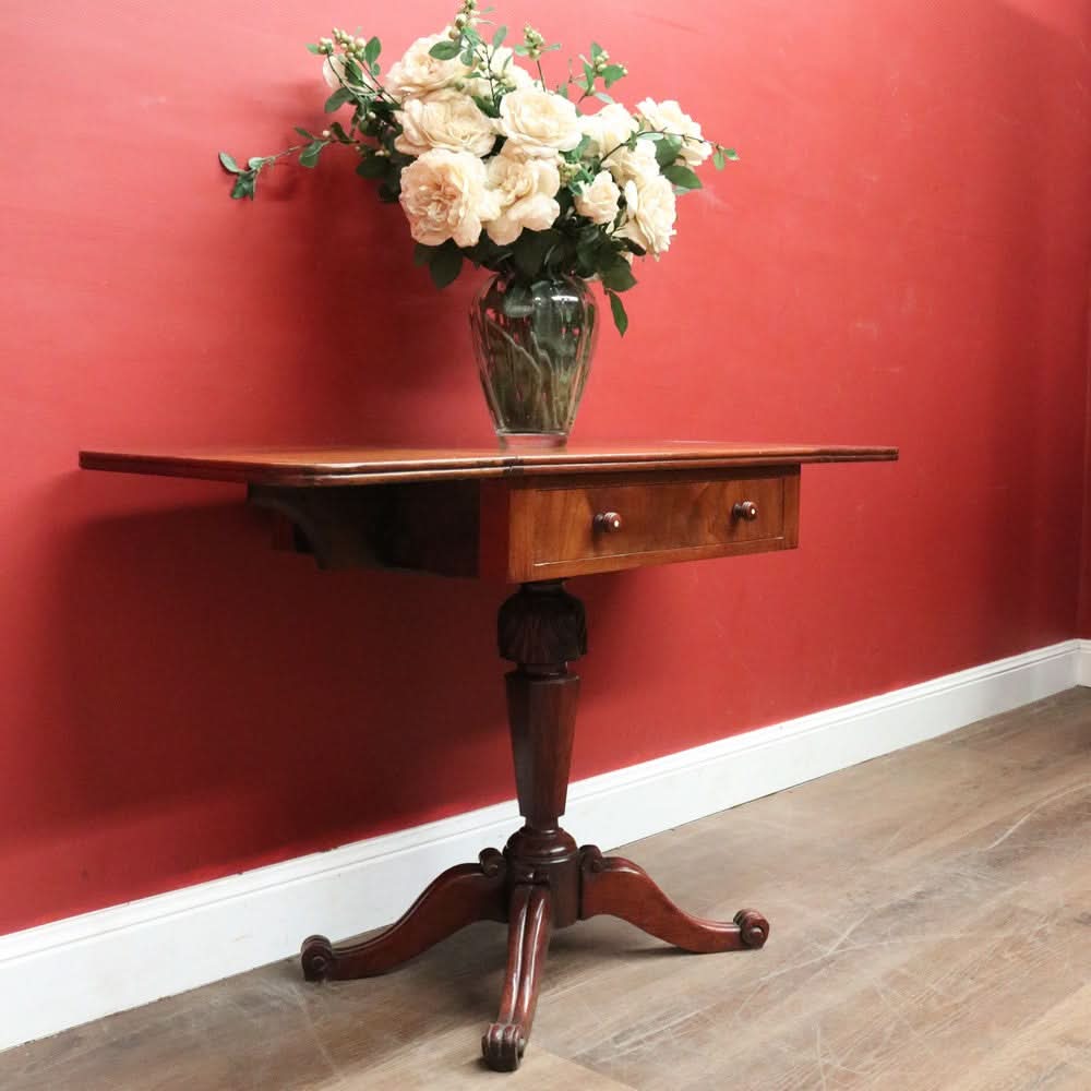 Description: A beautifully proportioned antique English Pembroke table, perfect as a freestanding piece in a living room, entryway, or study. This versatile table is designed for centre-of-room display, featuring elegant drop sides, a single functional drawer to the front, and a faux drawer to the rear. The tapered pedestal base stands gracefully on four splayed legs, offering classic Georgian-inspired styling with timeless appeal—ideal as a writing table, side table, or hallway feature.