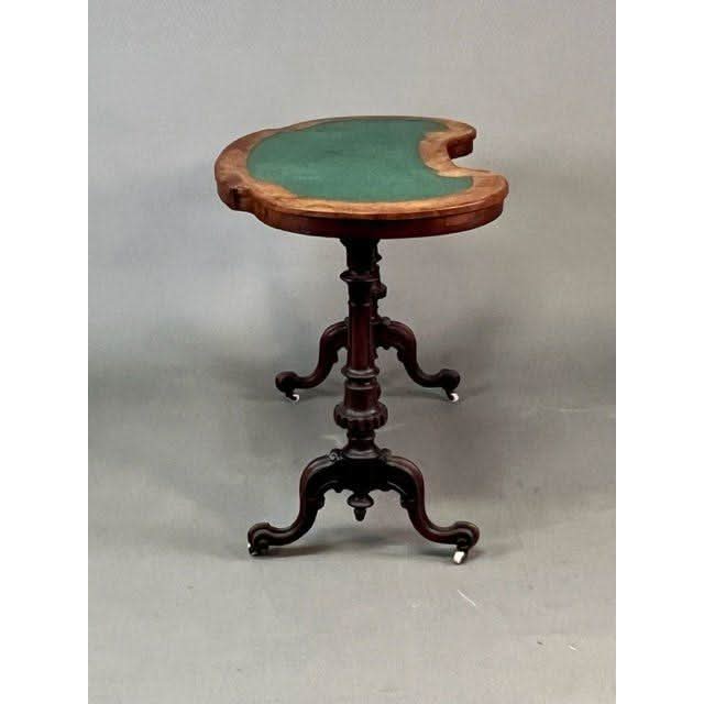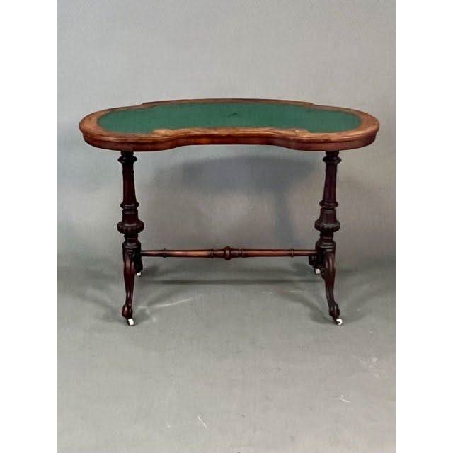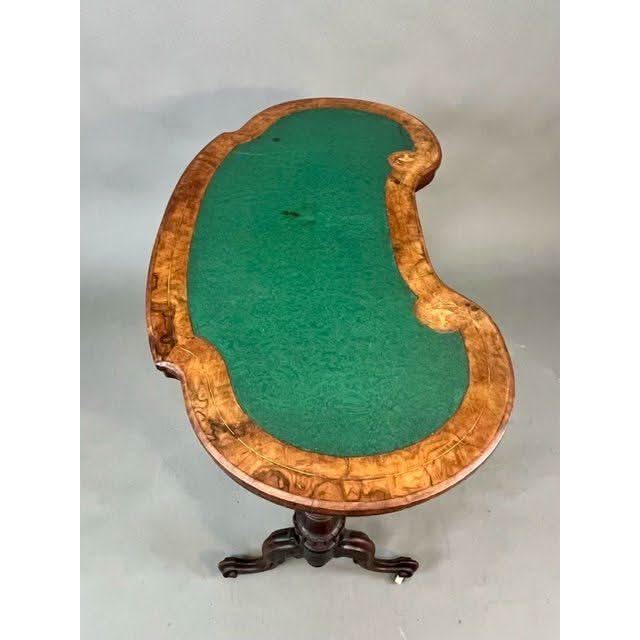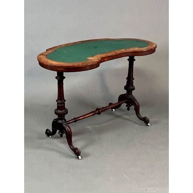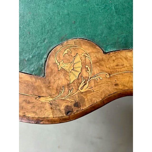This is a rather nice Writing Table that could also be used as a Side Table. The top is basically ‘kidney’ shaped with a green leather inset writing surface surrounded by a honey coloured well figured Walnut burl which is embellished by a fine line inlay and two good stylised flower vine and leaf marquetry inlays in Satinwood or a fruit wood..
