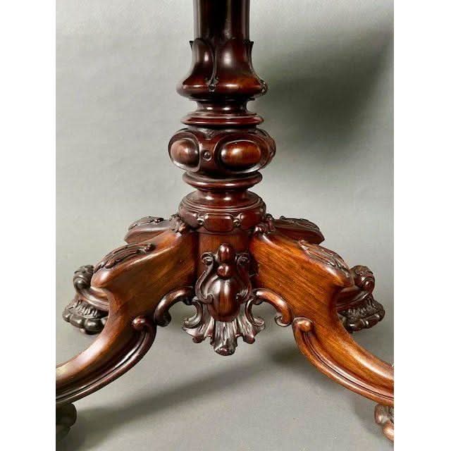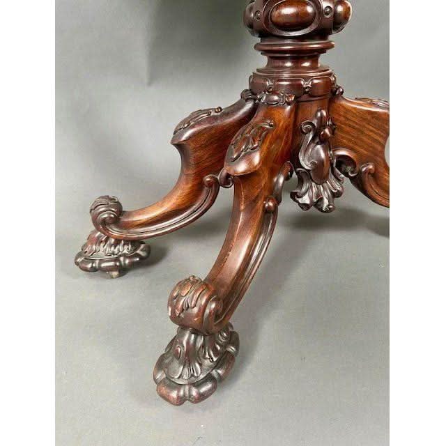 The central column is extremely well turned from solid Rosewood and is highly profiled and beautifully carved. Below the column is a cylindrical upright base from which four Shaped and tapered cabriole legs flow and these are embellished with raised carvings on the top of the knees and lower ‘C’ shaped scrolls terminate in upward scrolled carved toes. Beneath are bold and beautifully carved feet with the original all brass castor assemblies beneath.
