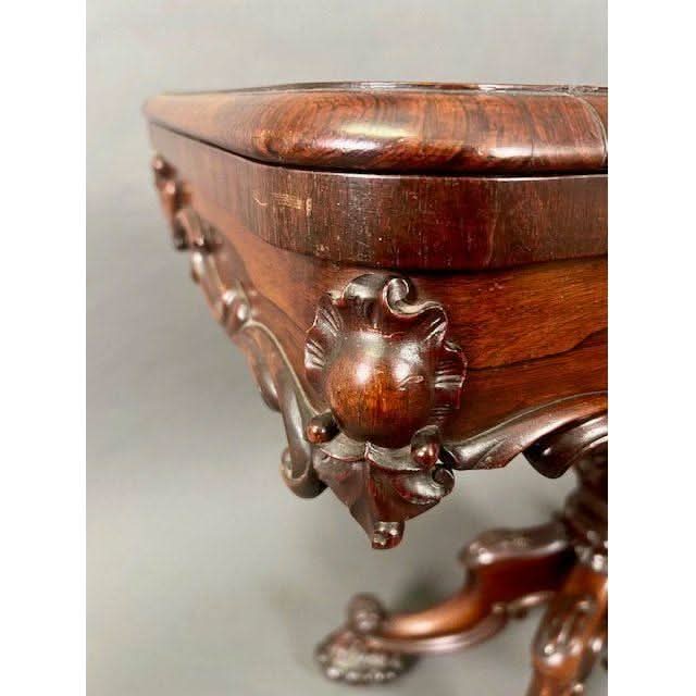 The rectangular top section has curved front corners and swivels then folds over so as to rest on the frieze or apron section which also provides storage for cards and other games. The inner Rosewood surface has a circular inset woven cloth playing surface.