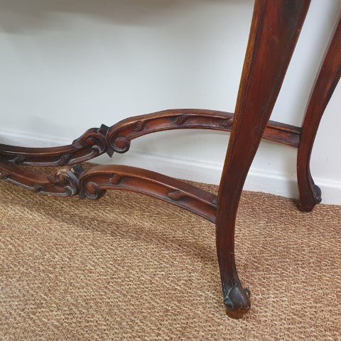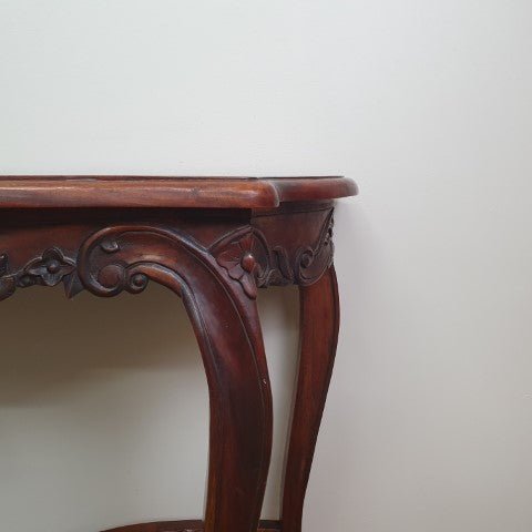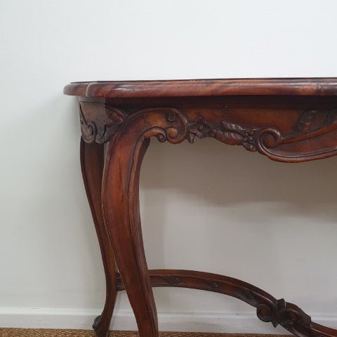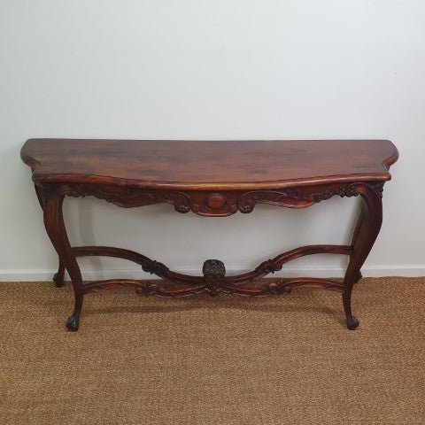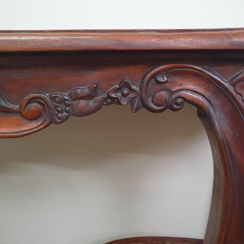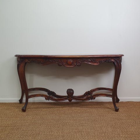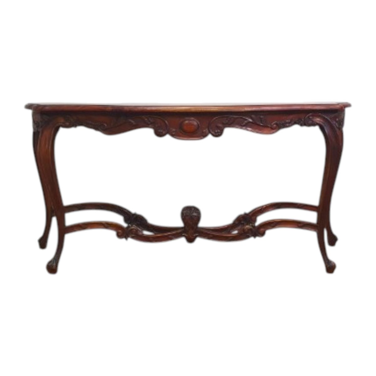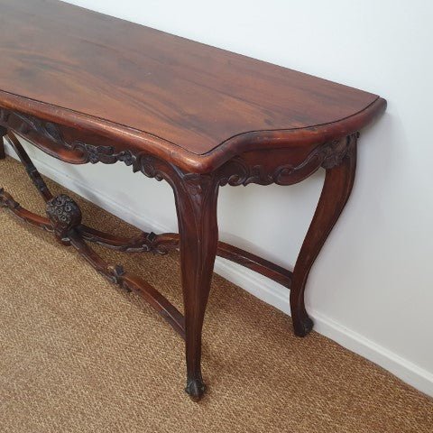 This carved mahogany long side table features Louis XV-style design with ornate detailing and cabriole legs. Its rich timber tone and elegant carvings make it a decorative statement piece for hallways, living areas, or bedrooms, complementing traditional and eclectic interiors.
