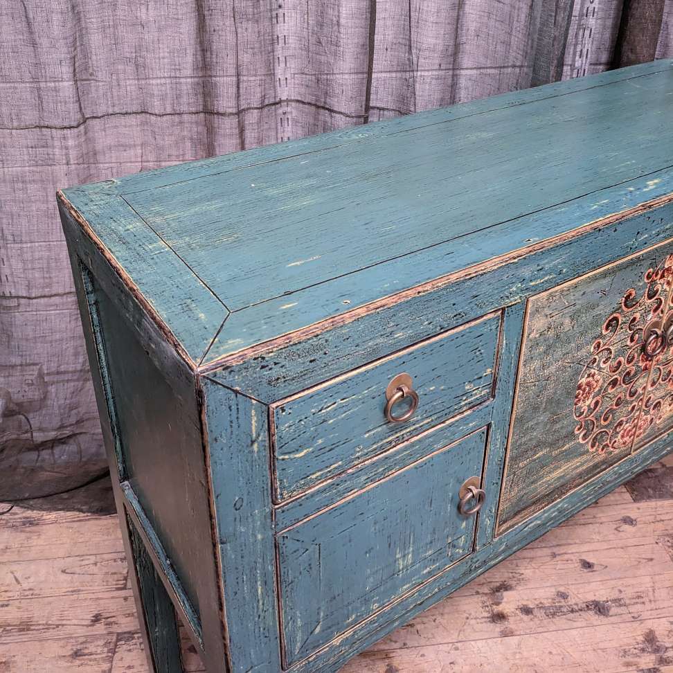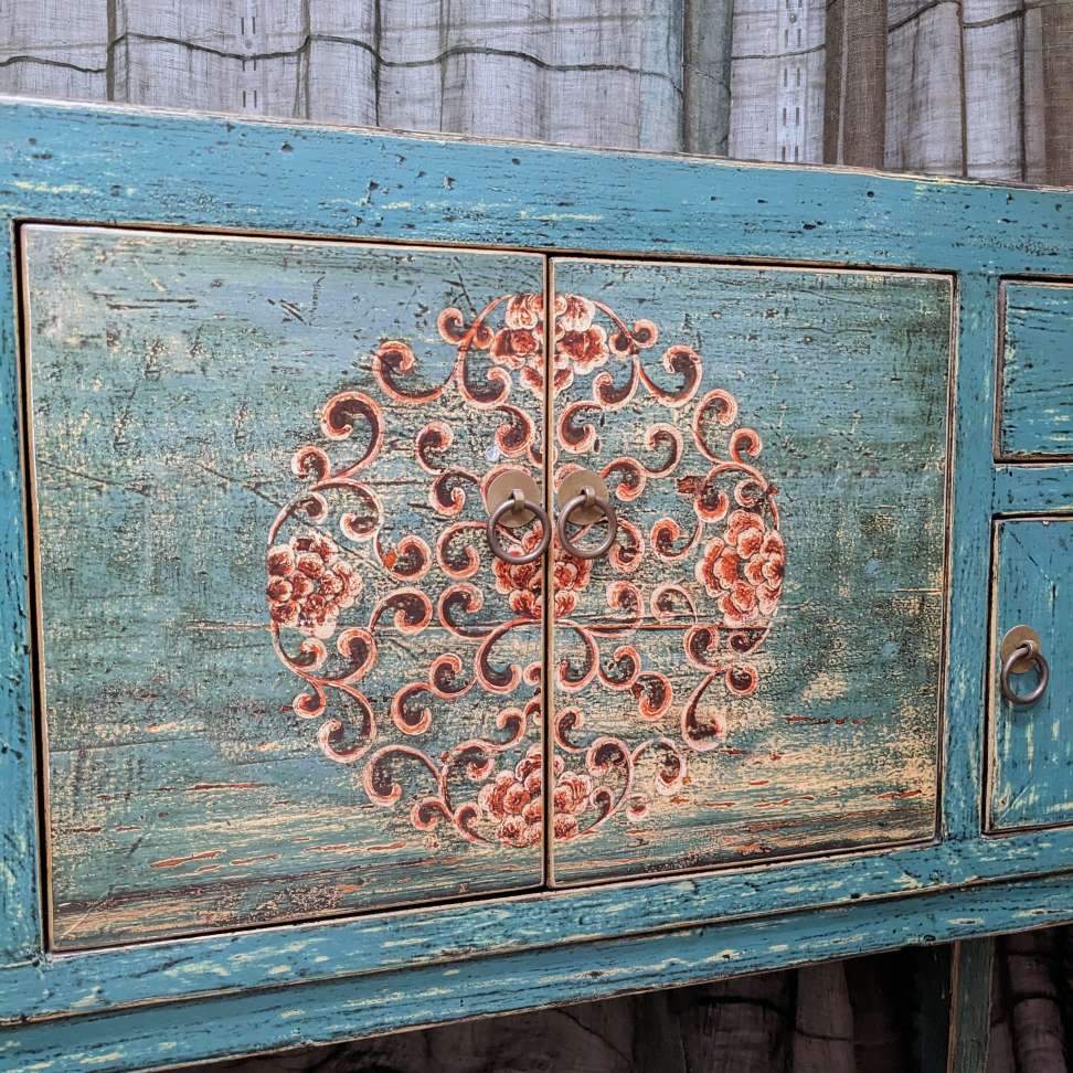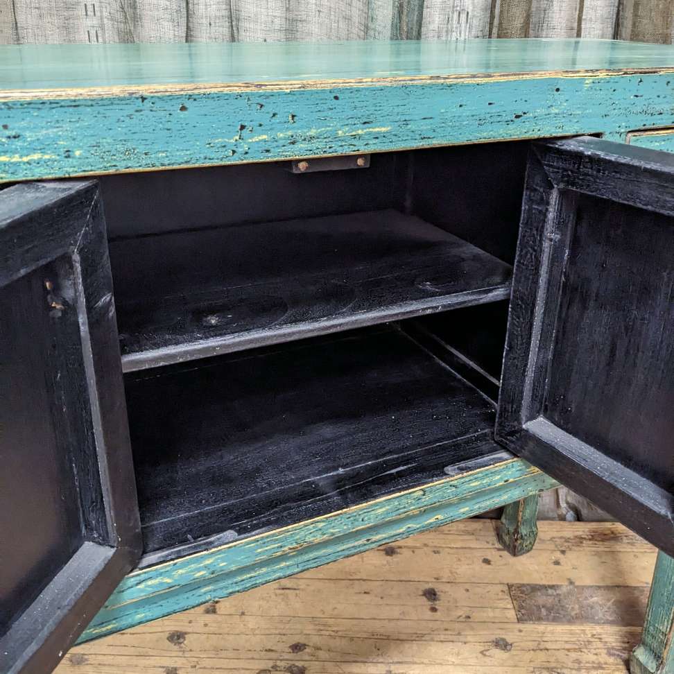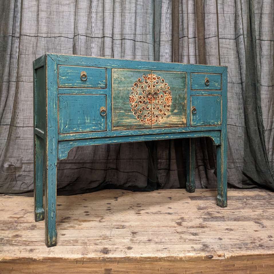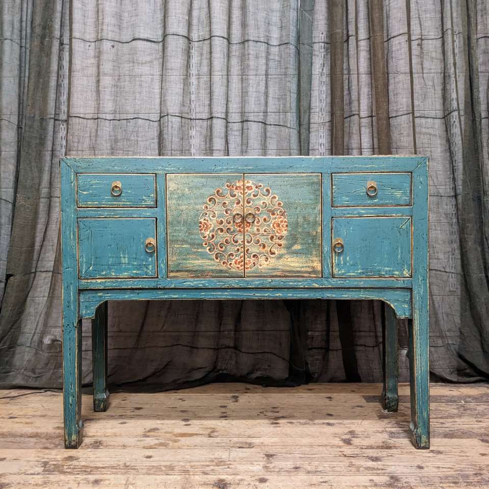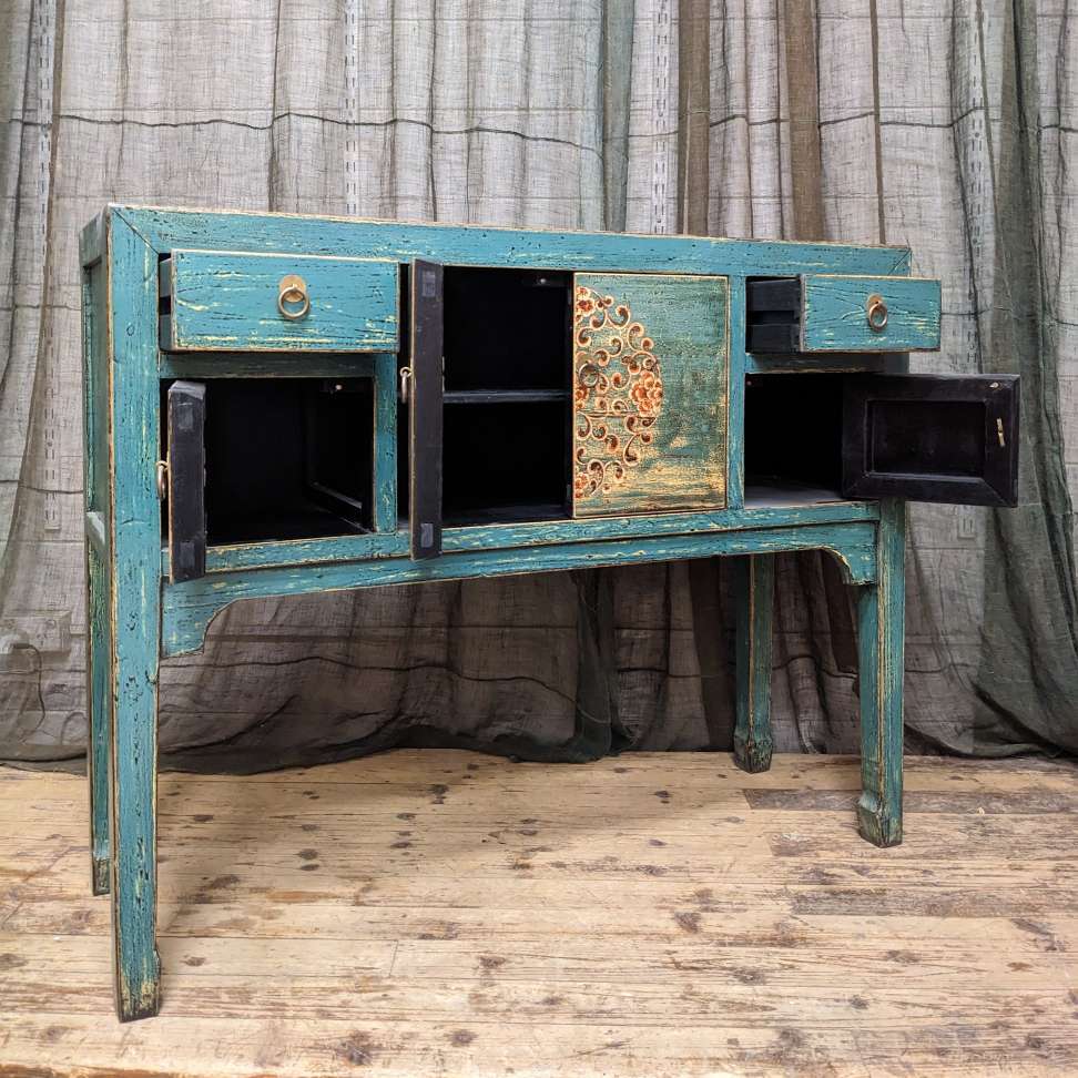 A provincial style chinese lacquered hall table, with an array of doors and drawers.