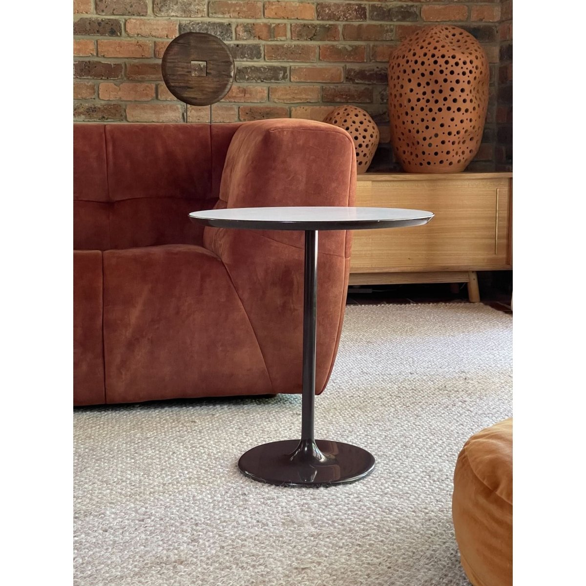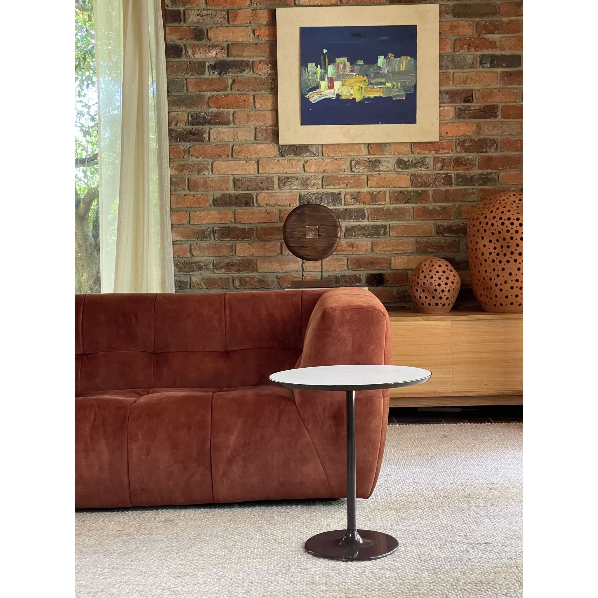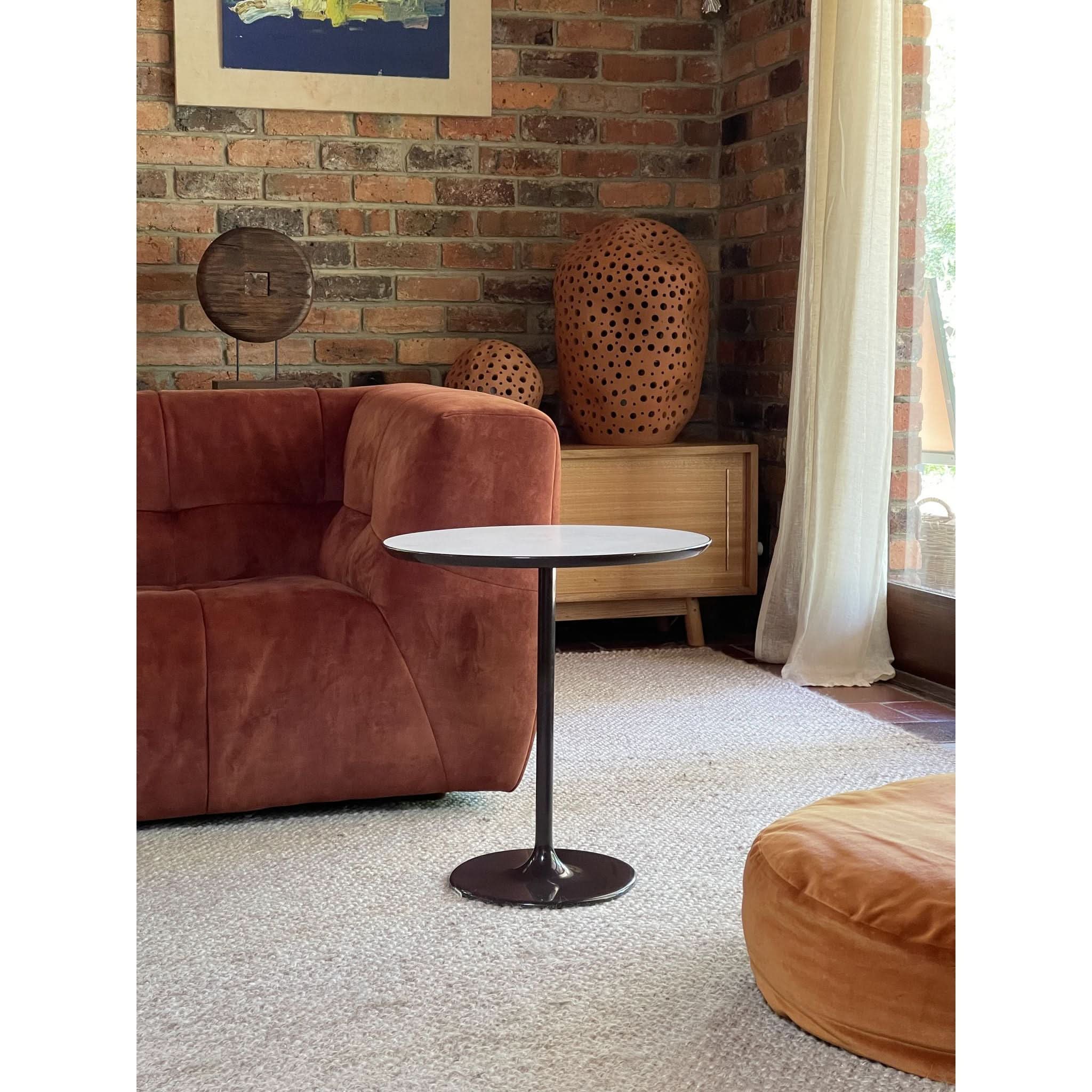 Dizzie side table designed by Lievore Altherr Molina for Arper, manufactured in Italy. Featuring a white super-elliptical shaped top and brown powdercoated mild steel base.