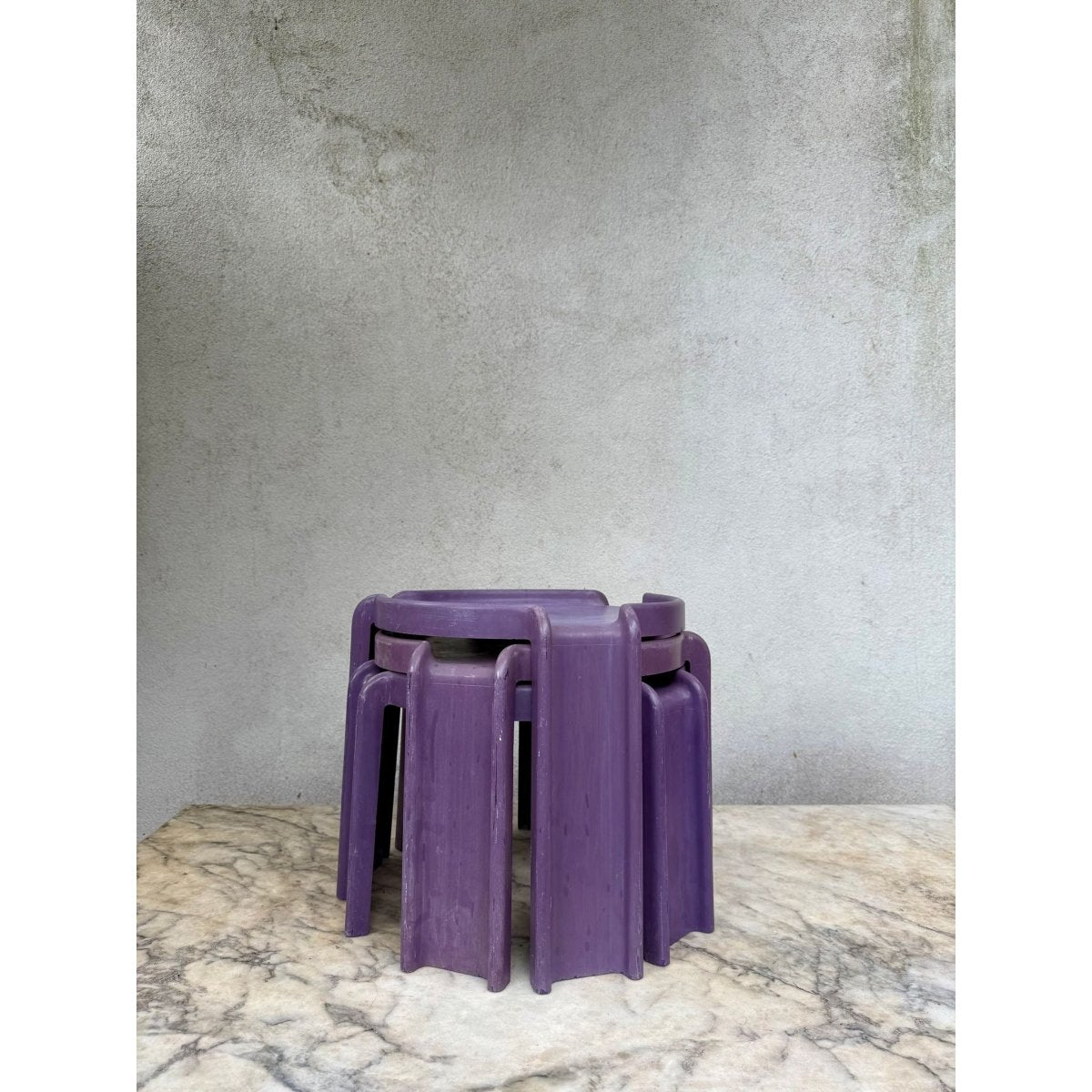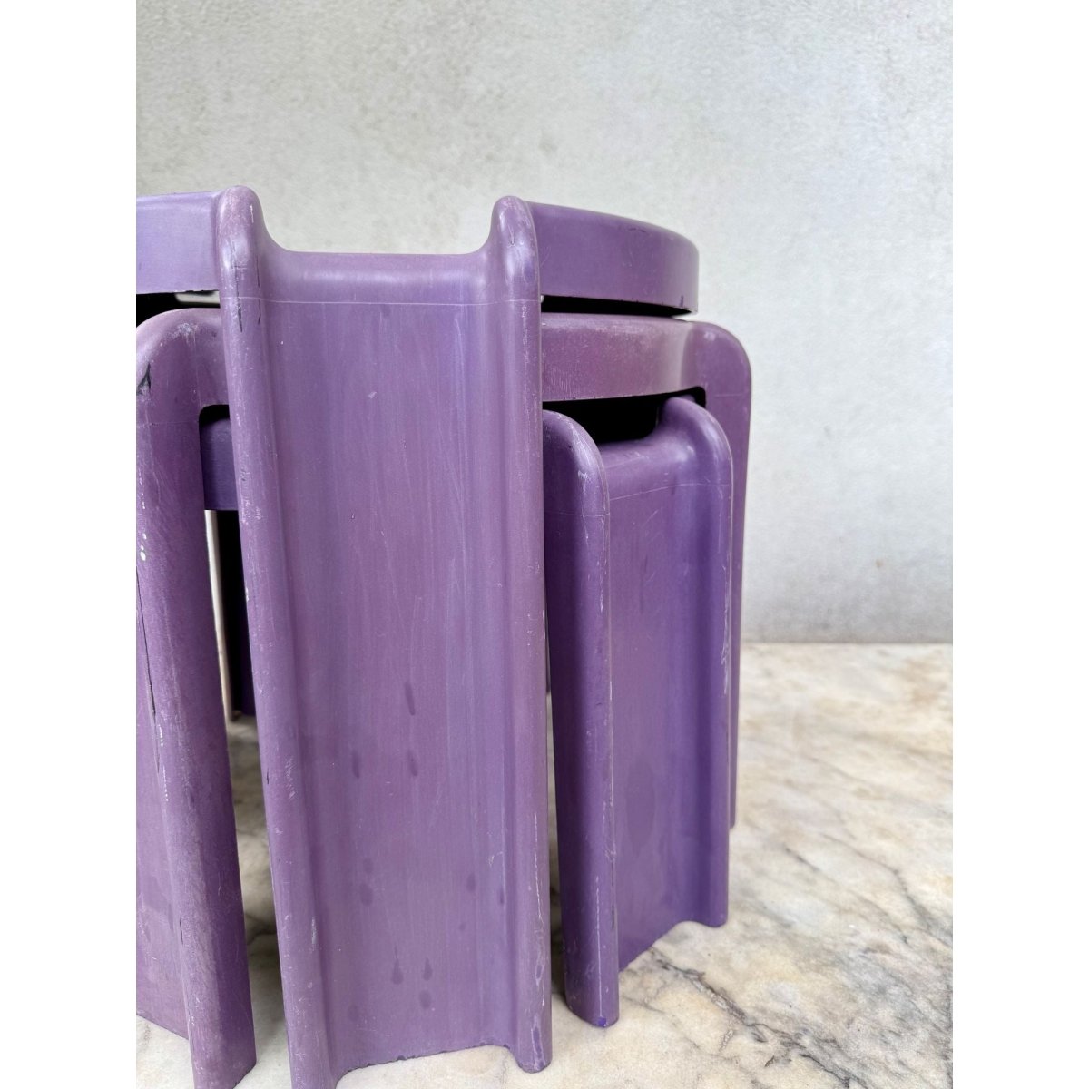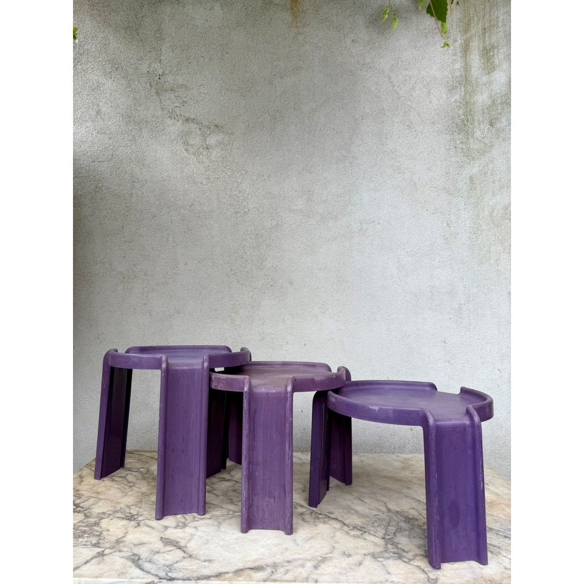 This striking post-modern set of three nesting side tables produced by Kartell is made from ABS purple plastic and was designed by Giotto Stoppino, circa 1970. It is a real space age item and is an icon of mid-century design.