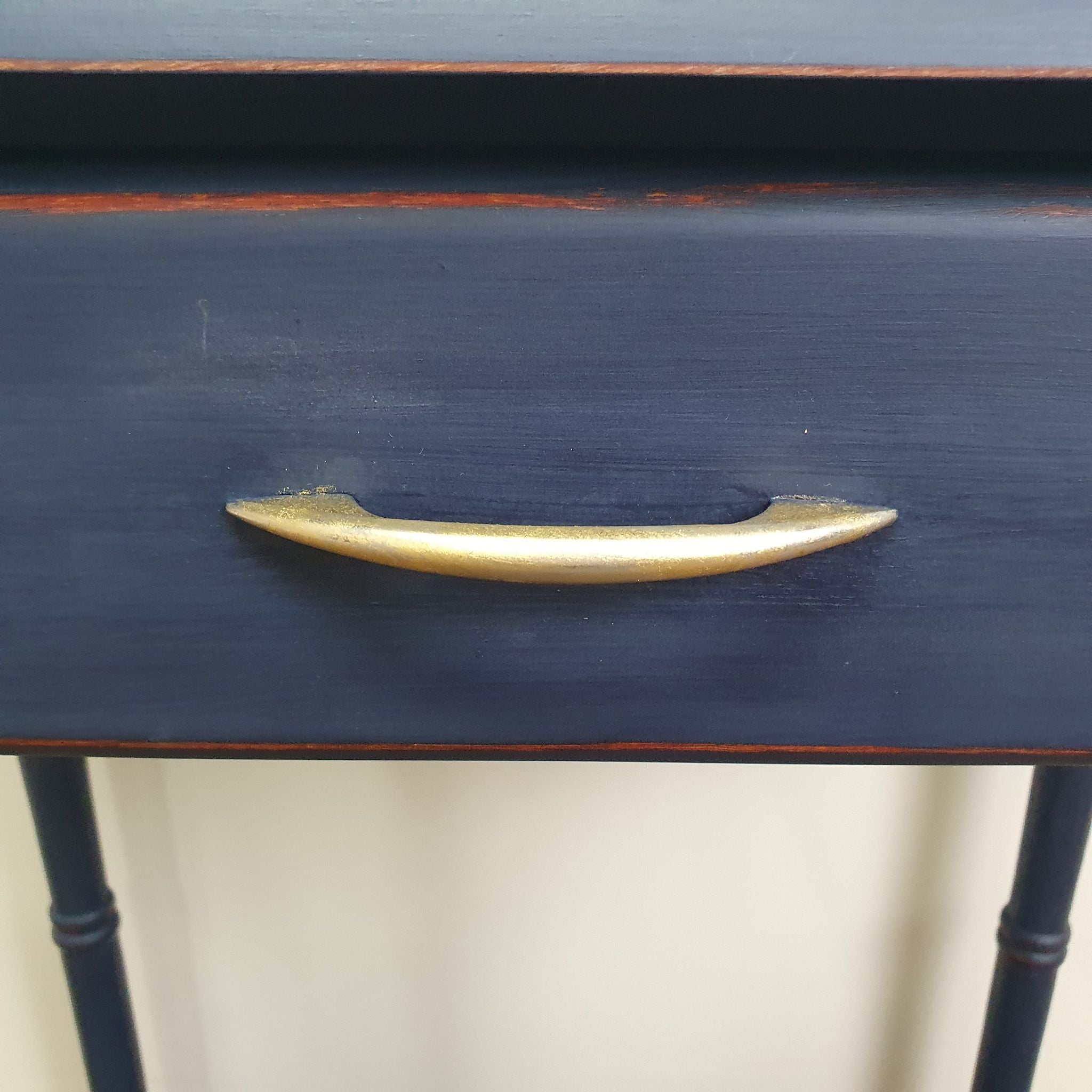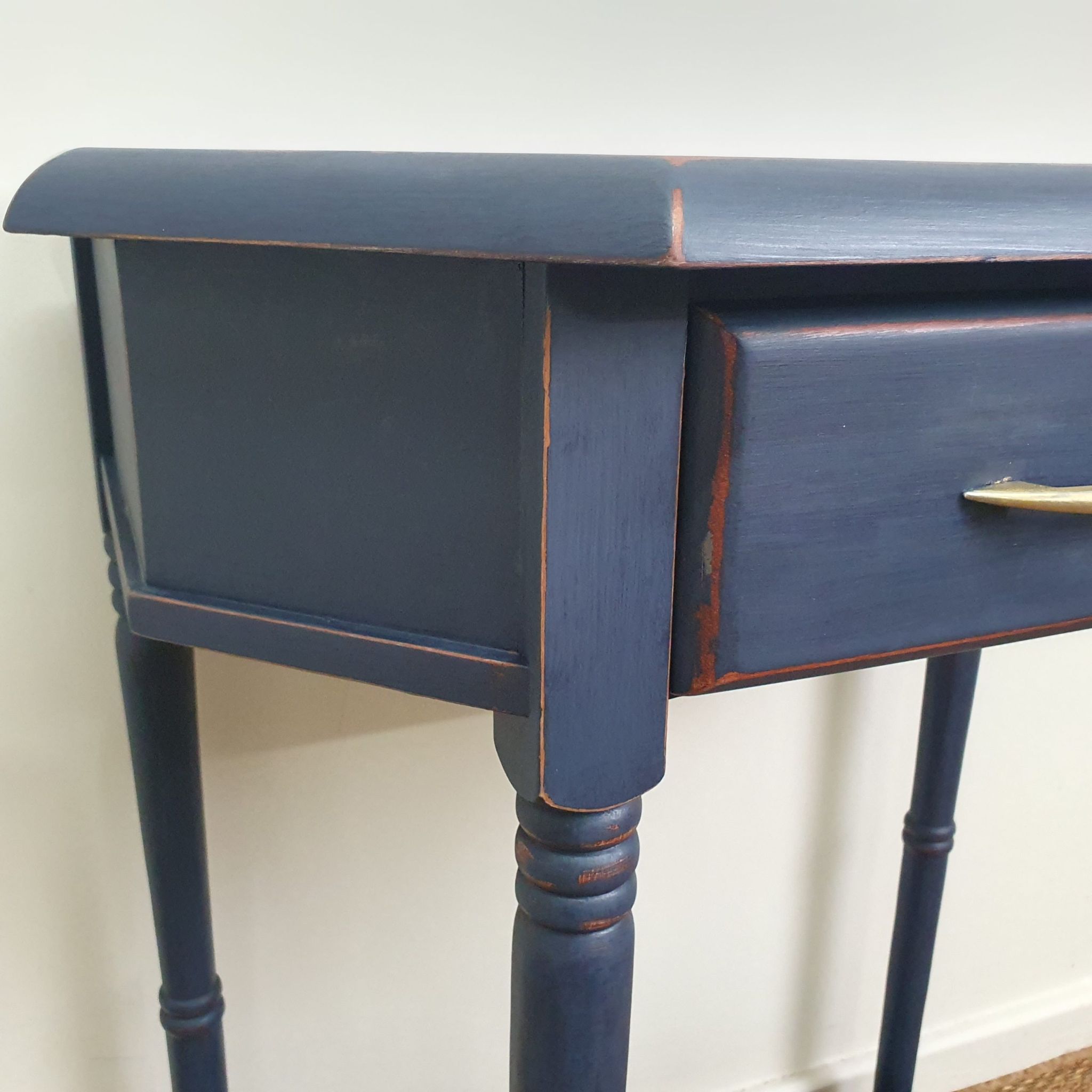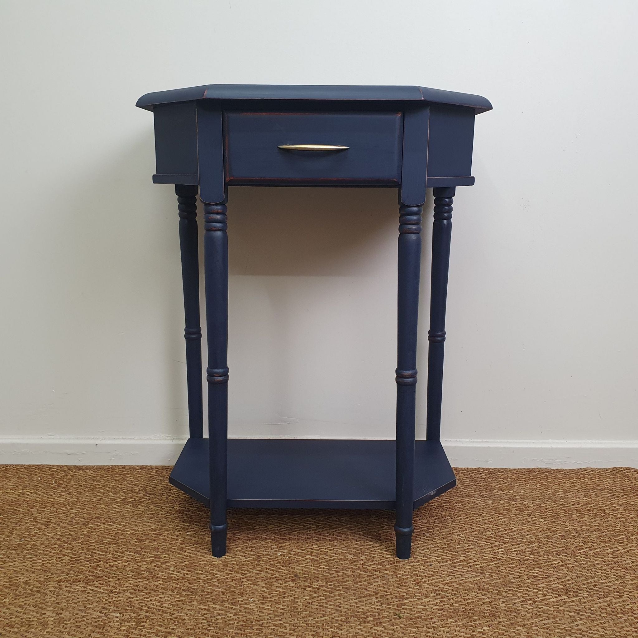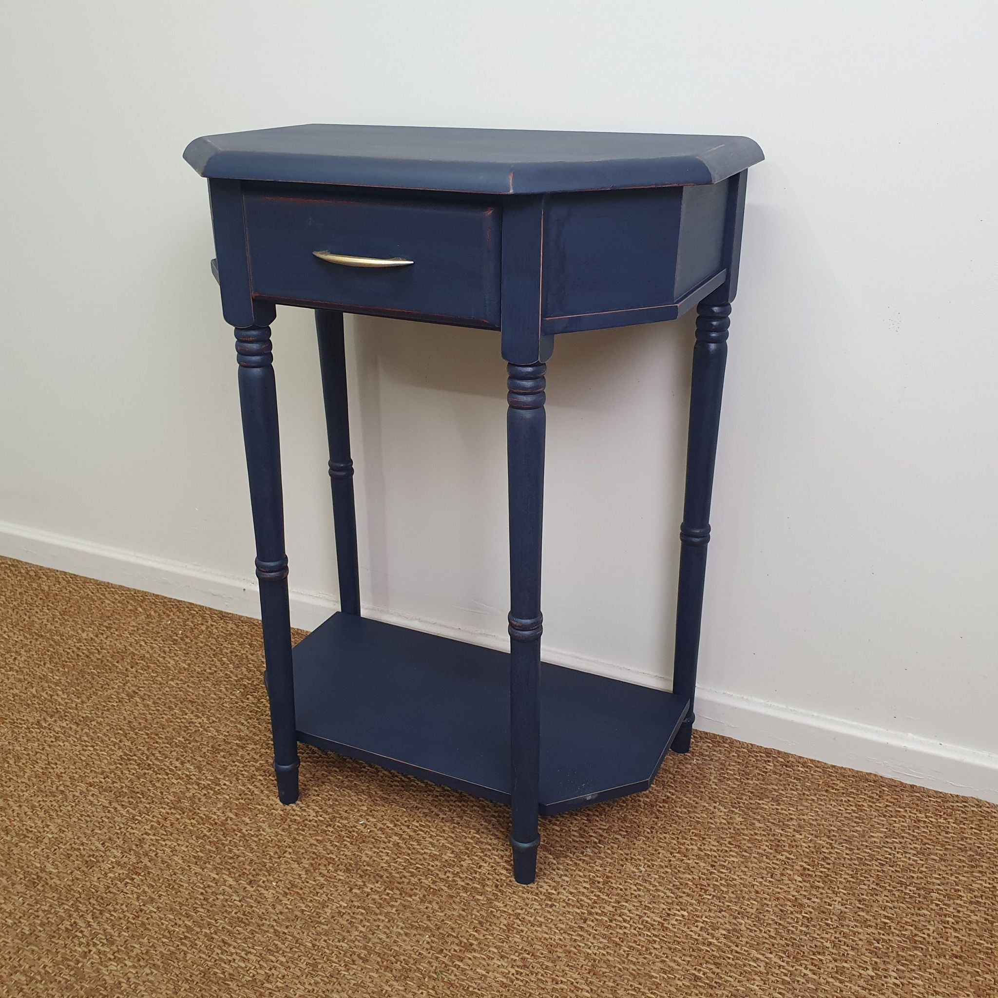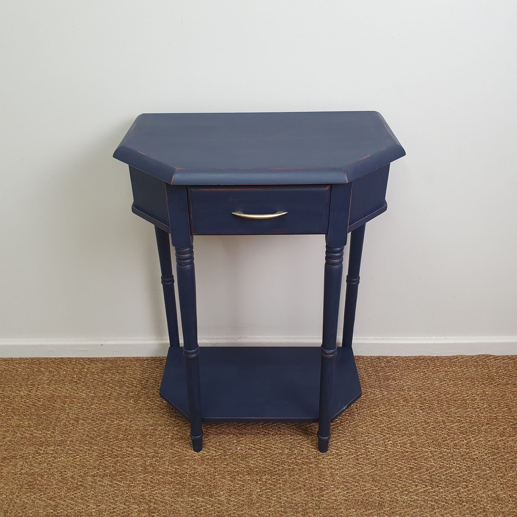 This hand-painted hall table features an Oxford Navy finish in Annie Sloan chalk paint, completed with a Matt Lacquer for a smooth, elegant look. It includes a single drawer and a second-tier base, offering practical storage and display space. A stylish statement piece for hallways, entryways, or living areas.