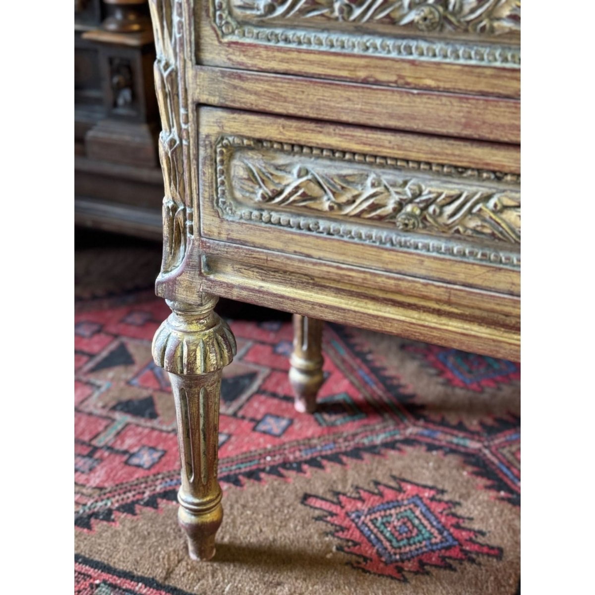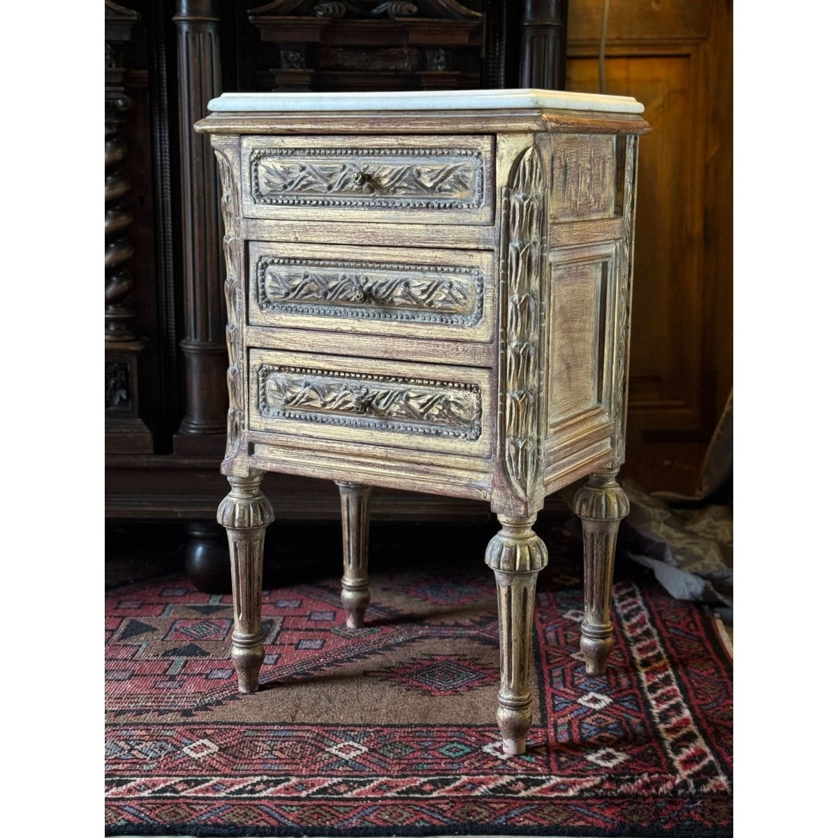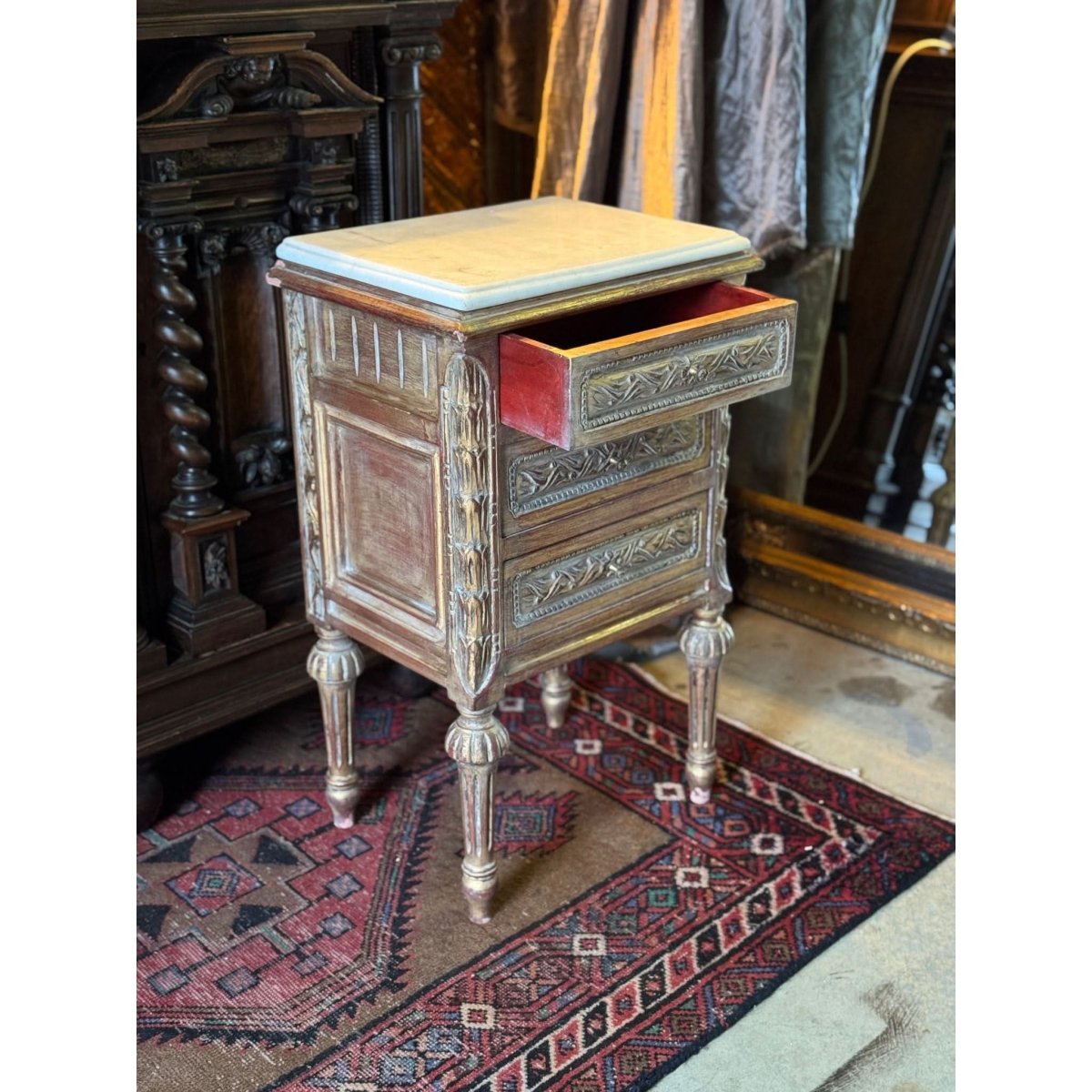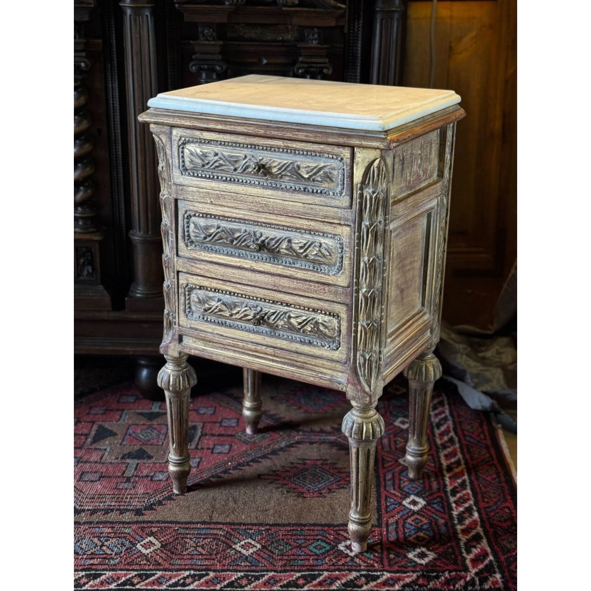 A lovely French Louis XVI style gold leaf three drawer side table with a white marble top. Minor scuff marks consistent with age.