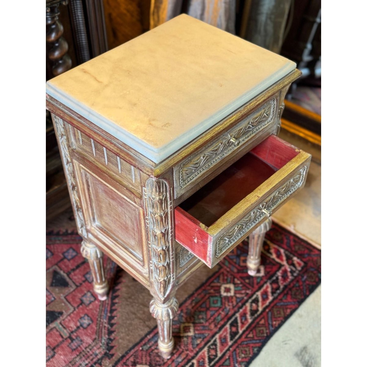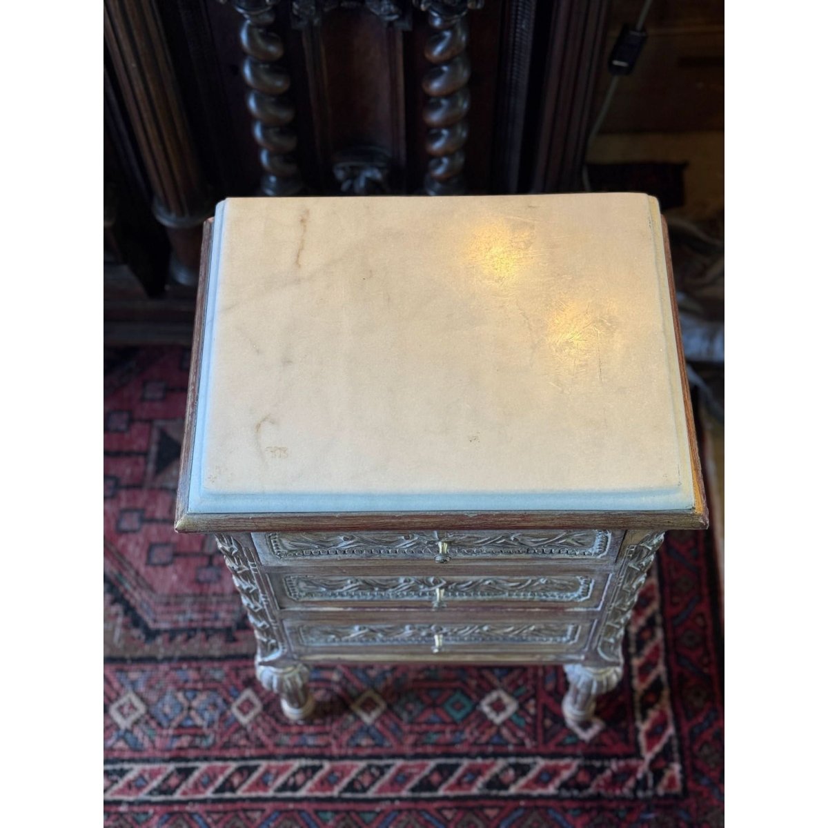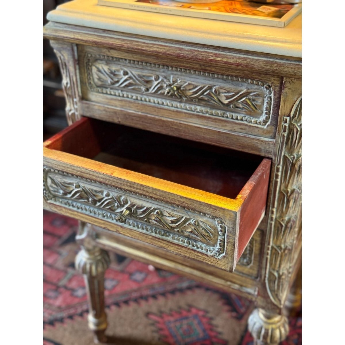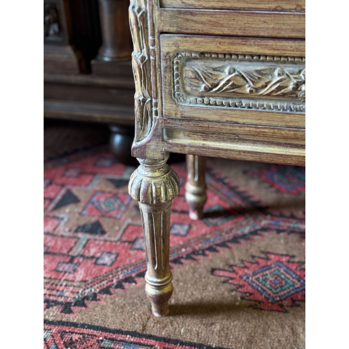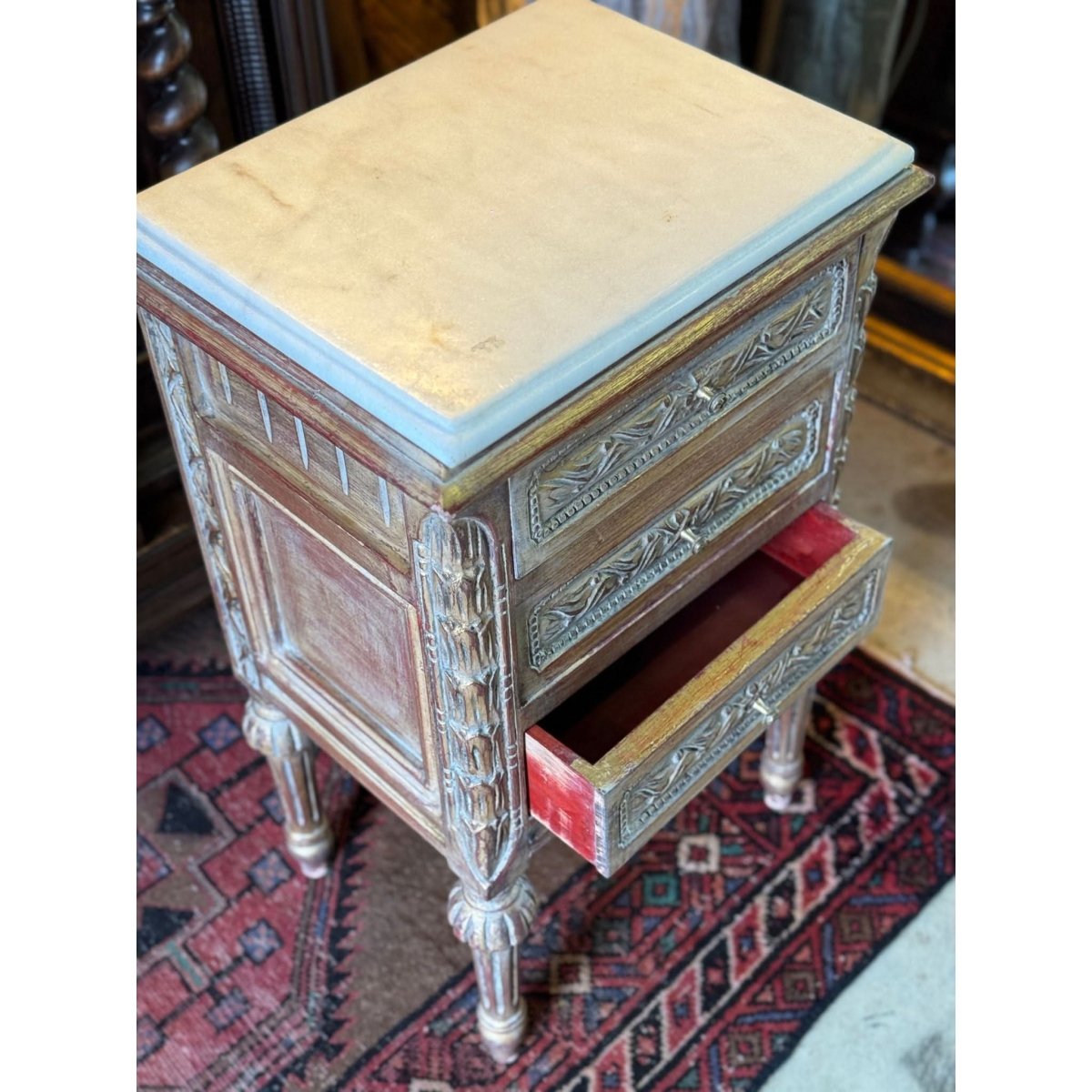 A lovely French Louis XVI style gold leaf three drawer side table with a white marble top. Minor scuff marks consistent with age.