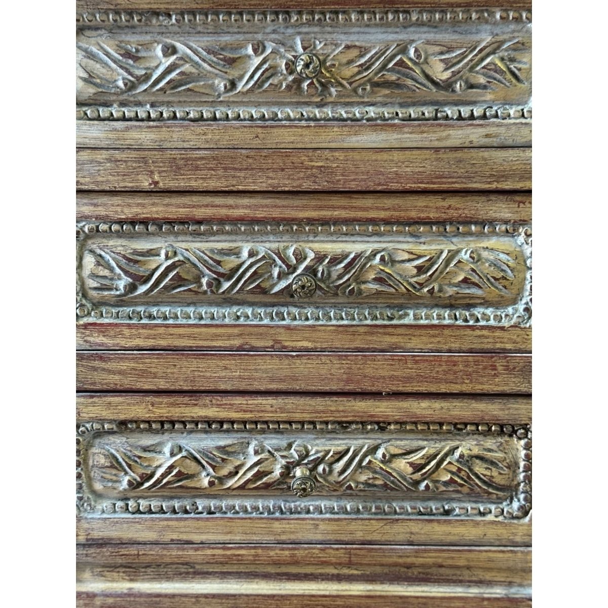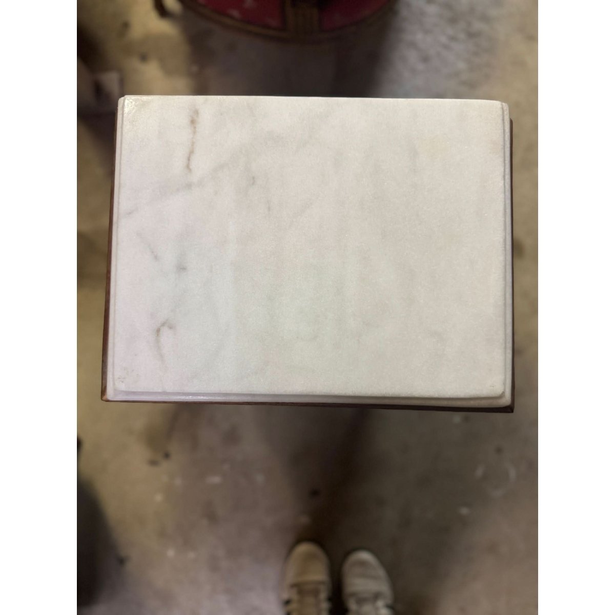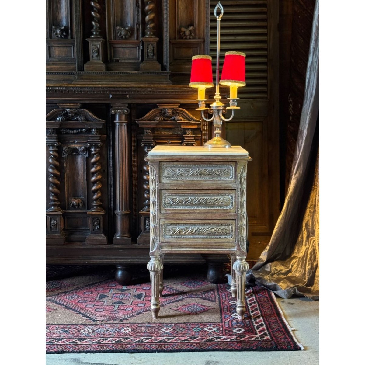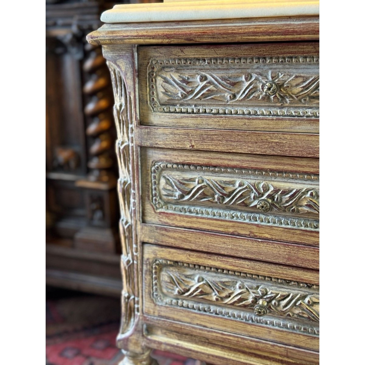 A lovely French Louis XVI style gold leaf three drawer side table with a white marble top. Minor scuff marks consistent with age.