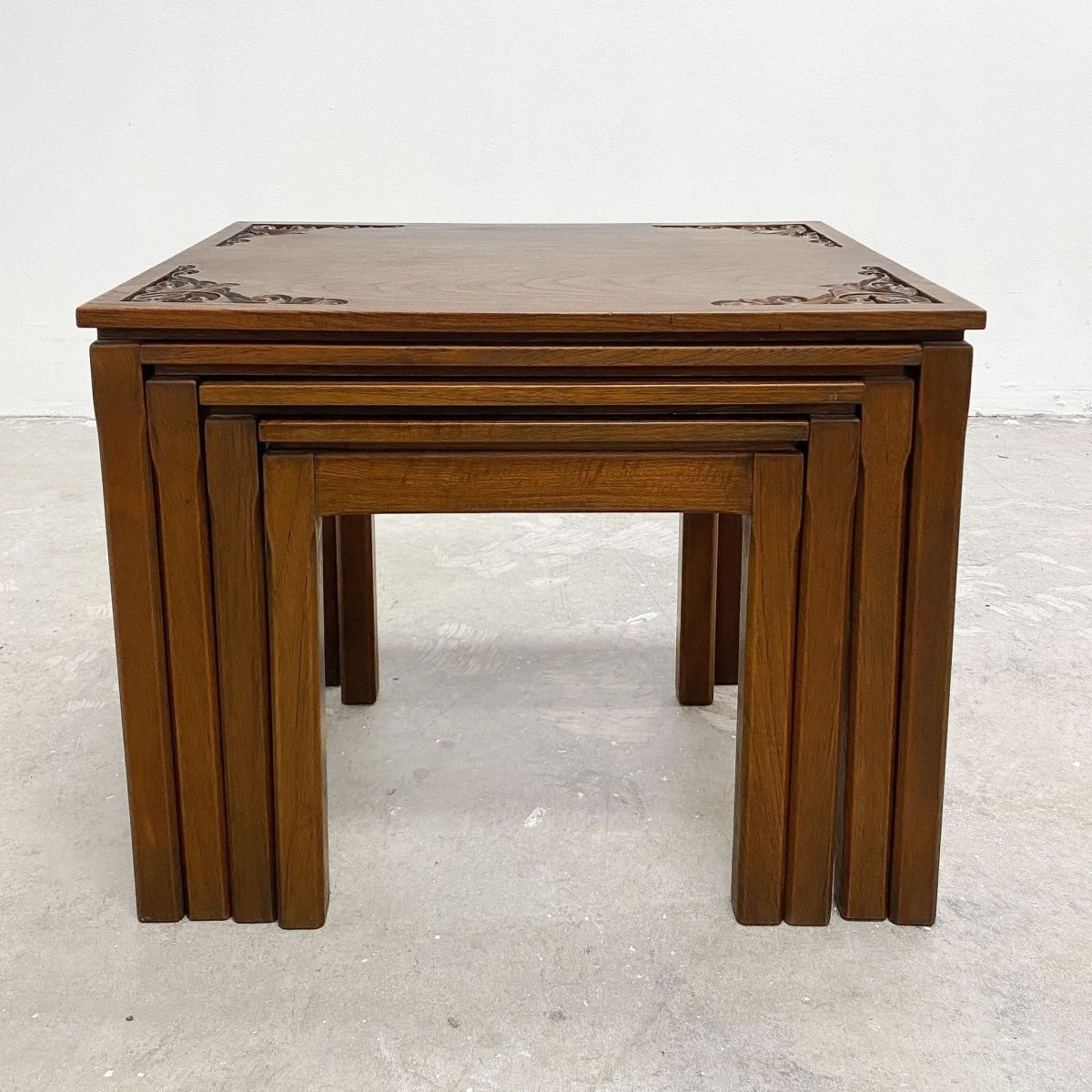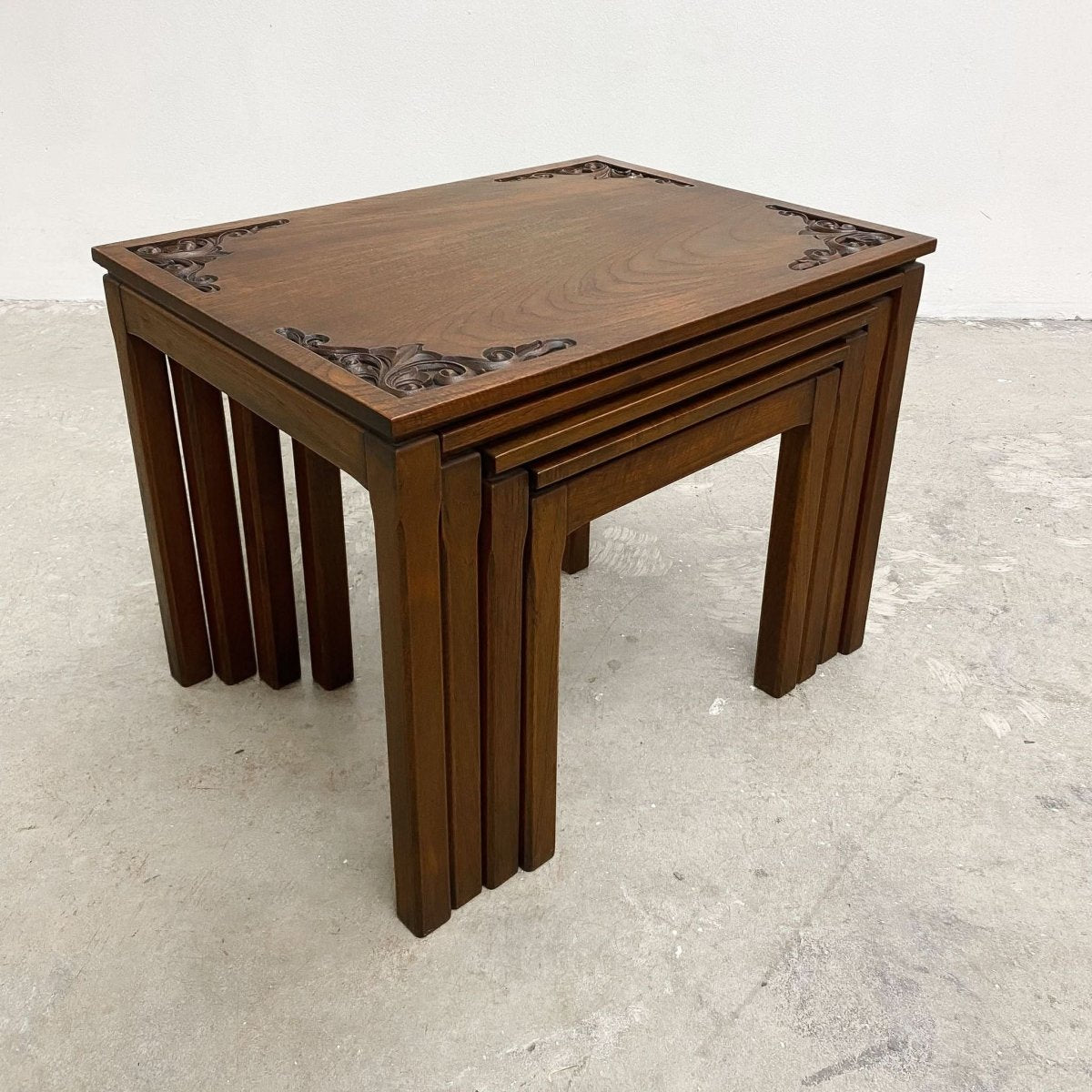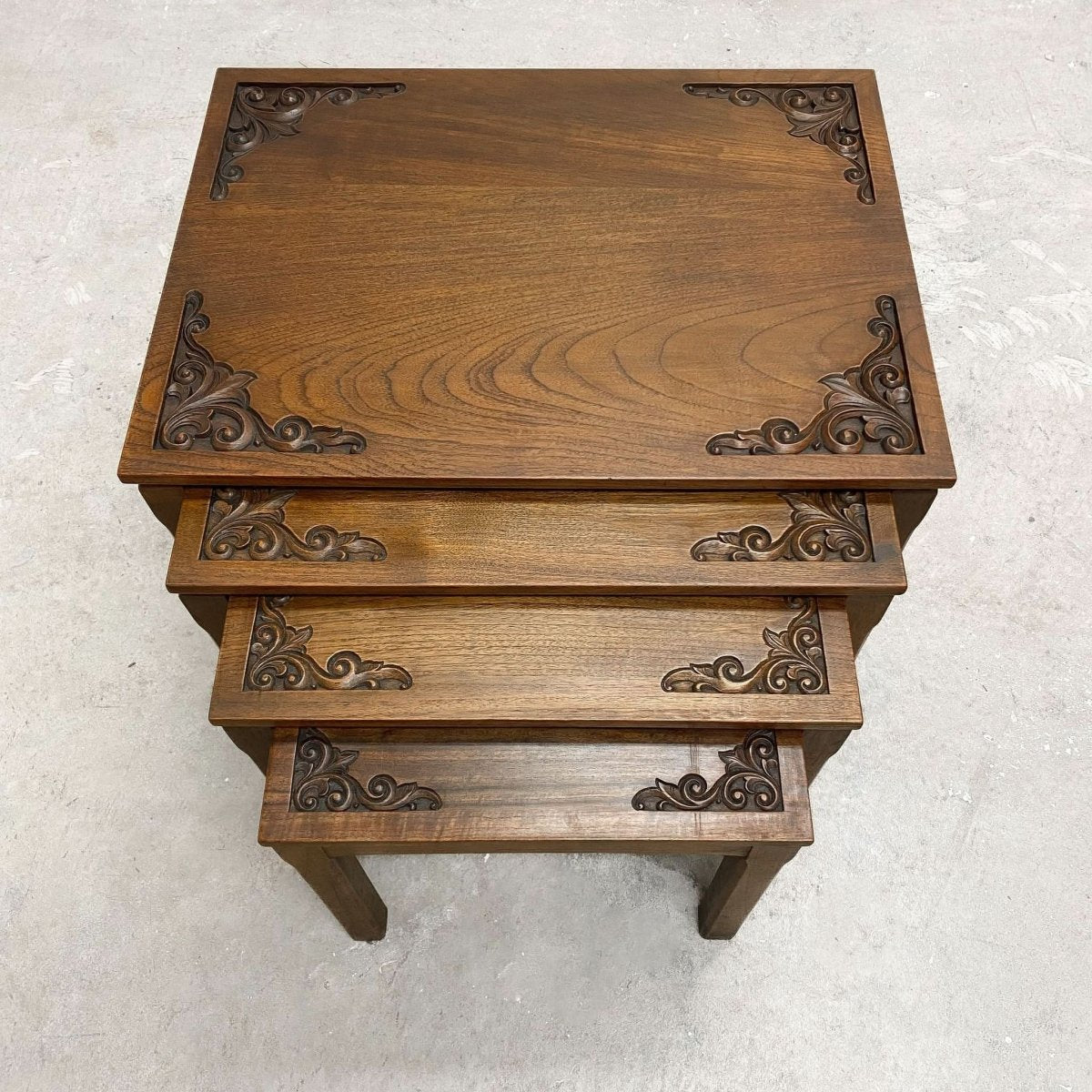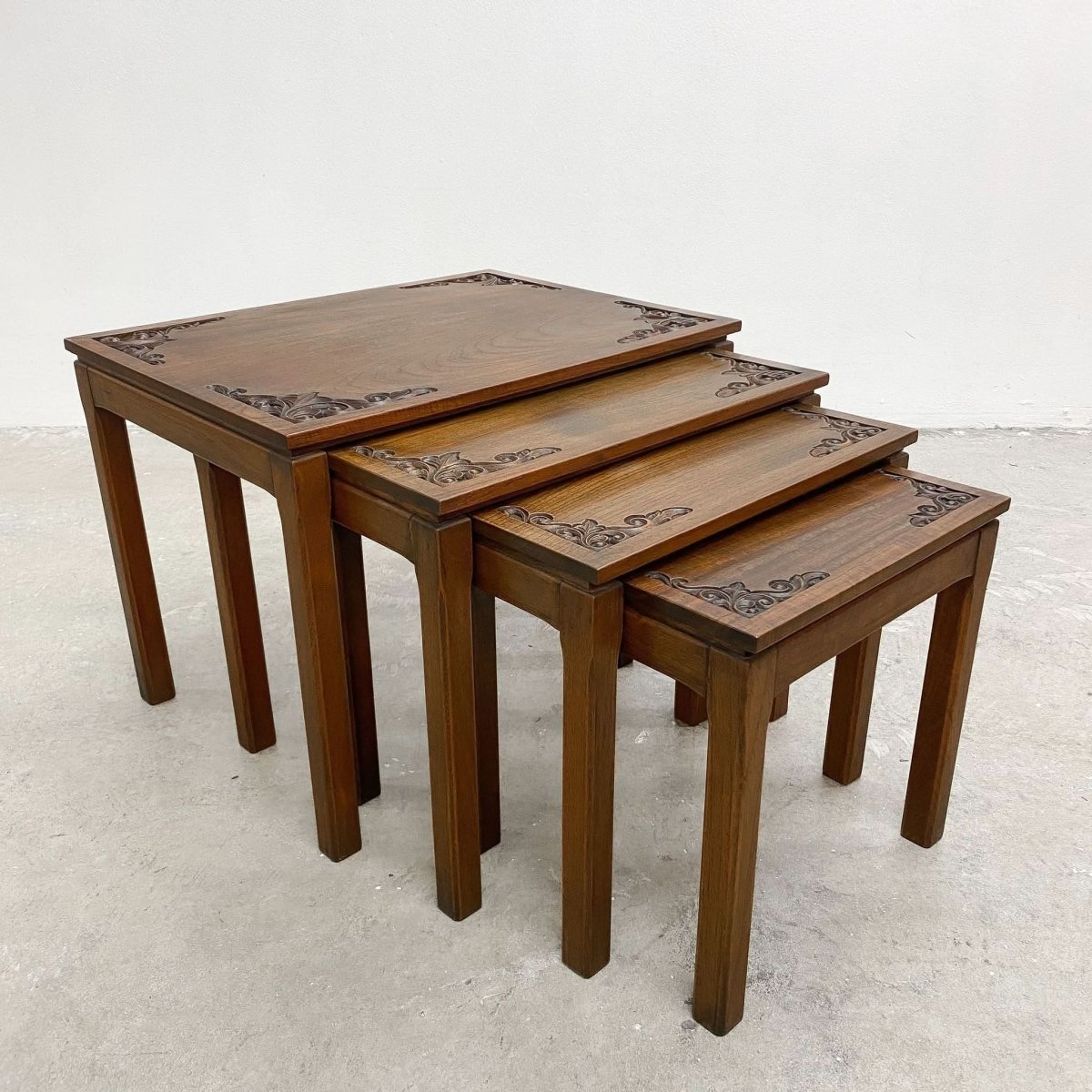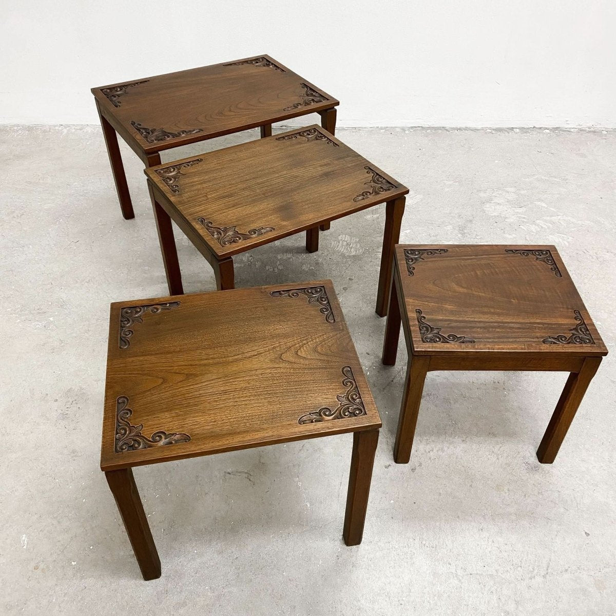 Hand carved vintage mid century solid wood nest of 4 tables from the 1960s. The carvings have an oriental aspect and feel to them. Plenty of tables to rest your drinks on when the guests arrive.