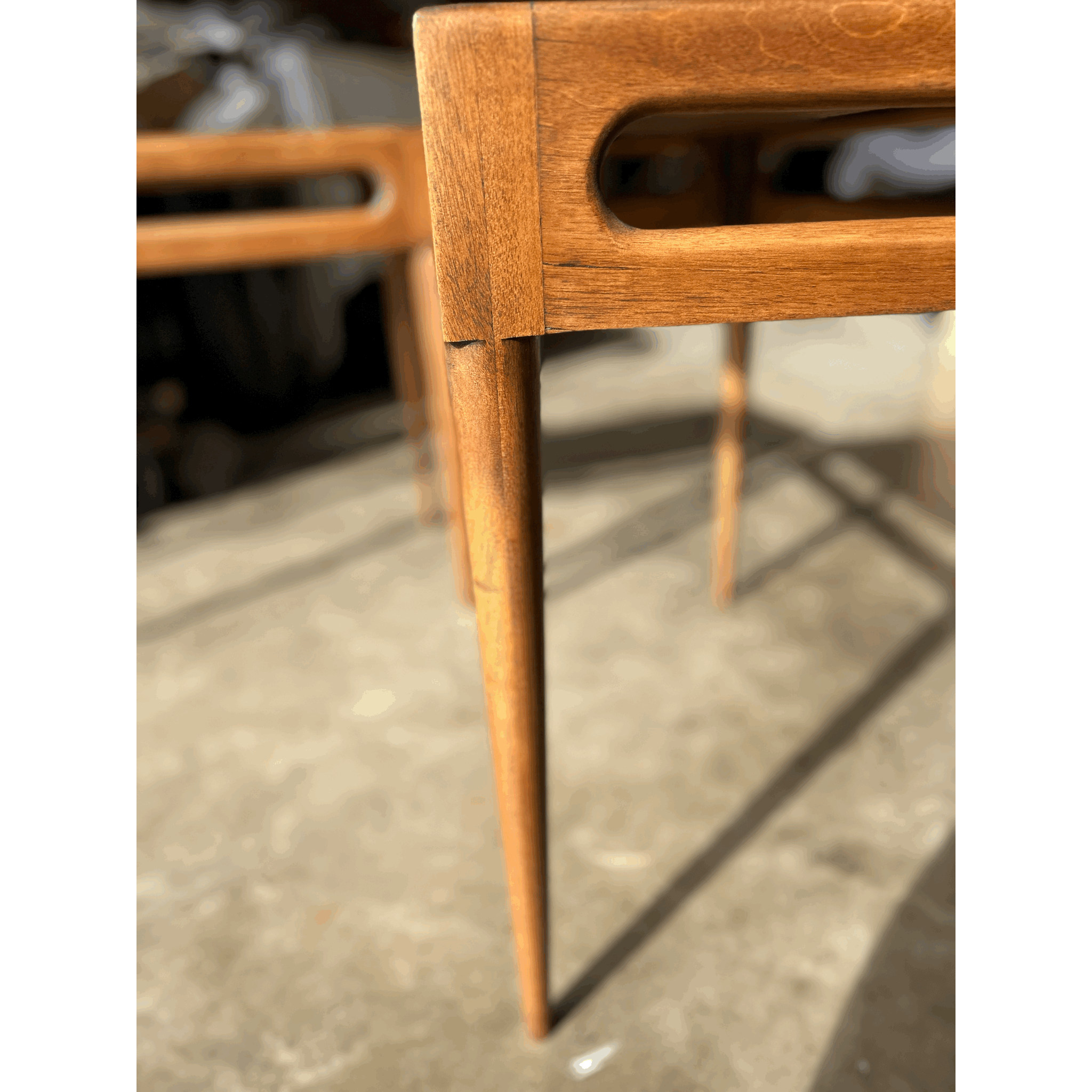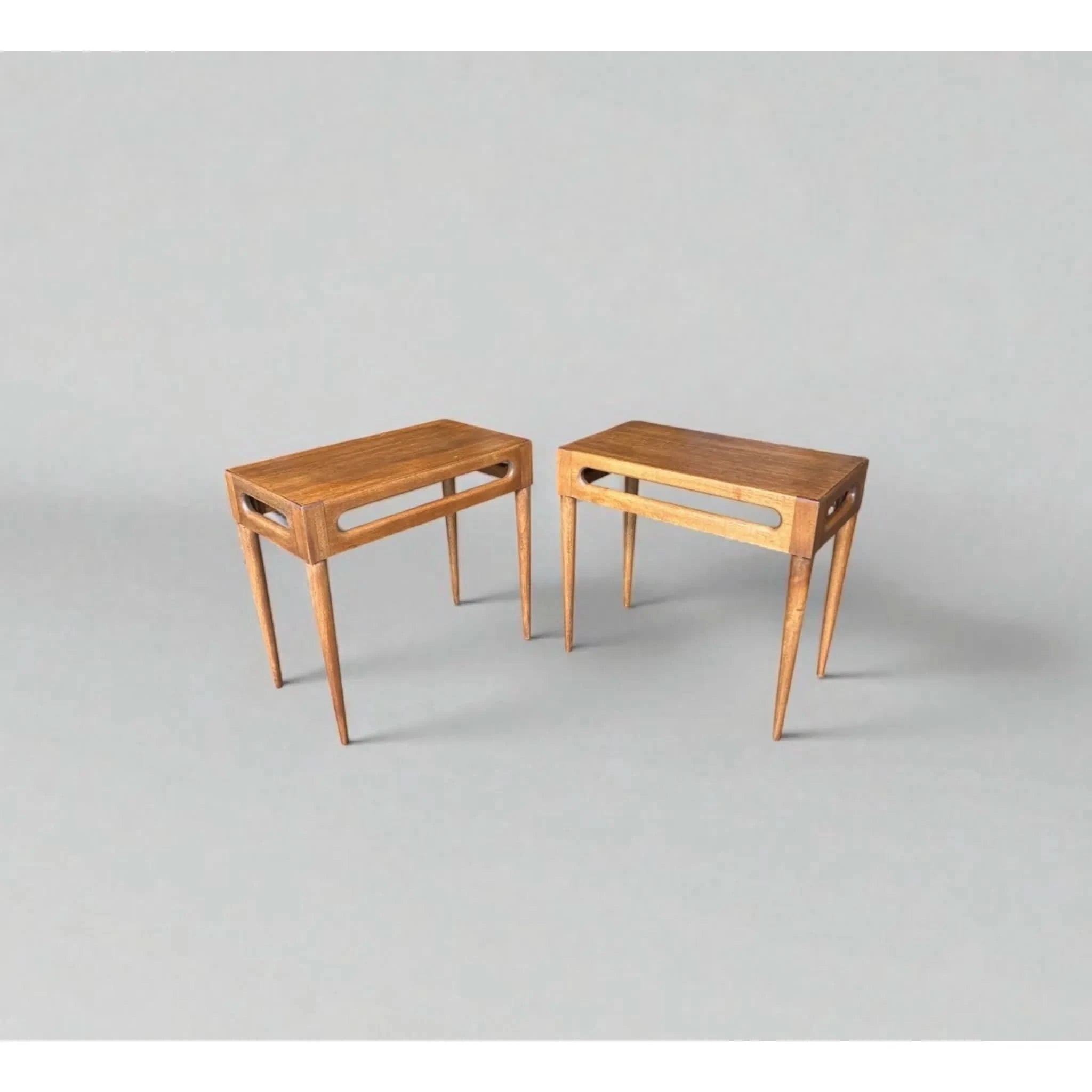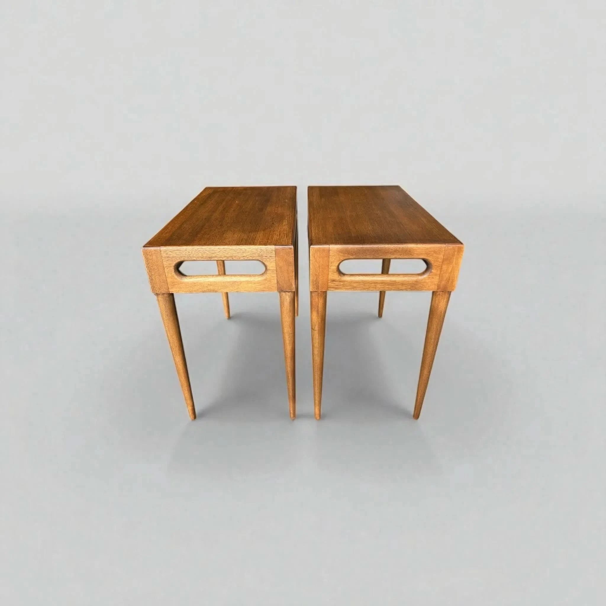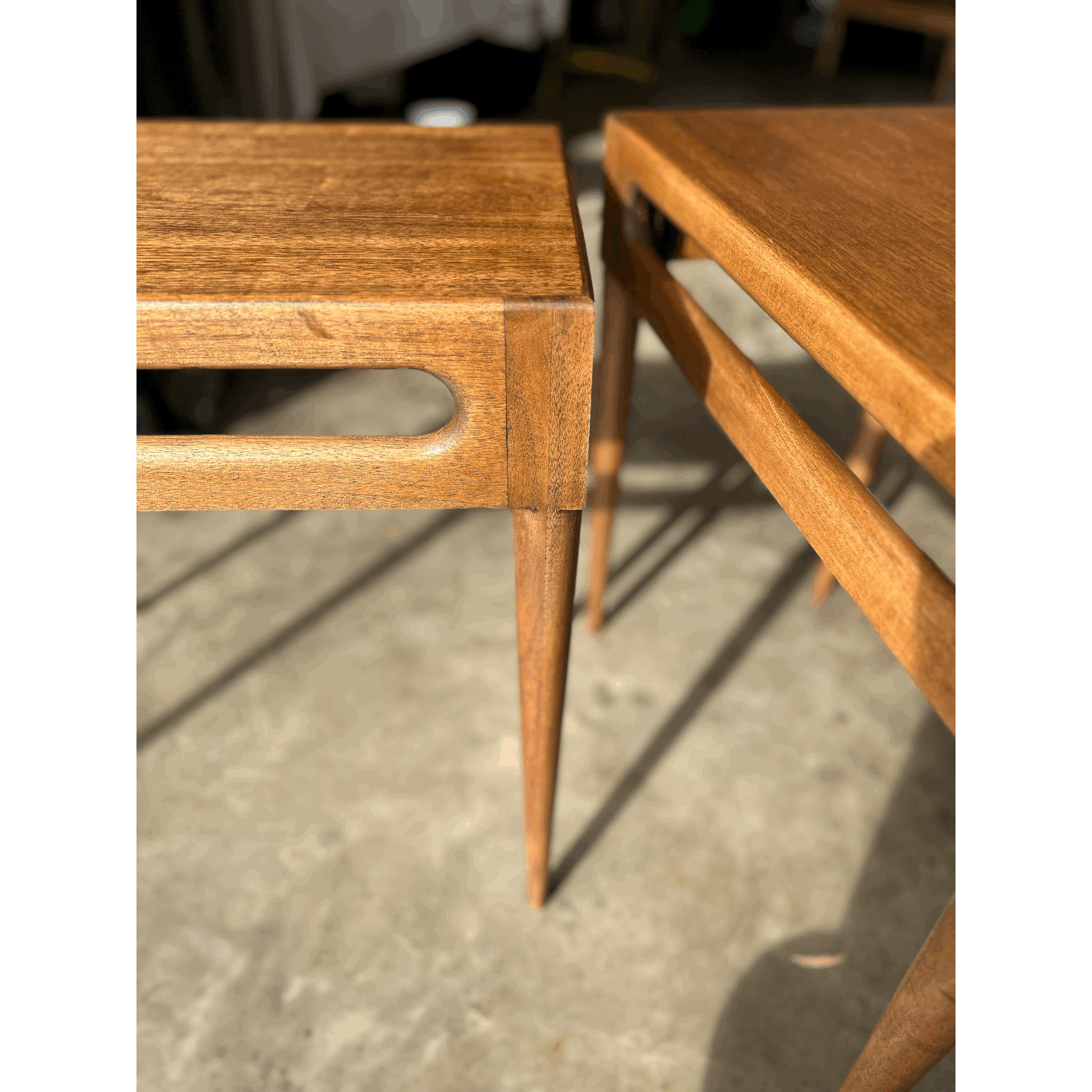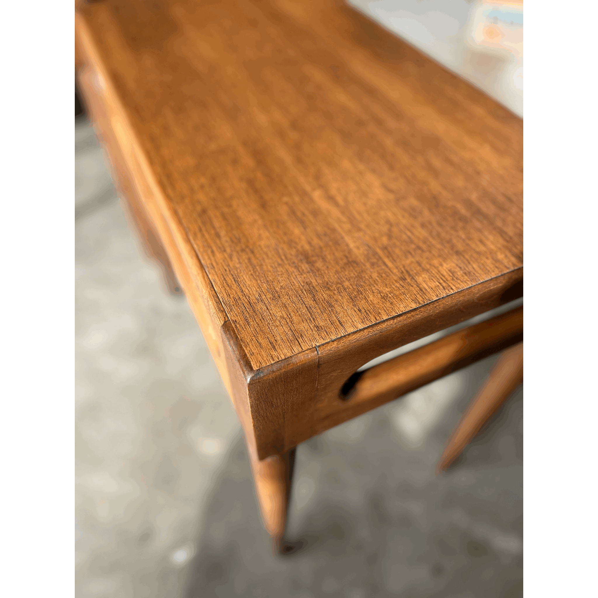This side table has been fully restored and finished in a Scandinavian oil, preserving the original veneer tops. Whether used as a bedside table or styled by your sofa, this piece will bring your space a refined and understated mid-century elegance.