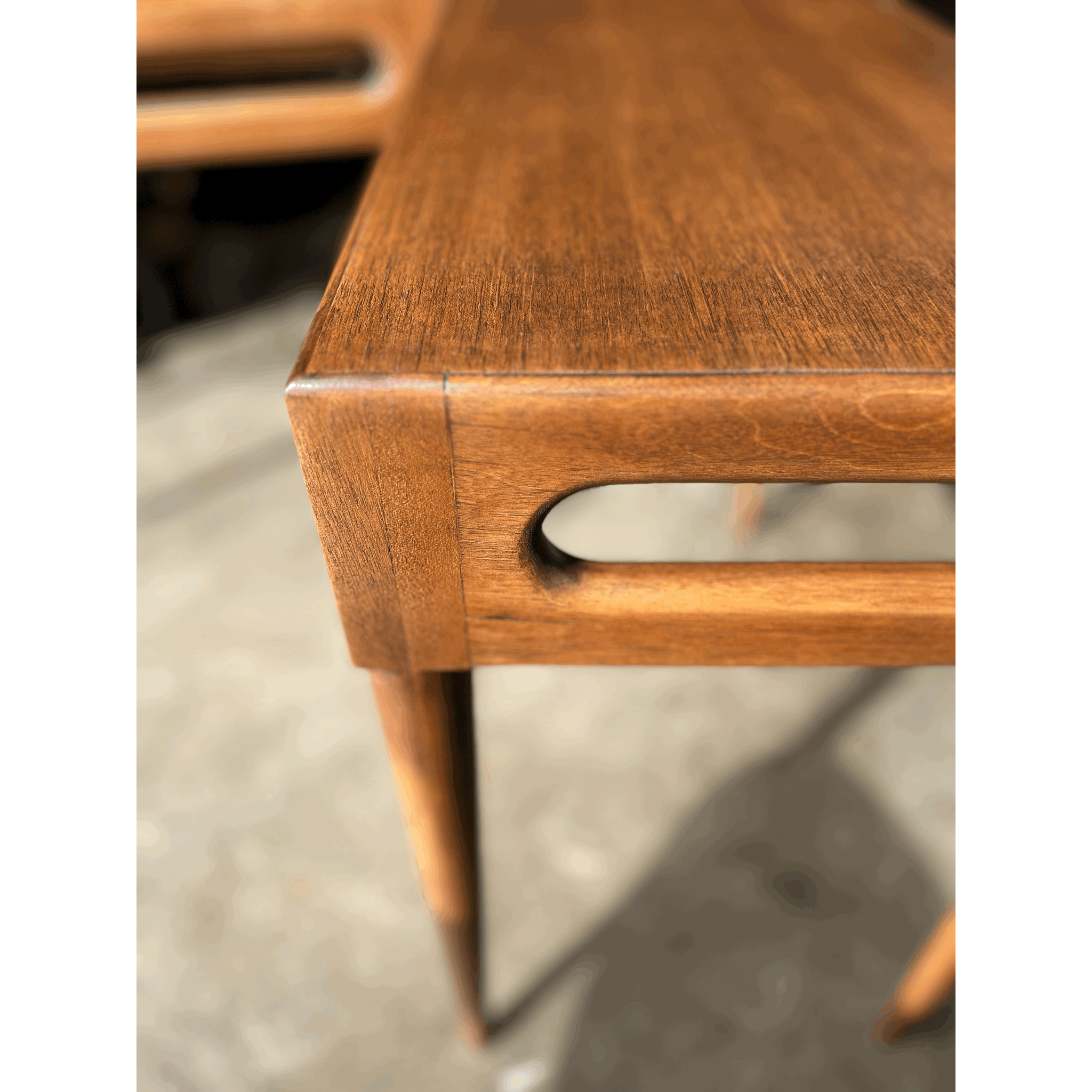 A striking mid-century side table with all the hallmarks of sleek 1960s design. The sculptural form is defined by clean lines, tapered legs, and a distinctive cut-out detailing, giving this piece a light, architectural presence.