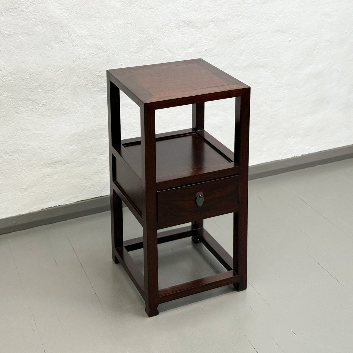 Refined in form and compact in size, this dark brown Chinese vase table features a lower drawer and shelf, perfect for smaller spaces and layered styling. Ideal as a bedside table, entry console, or living room accent, its minimal profile and practical design highlight the balance of elegance and function in Chinese furniture. A timeless piece that integrates effortlessly into both traditional and modern interiors.