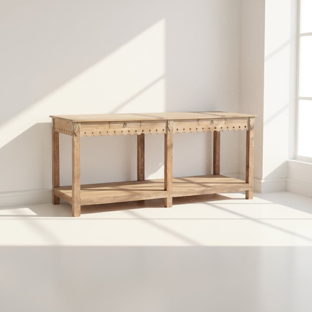 This vintage teak work table features two small drawers at the top and an open compartment below. The drawers glide smoothly, and the shelving is solid and dependable. With its original metal handles, this piece carries a charming character that adds warmth and style to any space.