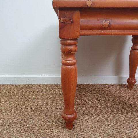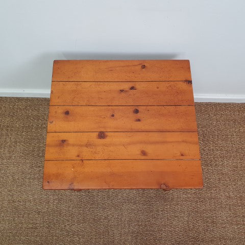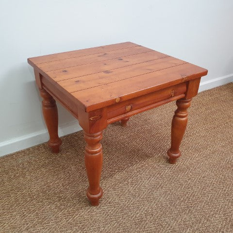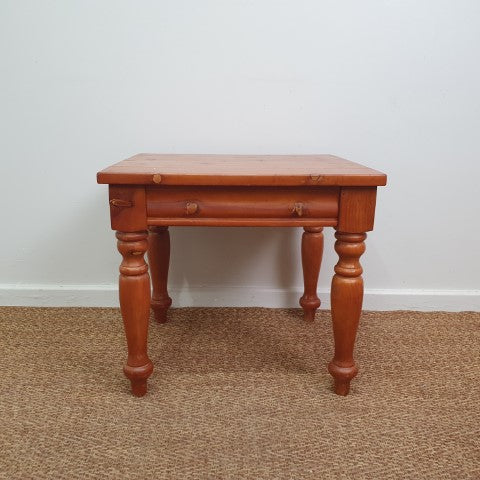 This vintage pine side table features turned legs and a simple, classic design that highlights the timber’s natural grain. Its understated silhouette makes it a versatile decorative piece for living areas, bedrooms, or hallways, complementing both traditional and eclectic interiors.