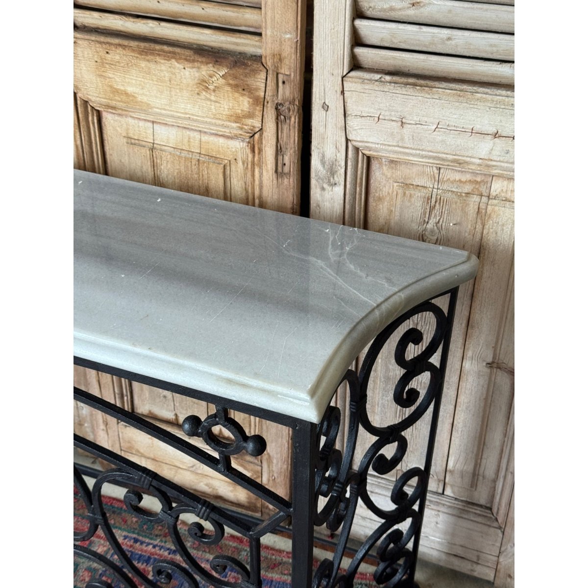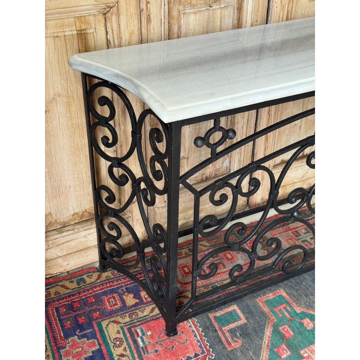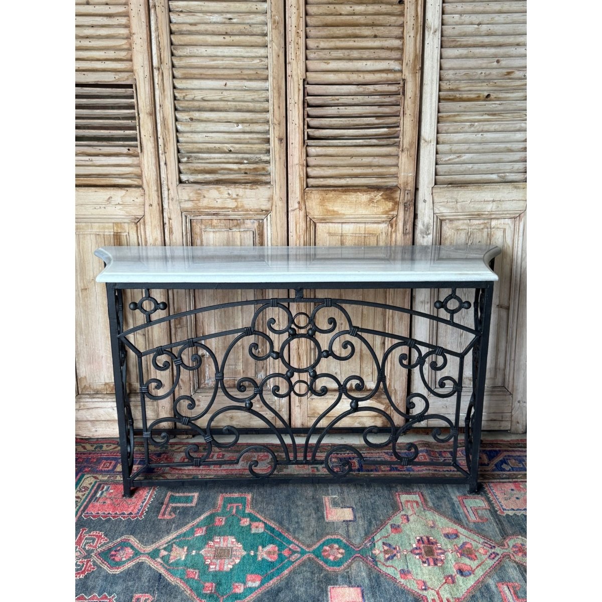 A refined vintage wrought iron console featuring a pale marble top with softly moulded edges. The iron base shows decorative scrollwork with a strong architectural feel, likely adapted from earlier wrought iron panels such as Juliette balcony or window guard fretwork, a practice commonly seen in Europe during the mid-20th century. The iron has a good weight and balance, with repeating scroll motifs and a central medallion detail. The marble top sits neatly within the frame and shows light surface wear consistent with age and use. An elegant piece that works equally well in an entry, hallway or behind a sofa, bringing a quiet sense of old-world character without feeling heavy. Likely European, mid-20th century.