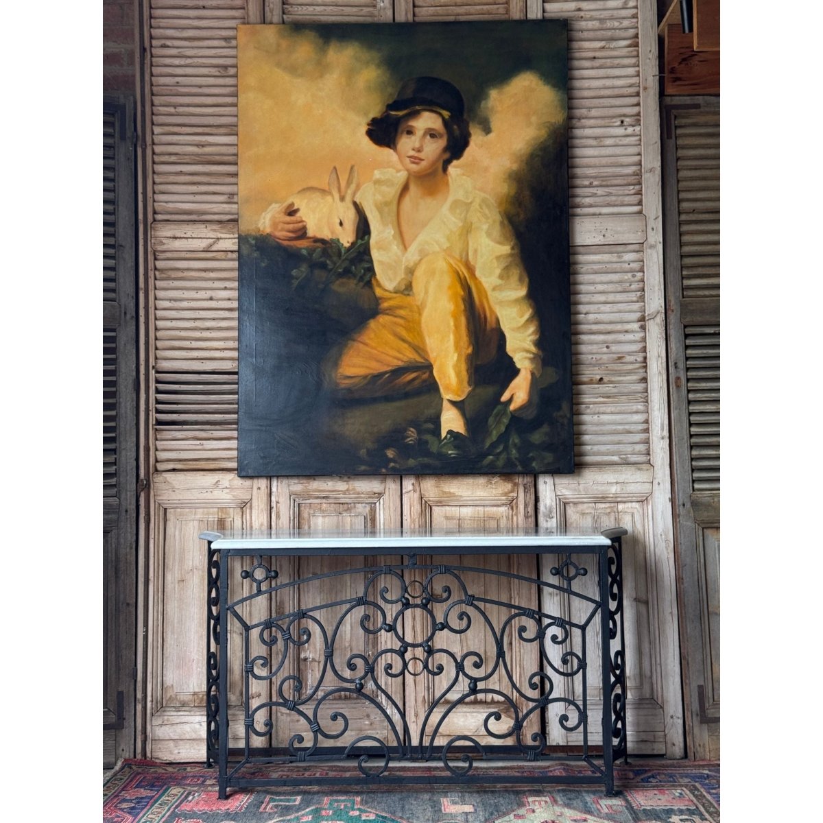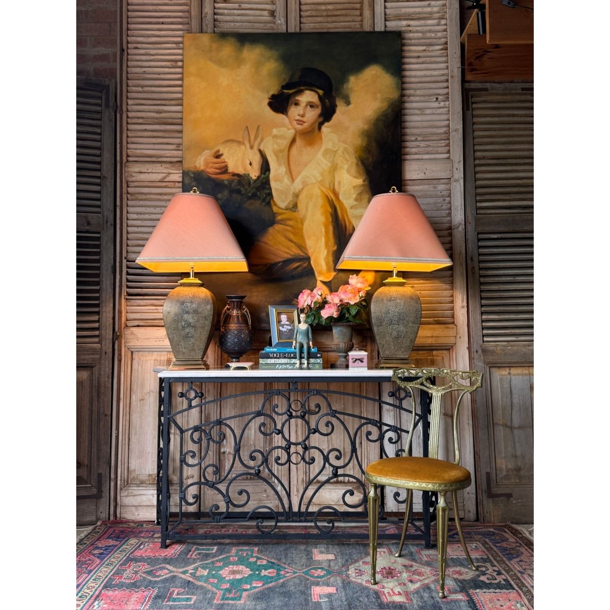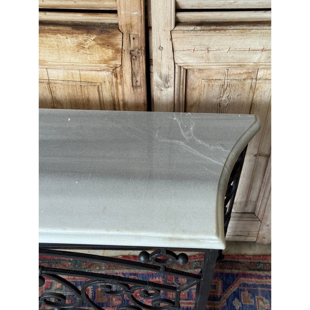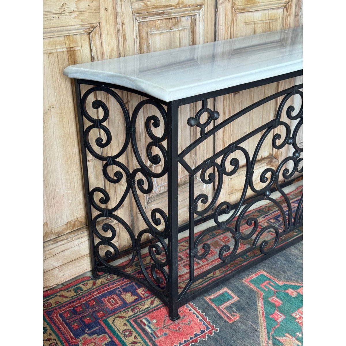 A refined vintage wrought iron console featuring a pale marble top with softly moulded edges. The iron base shows decorative scrollwork with a strong architectural feel, likely adapted from earlier wrought iron panels such as Juliette balcony or window guard fretwork, a practice commonly seen in Europe during the mid-20th century. The iron has a good weight and balance, with repeating scroll motifs and a central medallion detail. The marble top sits neatly within the frame and shows light surface wear consistent with age and use. An elegant piece that works equally well in an entry, hallway or behind a sofa, bringing a quiet sense of old-world character without feeling heavy. Likely European, mid-20th century.