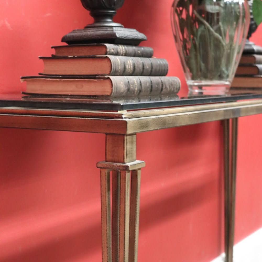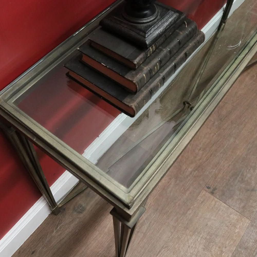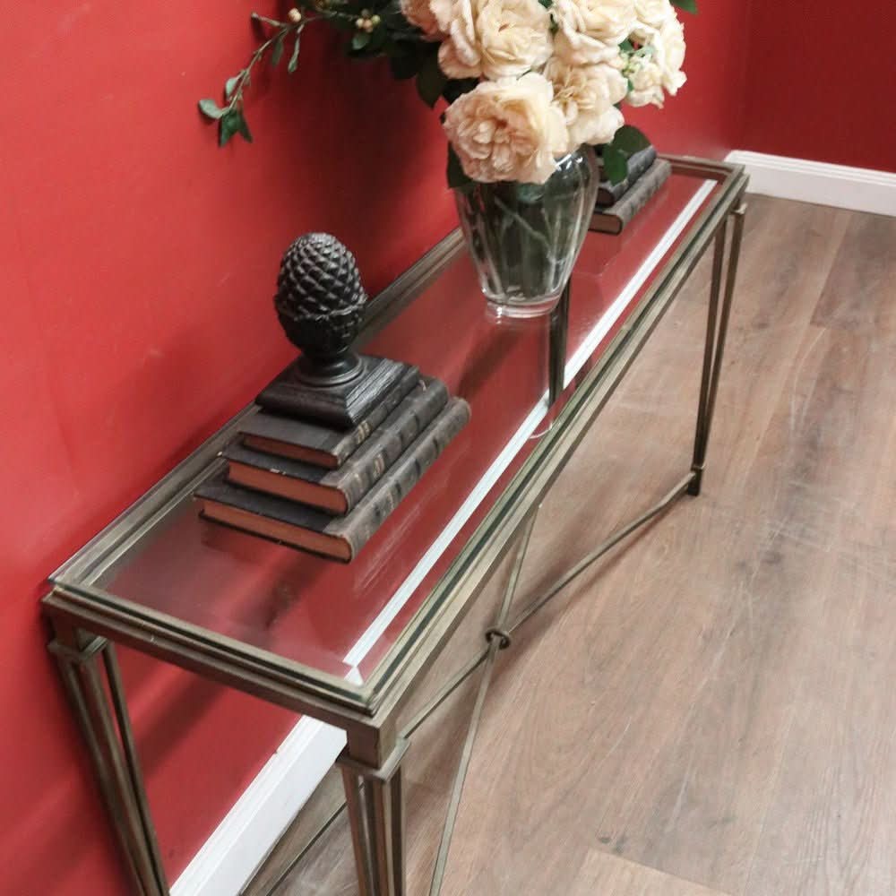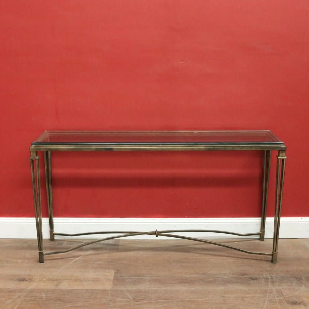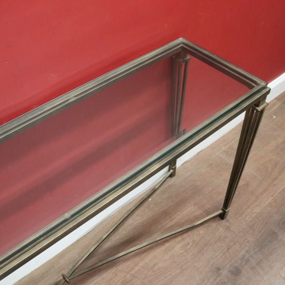 Description: A refined wrought iron sofa or hall table featuring a graceful, muted gold finish. The base design includes a stylish cross stretcher with a central ring motif, adding a sculptural touch. A bevelled-edge glass insert top brings a light and elegant presence, making it perfect for a hallway, behind a sofa, or as a decorative feature. Sold individually but matches a coffee and lamp table, also available at the time of listing.