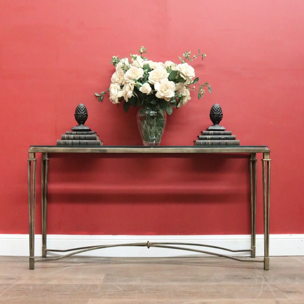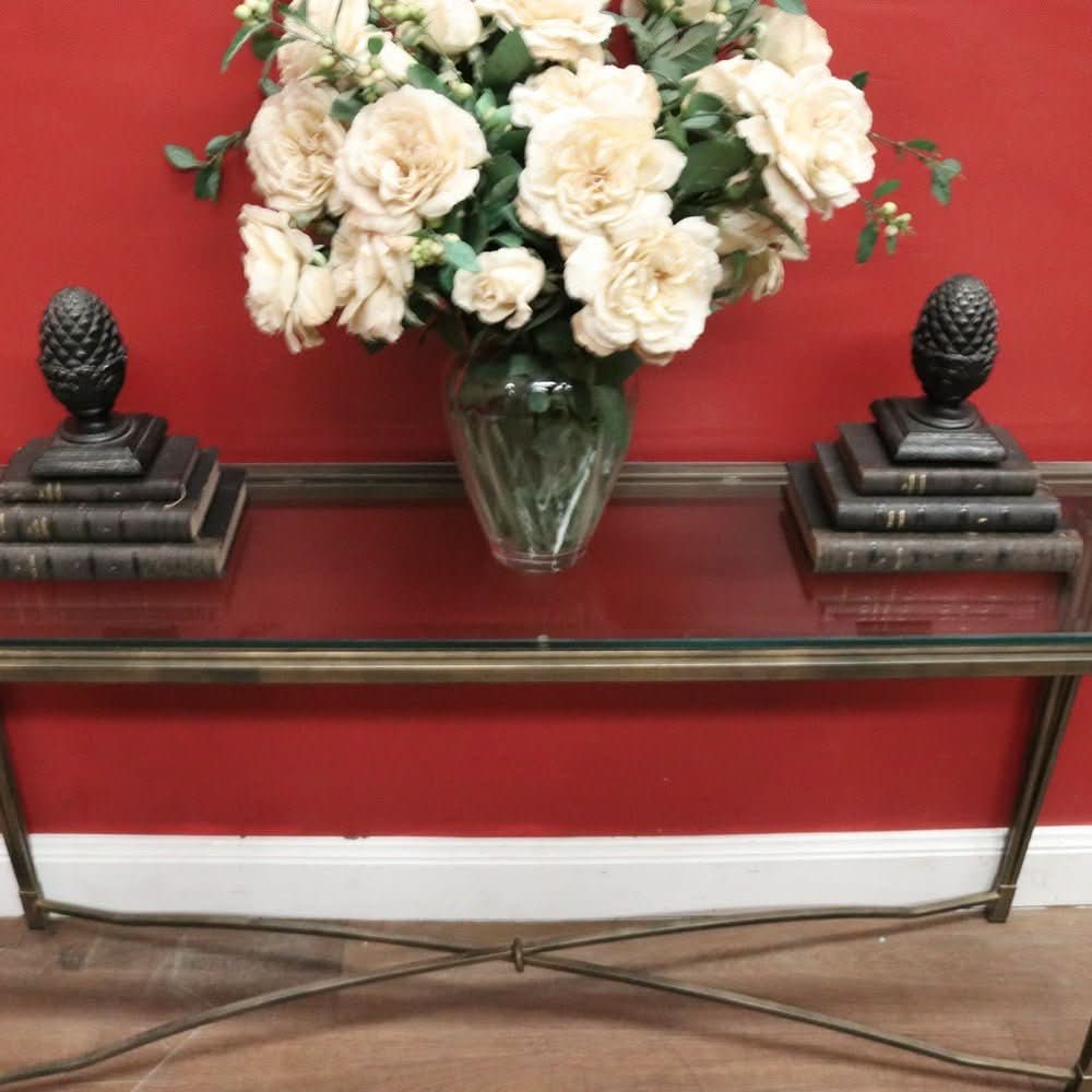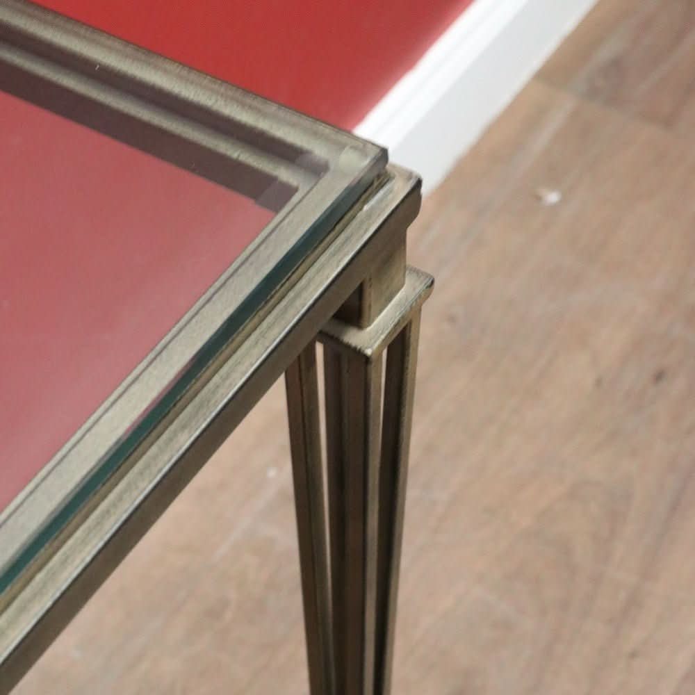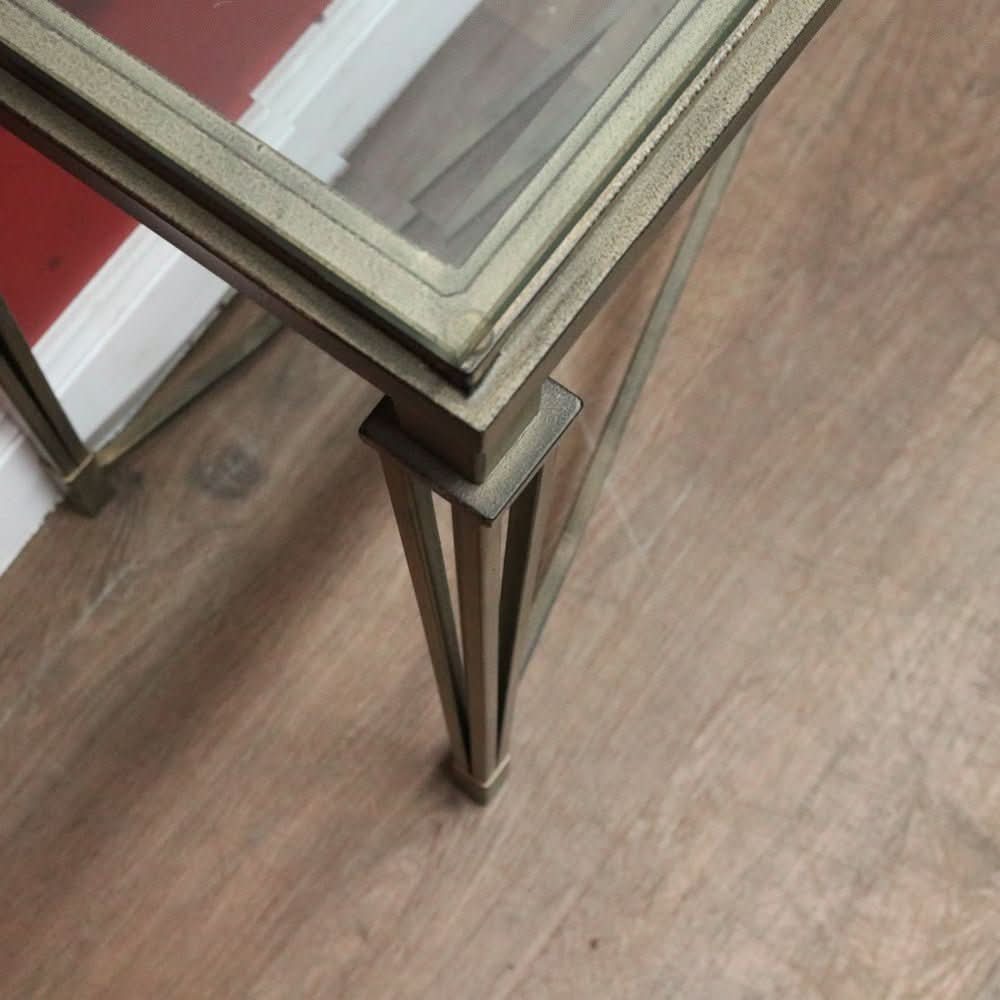 Description: A refined wrought iron sofa or hall table featuring a graceful, muted gold finish. The base design includes a stylish cross stretcher with a central ring motif, adding a sculptural touch. A bevelled-edge glass insert top brings a light and elegant presence, making it perfect for a hallway, behind a sofa, or as a decorative feature. Sold individually but matches a coffee and lamp table, also available at the time of listing.