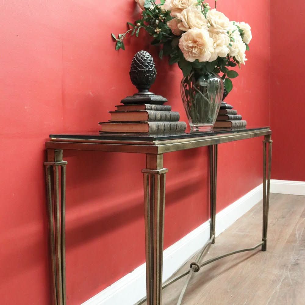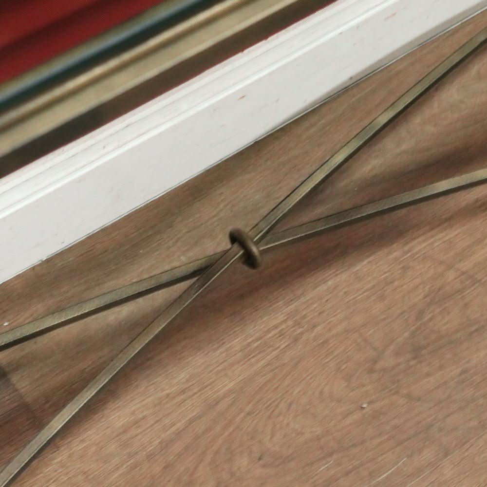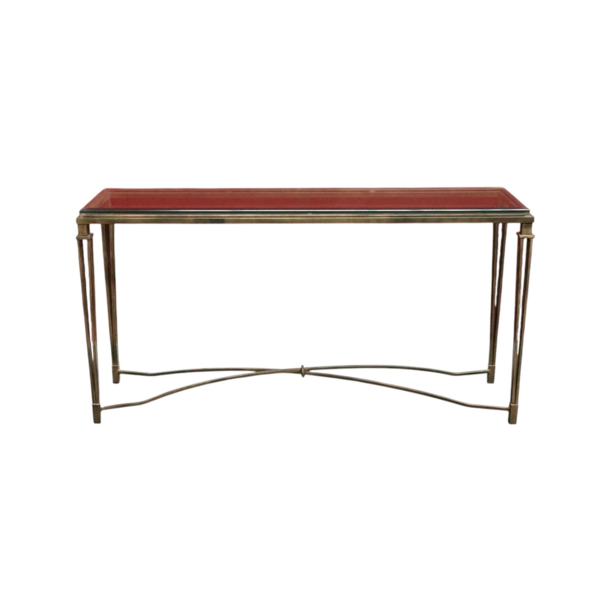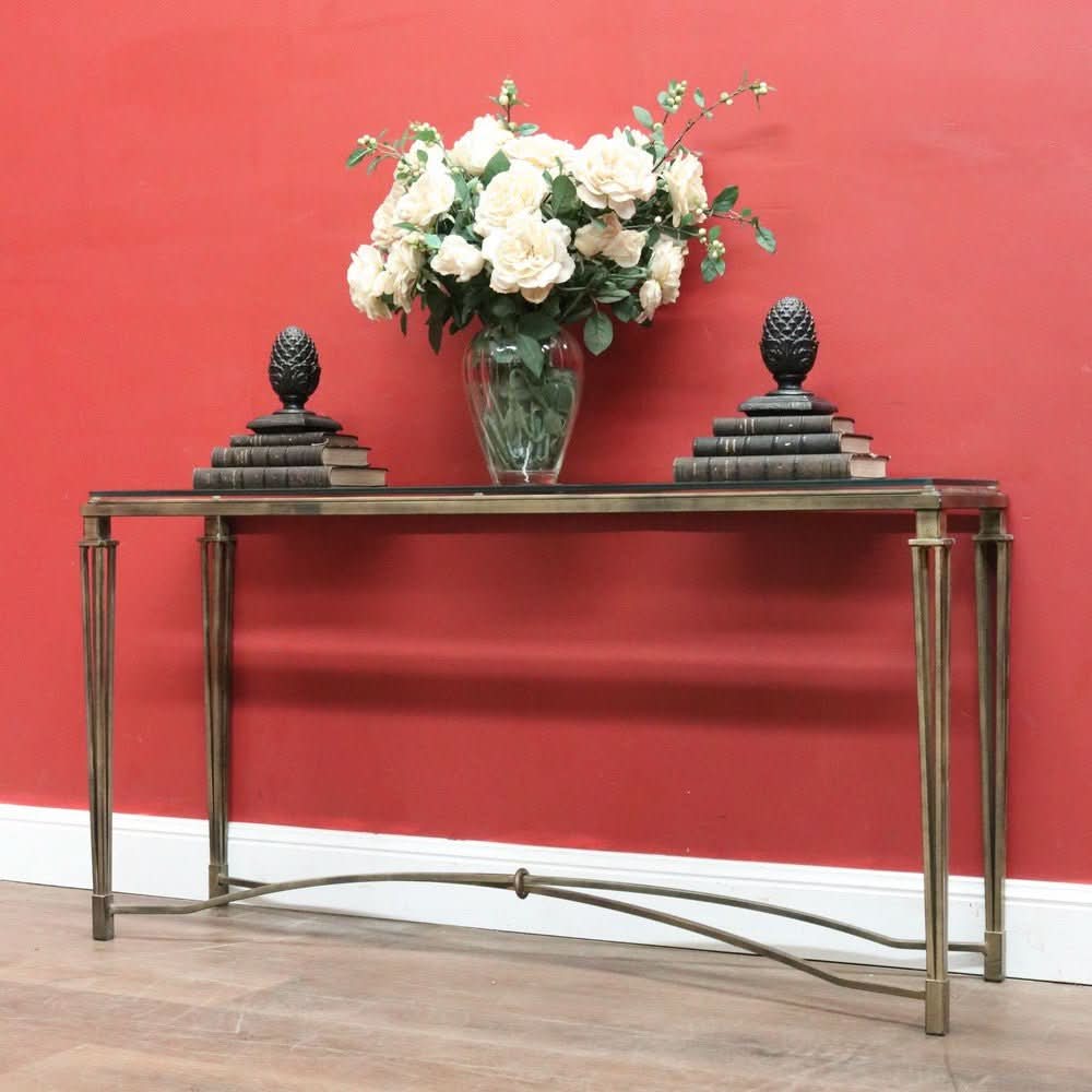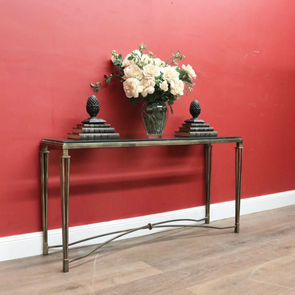 Description: A refined wrought iron sofa or hall table featuring a graceful, muted gold finish. The base design includes a stylish cross stretcher with a central ring motif, adding a sculptural touch. A bevelled-edge glass insert top brings a light and elegant presence, making it perfect for a hallway, behind a sofa, or as a decorative feature. Sold individually but matches a coffee and lamp table, also available at the time of listing.