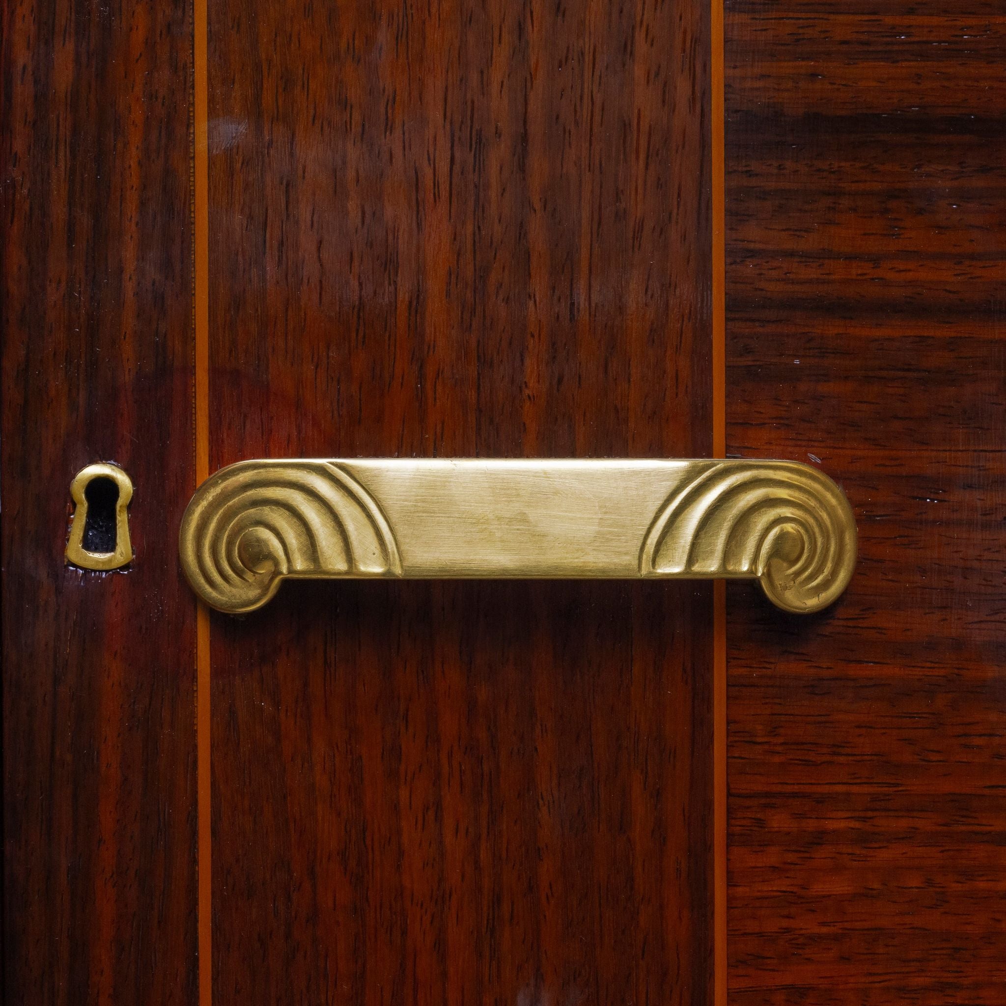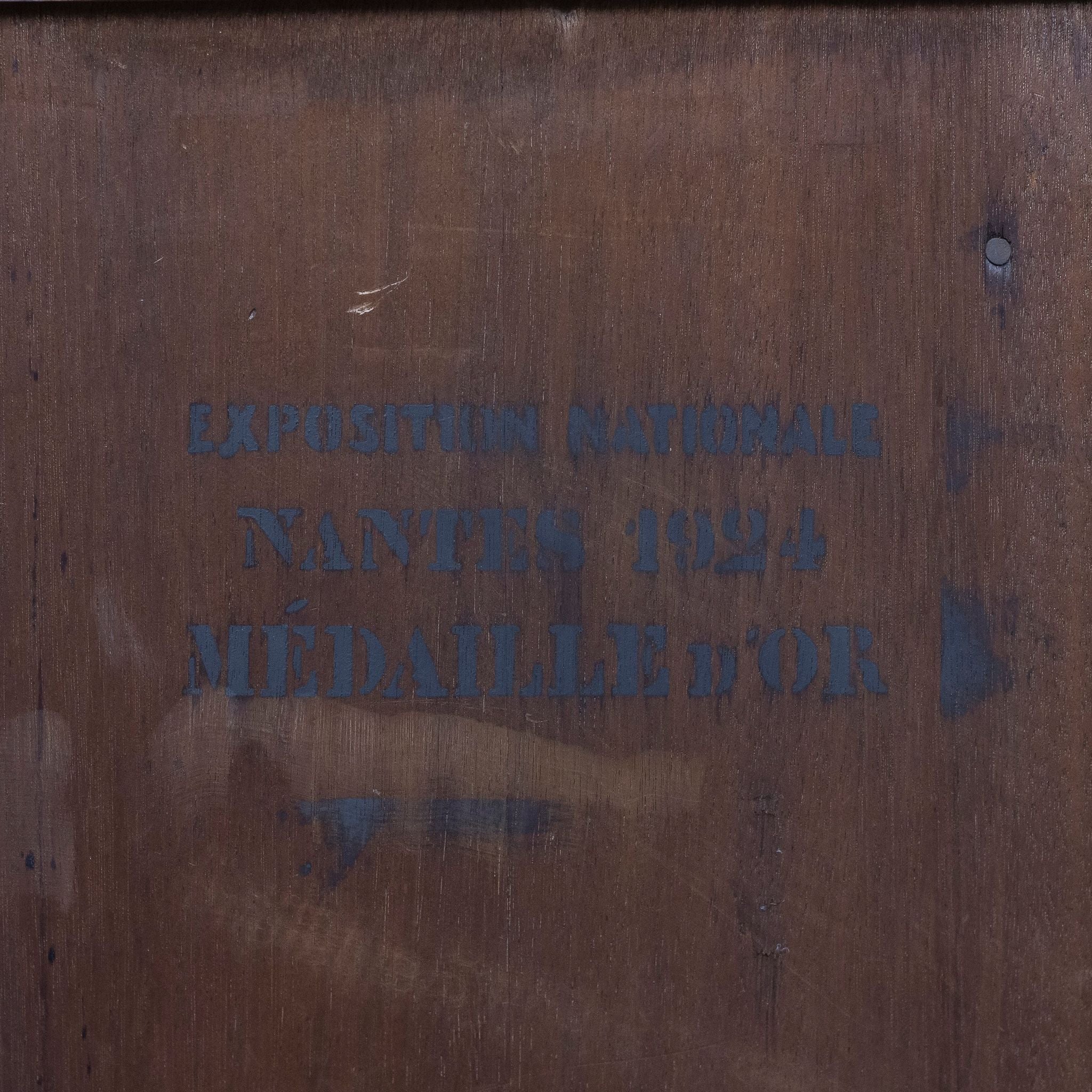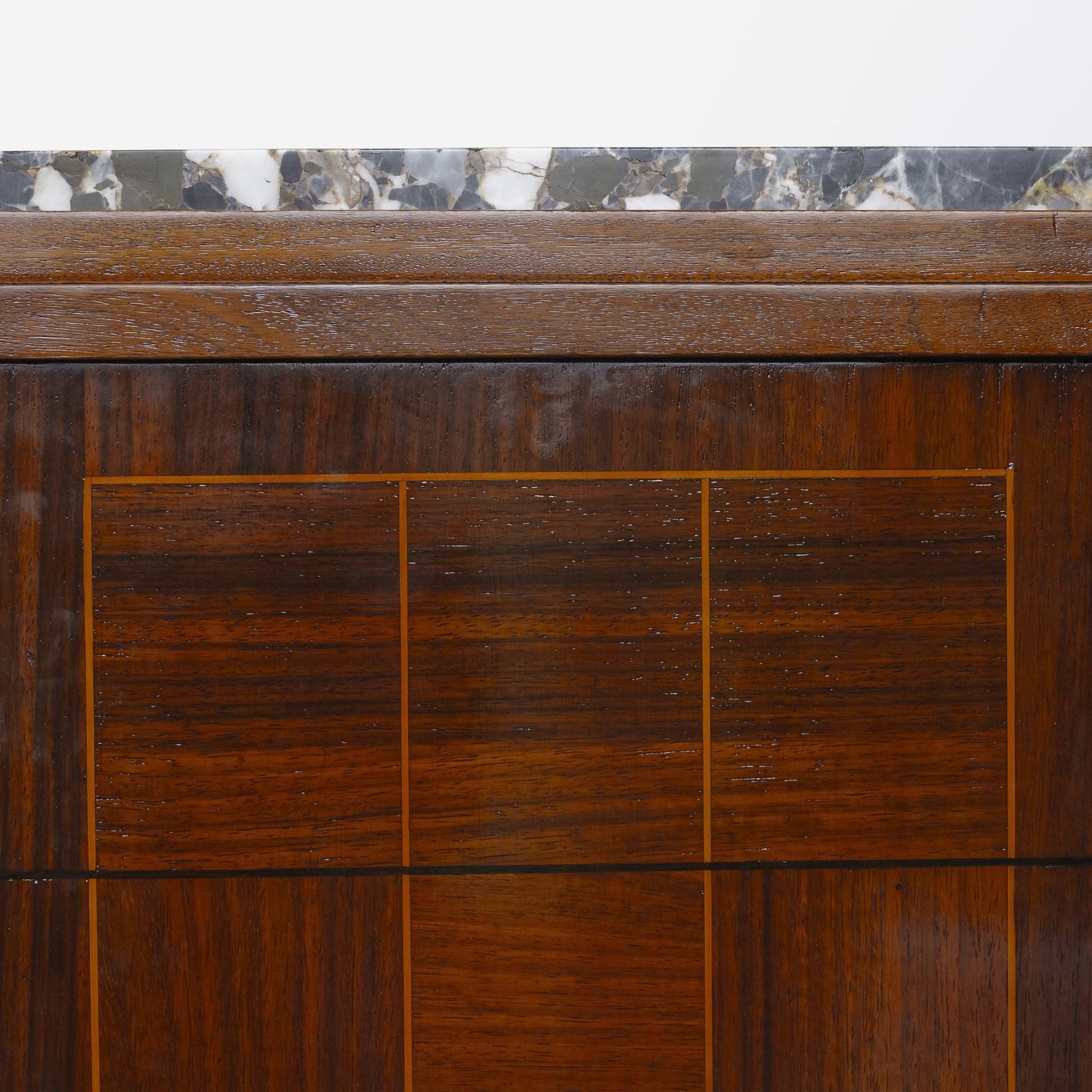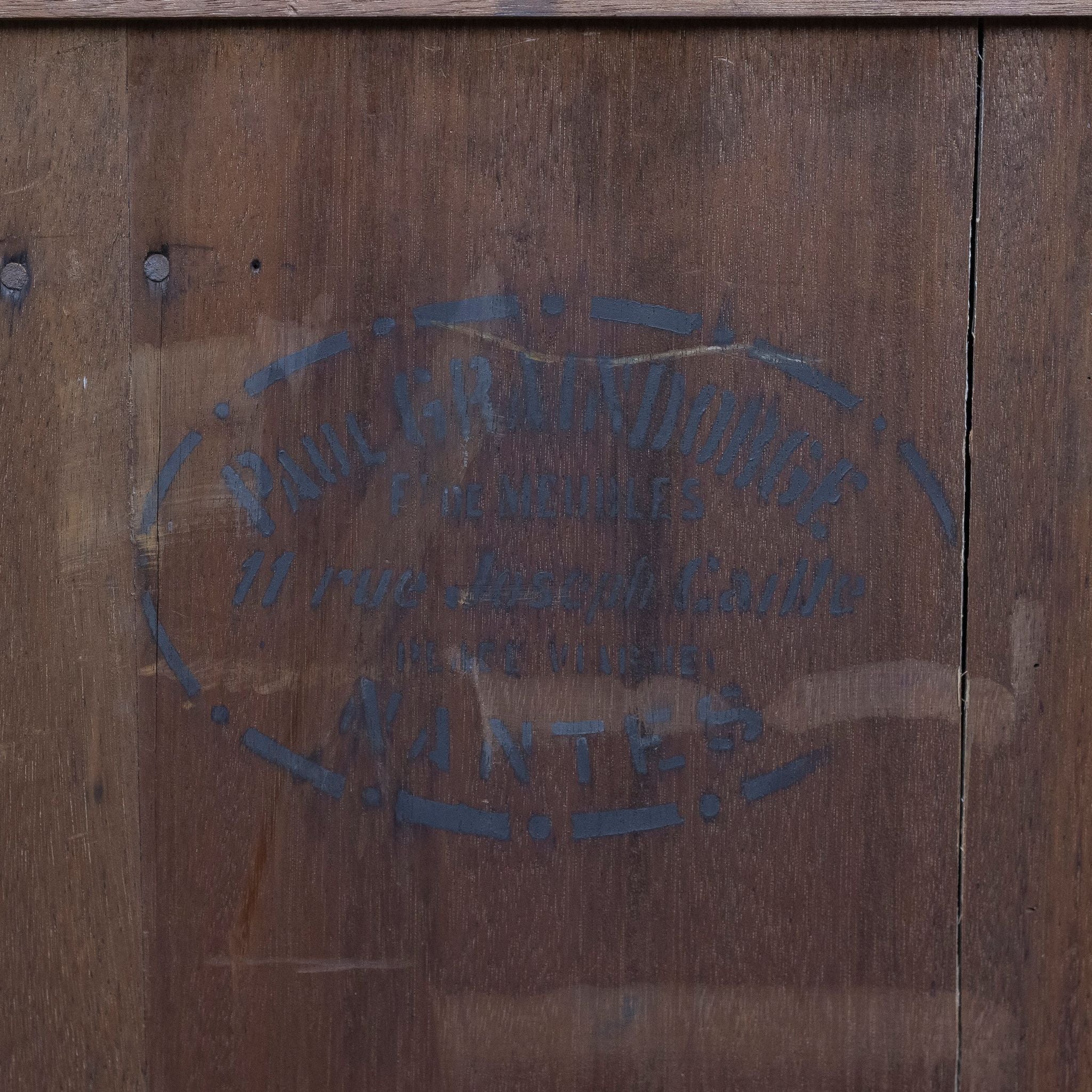 An Art Deco sideboard by Paul Graindorge, earning a gold medal at the Nantes National Exhibition 1924. The angular cabinet, topped with mottled marble slabs, is constructed with teak and veneered with rich rosewood panels, featuring banding of satinwood and ebony on the front doors. The piece has undergone a deep restoration in-house (May 2025), including a replacement of the centre, mirrored door, as well as the addition of era sympathetic handles.The backing of the piece bears two large stamps denoting the maker's name and workshop location, and the gold medal at the national exhibition of Nante in 1924.