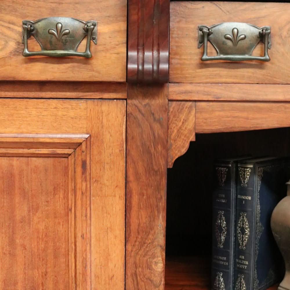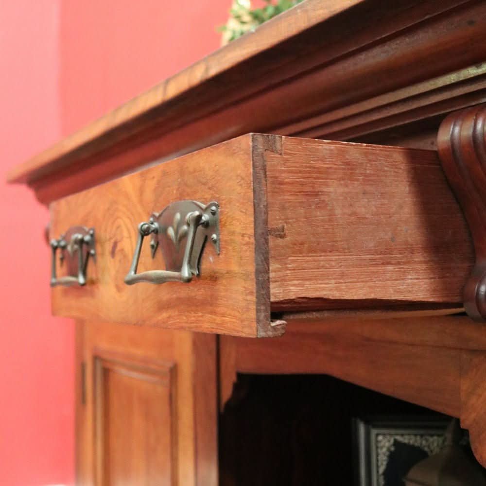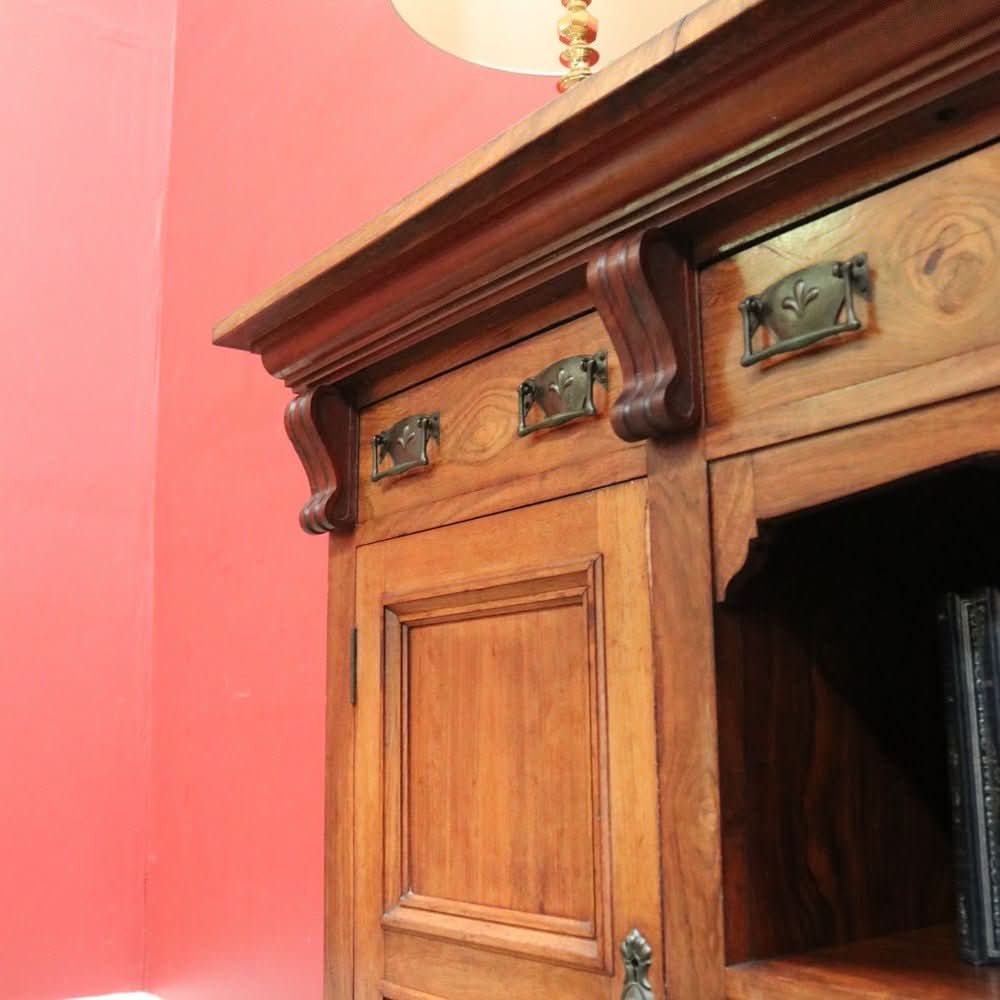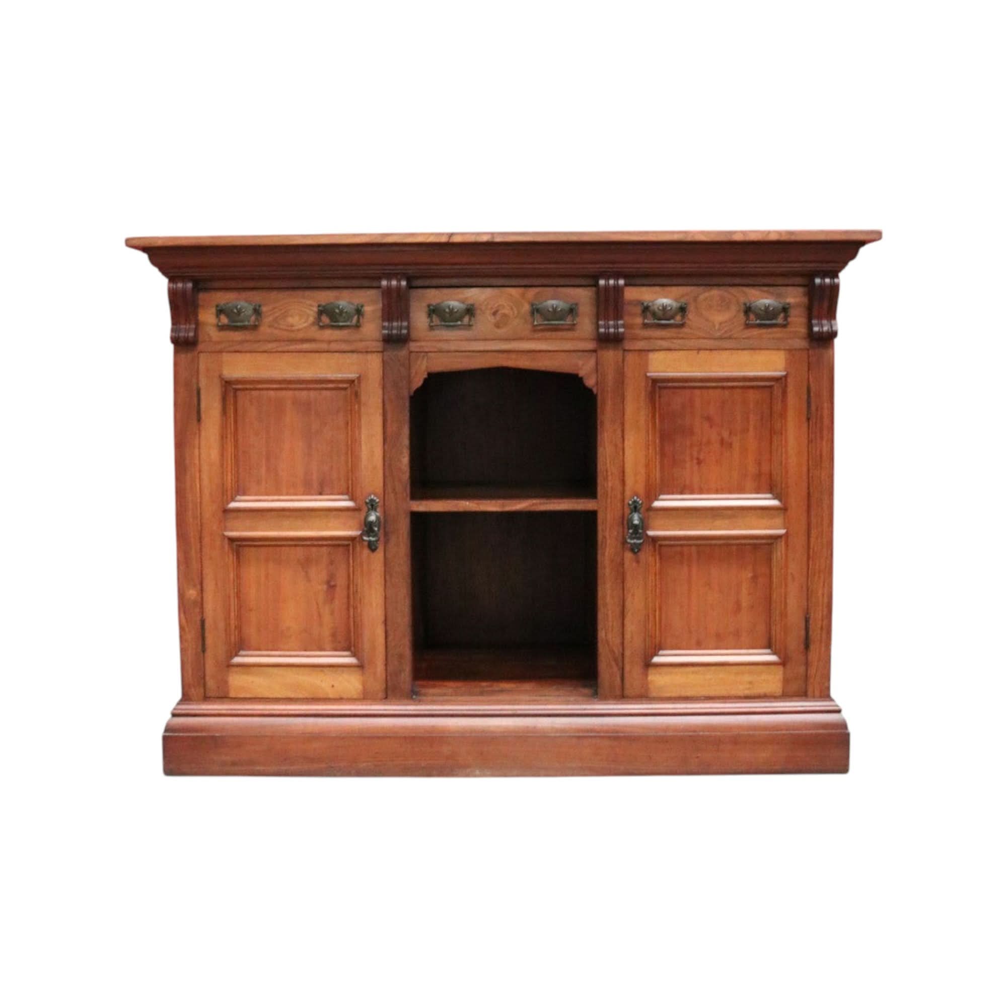 Description: An elegant antique Australian sideboard or hall cabinet crafted in blackwood with cedar shelves and internal timbers. The open central section is perfect for displaying your favourite pieces, while three drawers across the apron add practicality. The left and right cabinets each feature a shelf with generous clearance, offering versatile storage. Beautifully proportioned and full of character, this piece combines functionality with the warm charm of fine Australian craftsmanship.