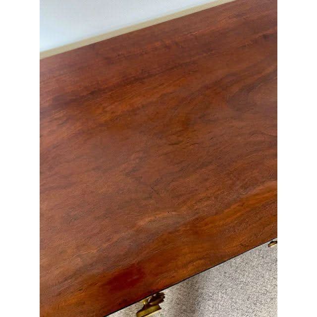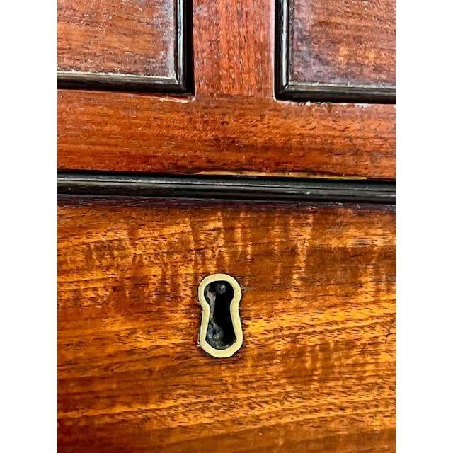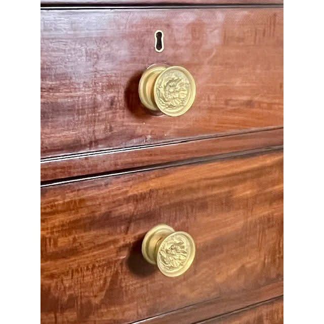 The chest is crafted to a very high standard and includes selected solid Mahogany boards of excellent colour and figuring and matched timber for the drawer fronts. The rectangular top is beautifully figured and has a vertical edge cross banding. Around the perimeter it has an Ebony line inlay. The rectangular case has two top side by side drawers with three full width graduated drawers beneath. All drawers have an Ebony cock bead perimeter molding original locks and key hole escutcheons. The lovely brass drawer pull knobs and their backing plates are later however top quality authentically detailed castings. Regretfully brass hardware went out of fashion during the Victorian period when turned timber knobs were preferred so many chests were ‘modernised’ at the time by replacing the original brass hardware with timber knobs. This chest has been beautifully restored and the original style of brass drawer pull knobs re instated.