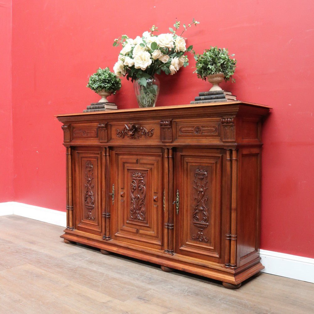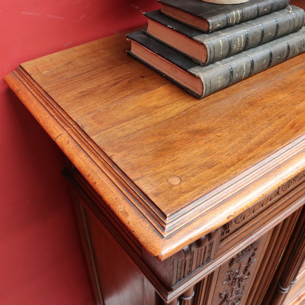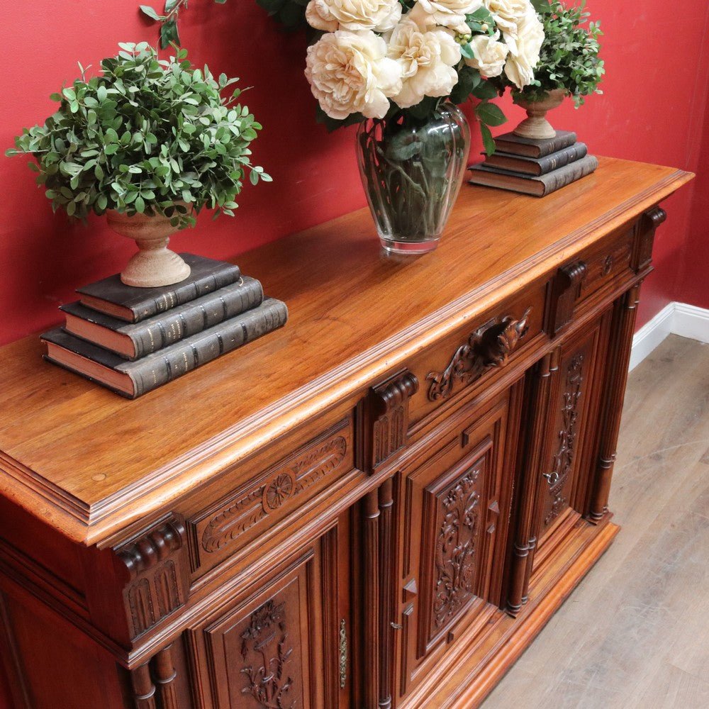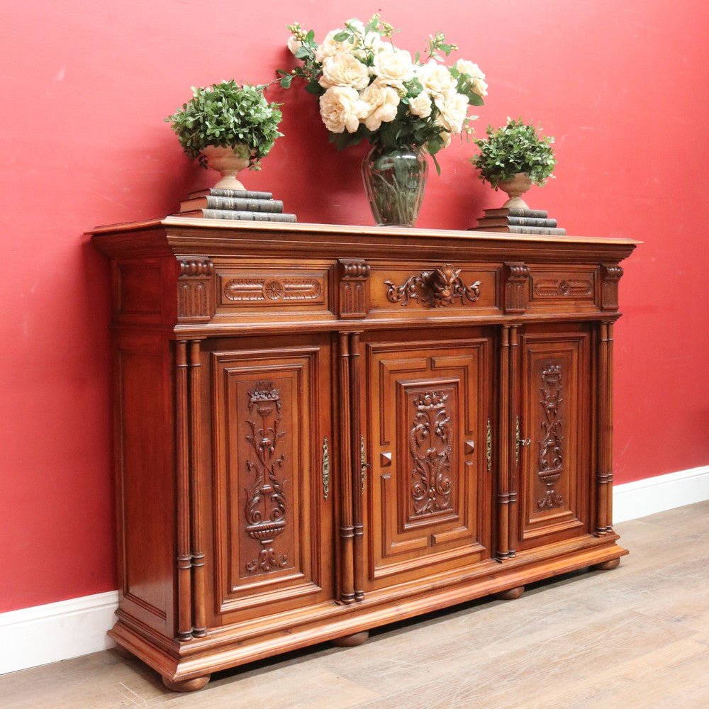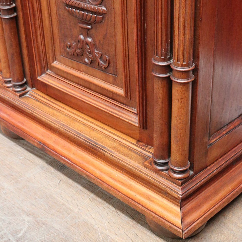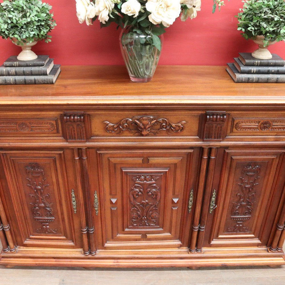 Description: An antique French three-door sideboard in walnut, featuring carved detail throughout and brass escutcheons. The façade is framed by double reeded columns to each side of the doors, adding structure and definition to the piece.