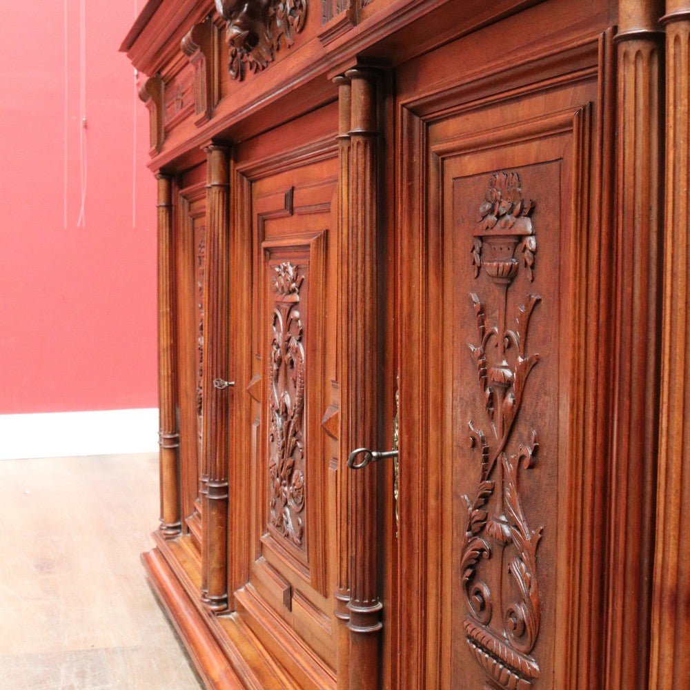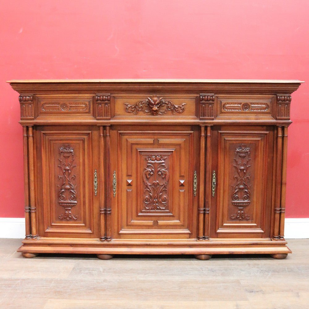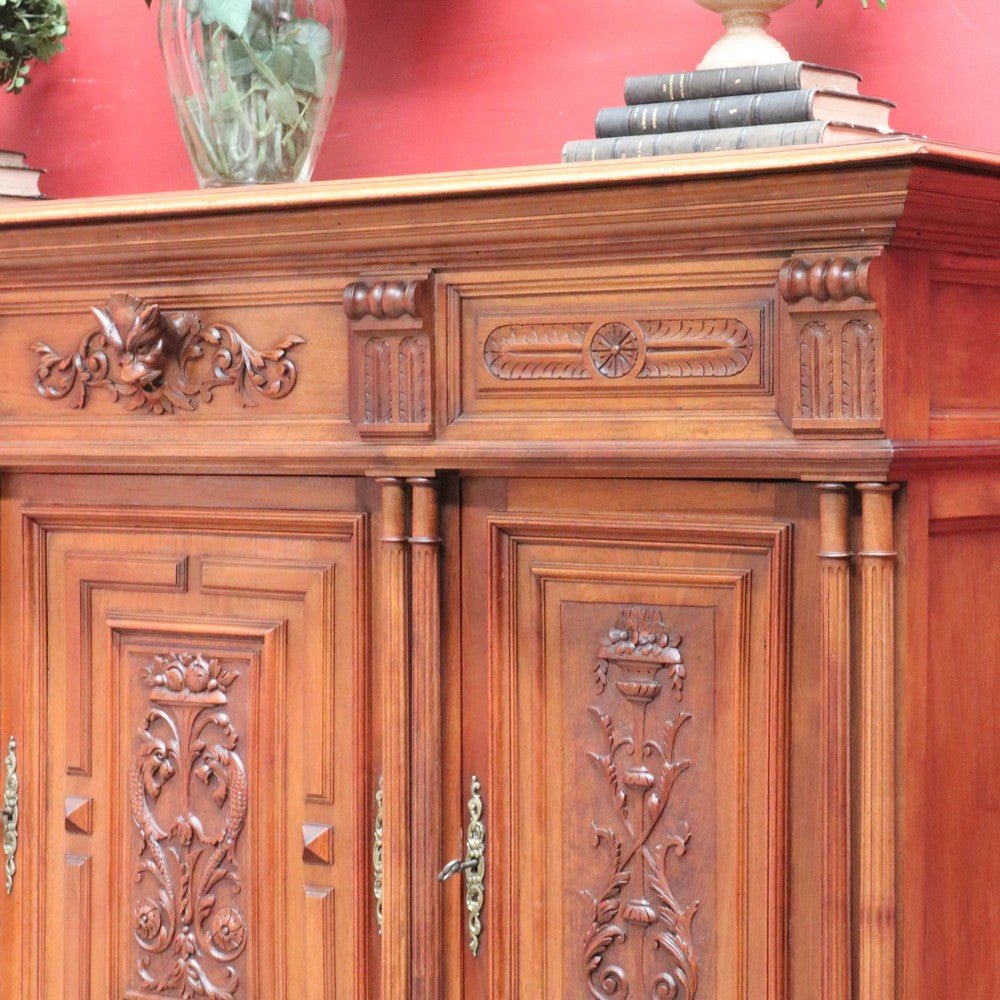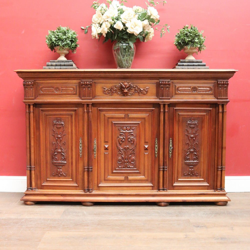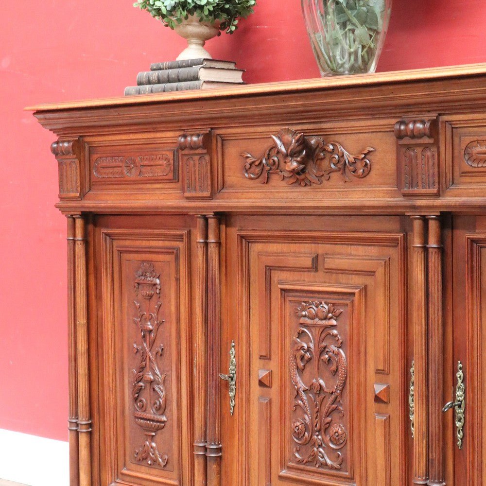 Description: An antique French three-door sideboard in walnut, featuring carved detail throughout and brass escutcheons. The façade is framed by double reeded columns to each side of the doors, adding structure and definition to the piece.