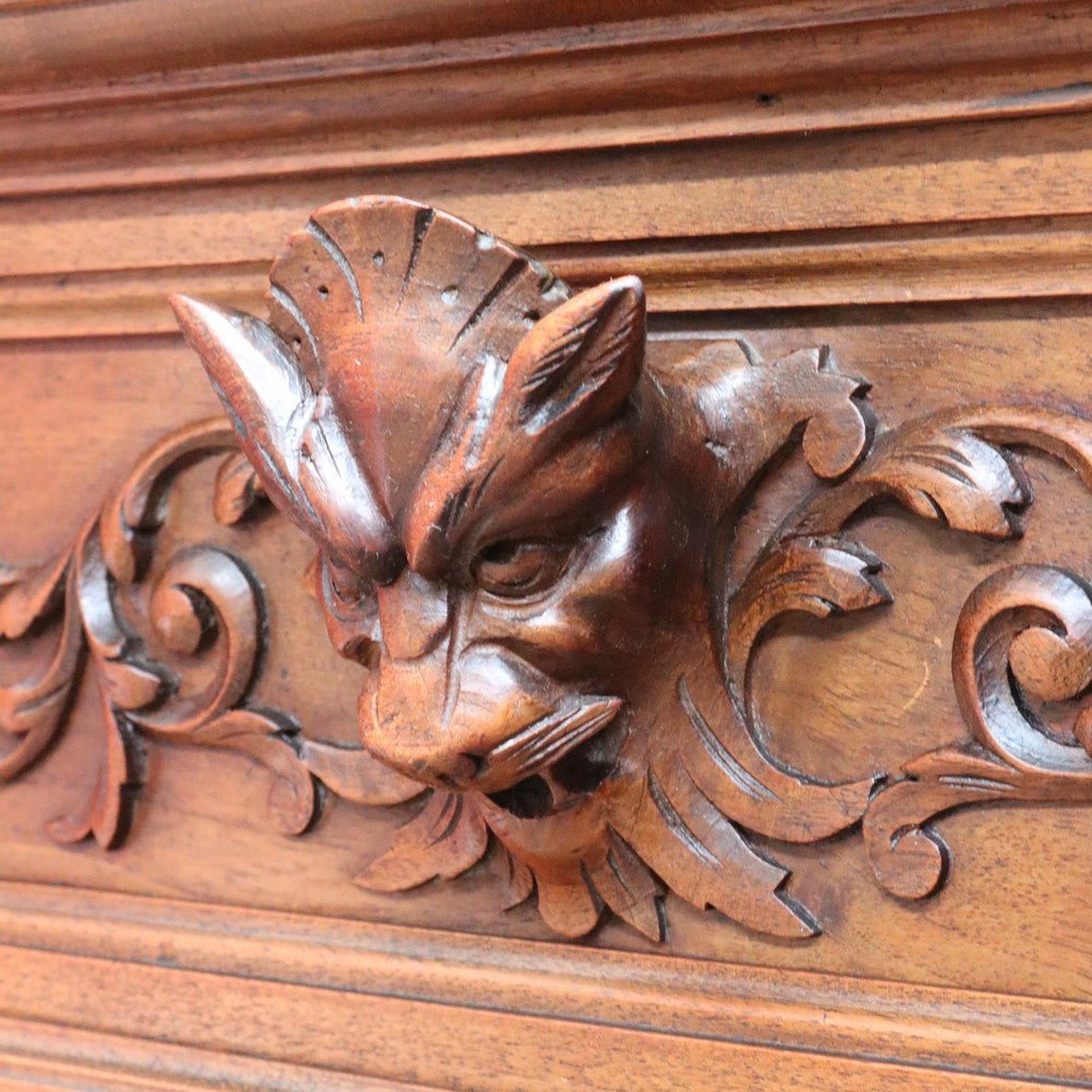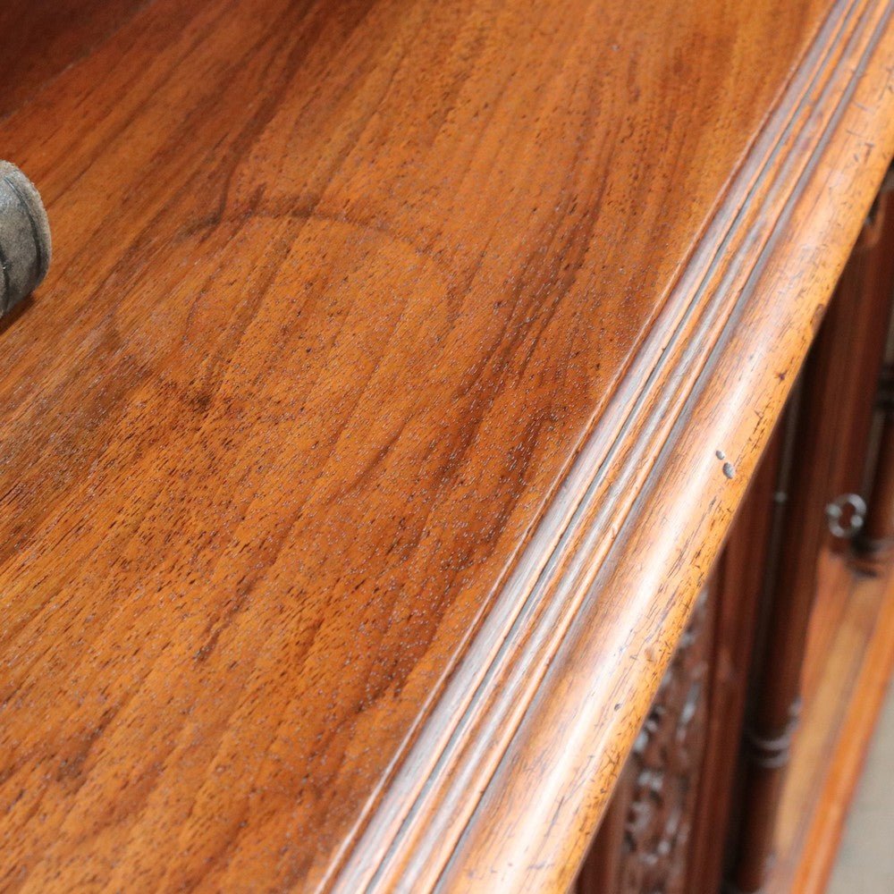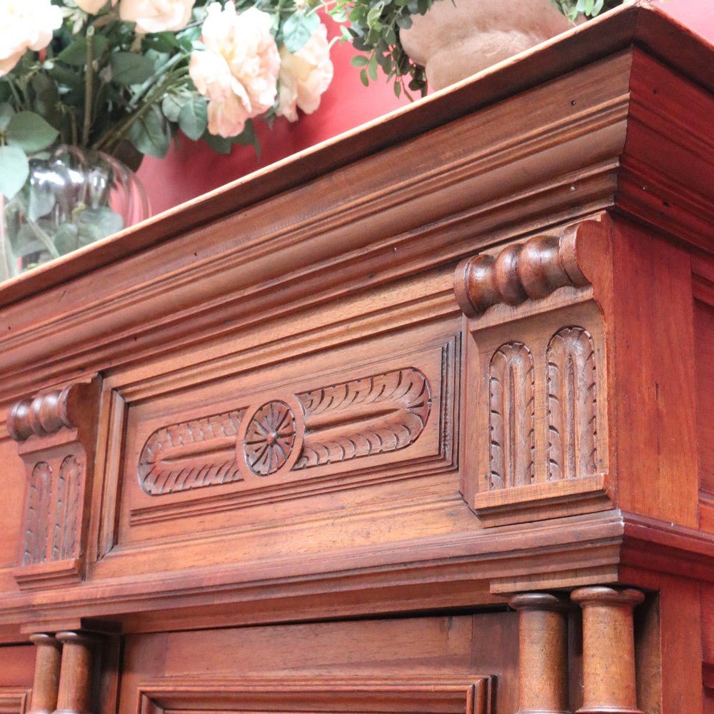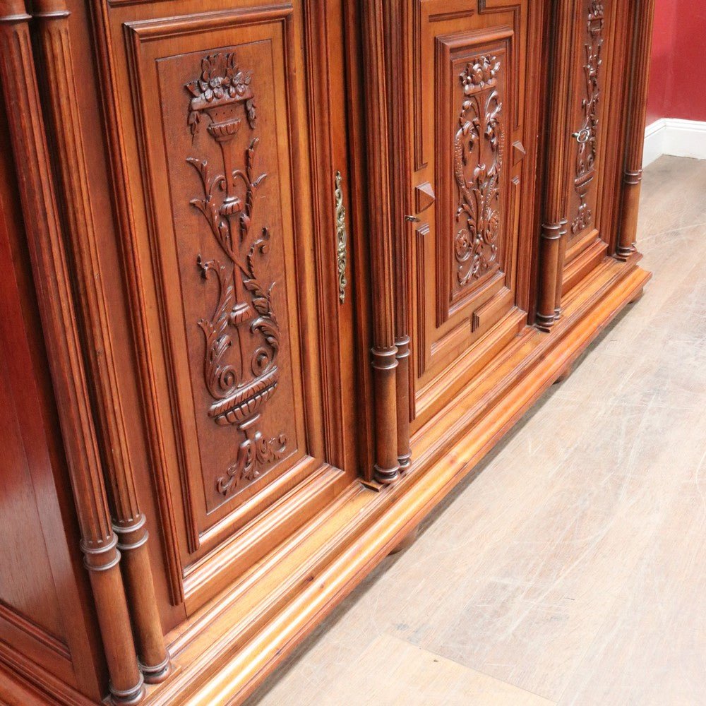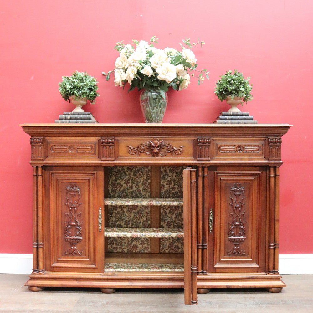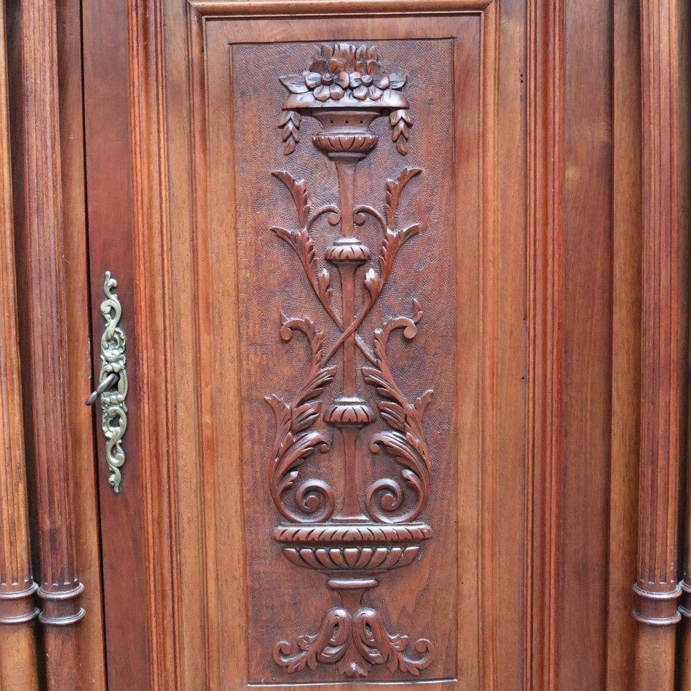 Description: An antique French three-door sideboard in walnut, featuring carved detail throughout and brass escutcheons. The façade is framed by double reeded columns to each side of the doors, adding structure and definition to the piece.