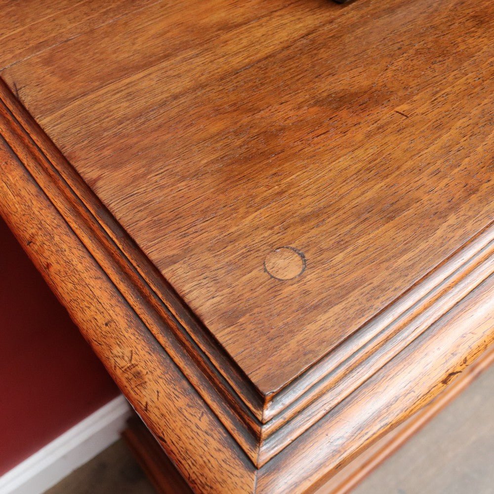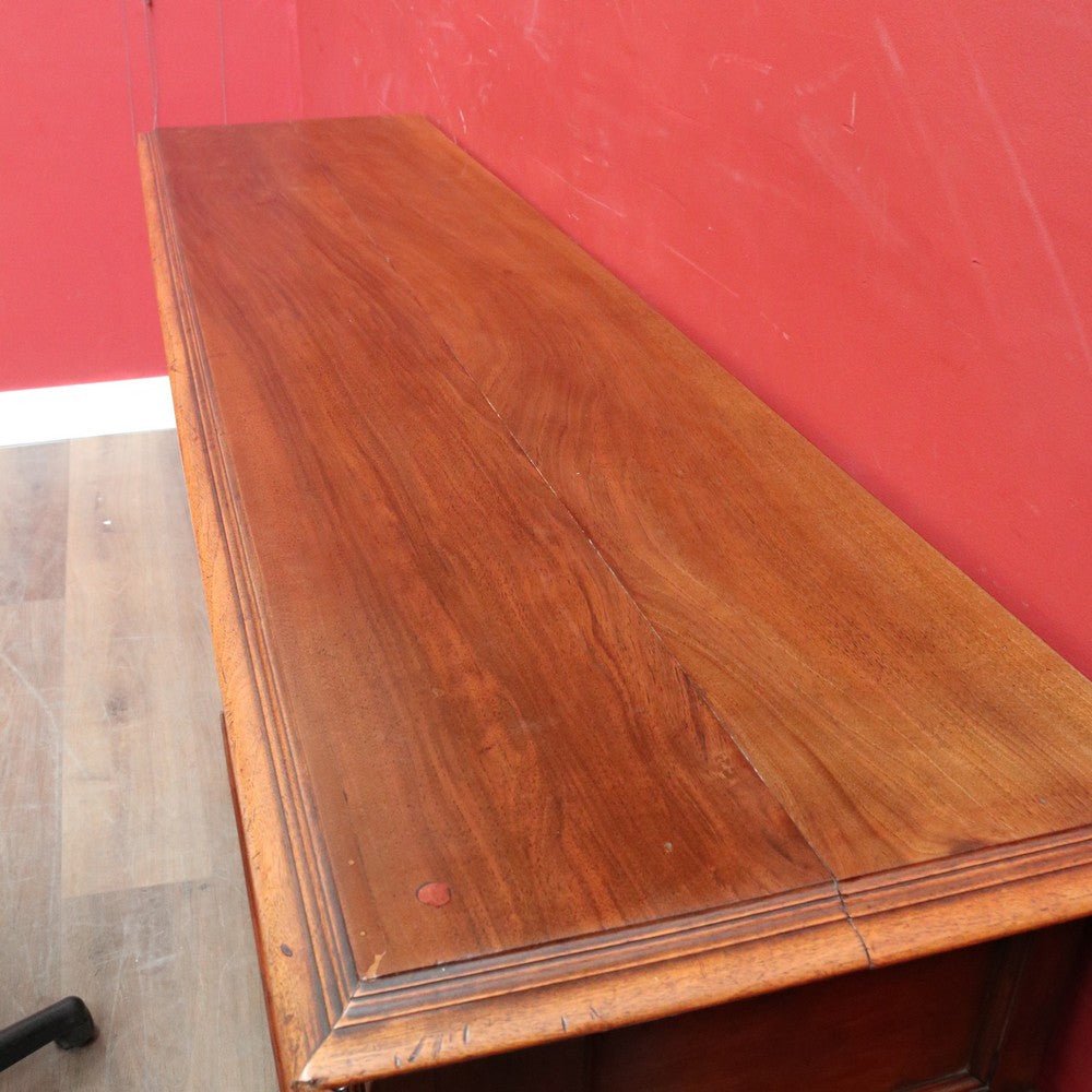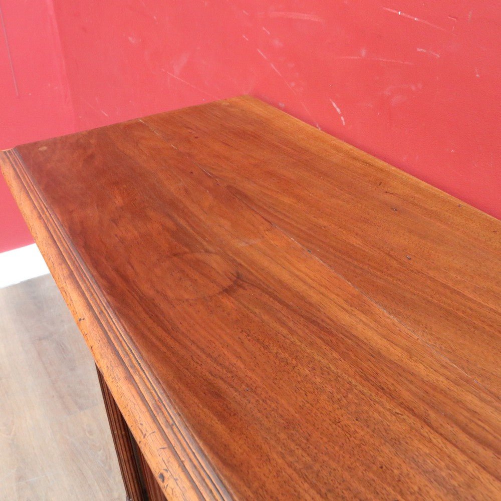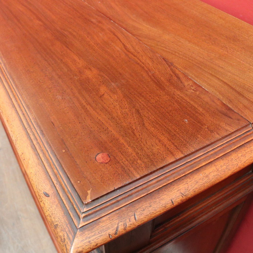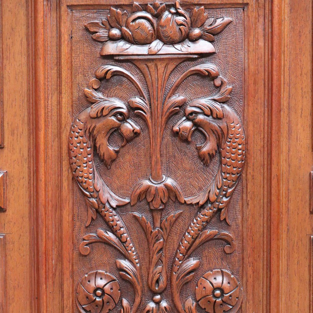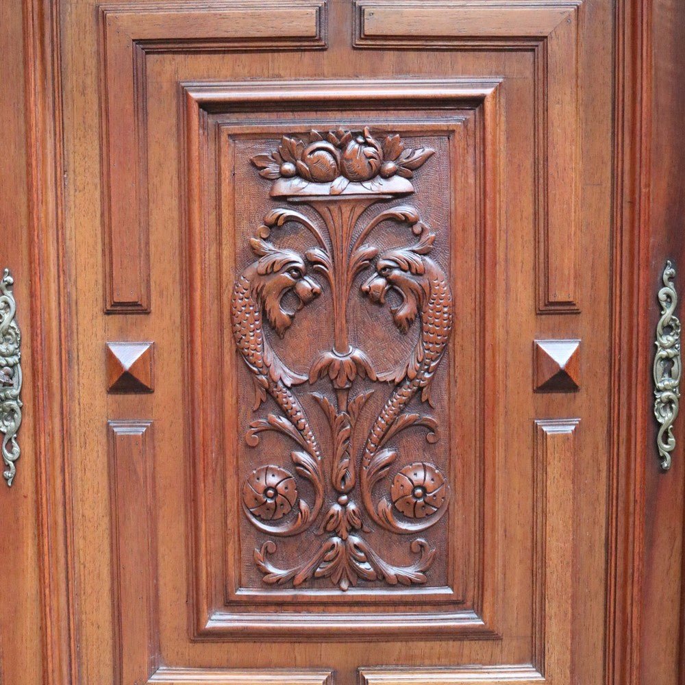 Description: An antique French three-door sideboard in walnut, featuring carved detail throughout and brass escutcheons. The façade is framed by double reeded columns to each side of the doors, adding structure and definition to the piece.