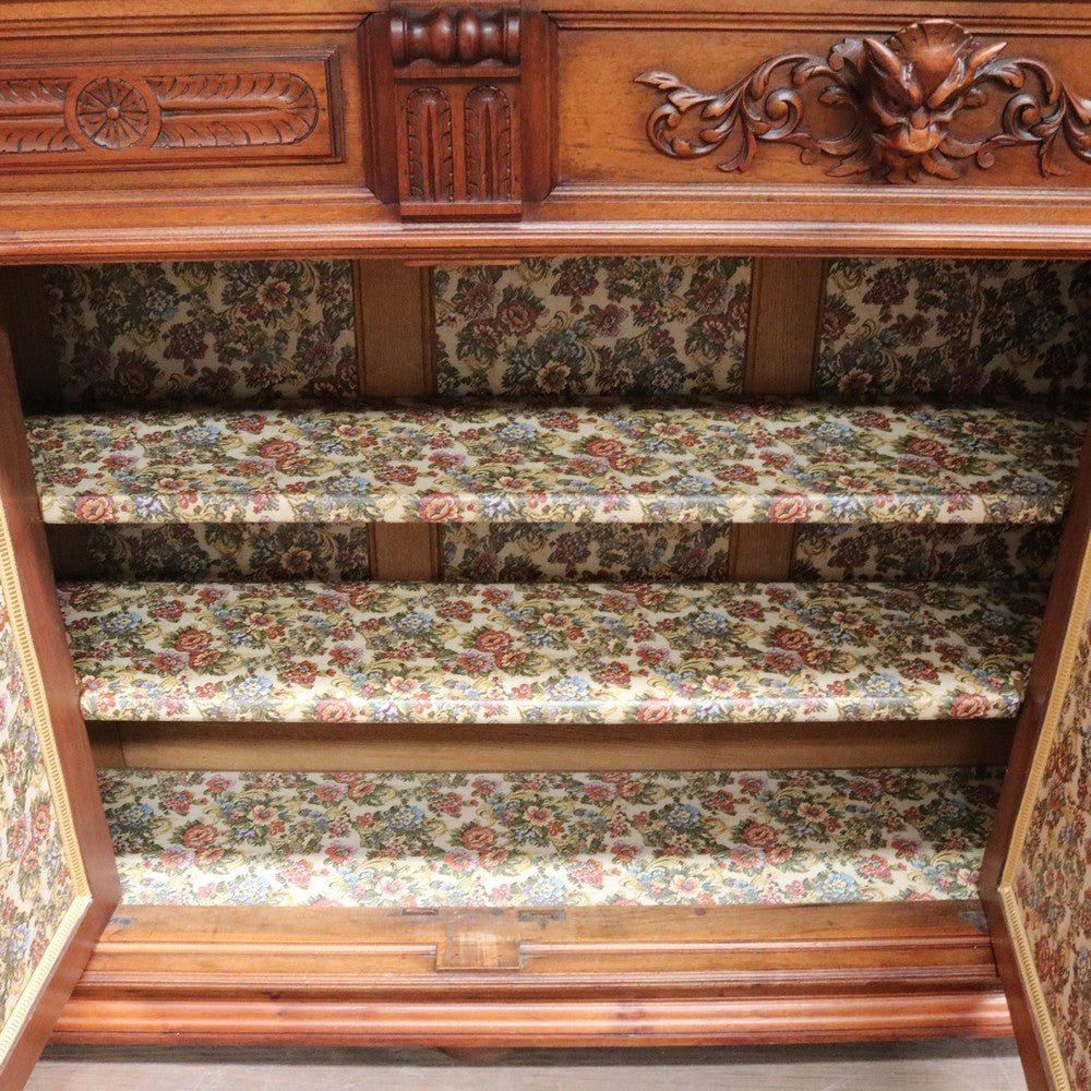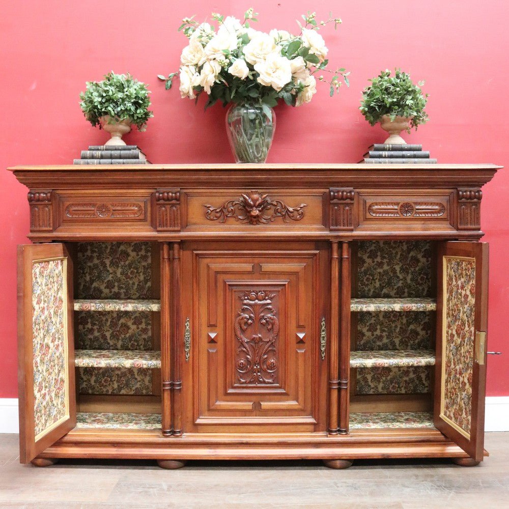 The interior has been lined in a floral-patterned fabric, extending across the doors and shelving. The right-hand door opens to a storage compartment, while the centre and left doors provide access to a larger storage space. A substantial and practical piece suited to dining or living areas.
