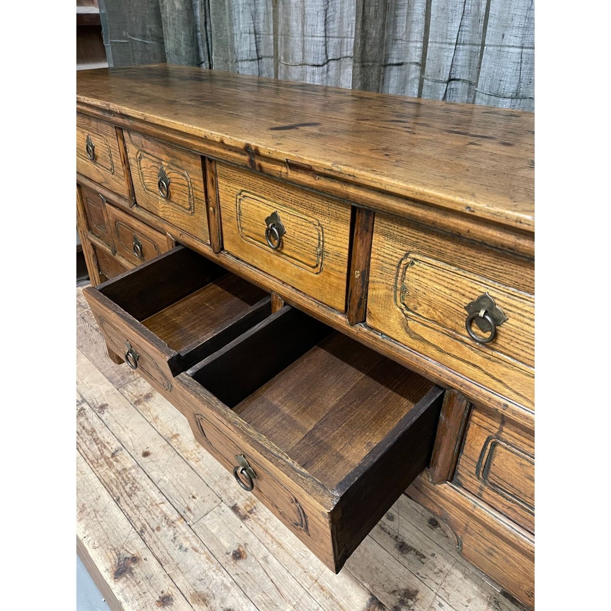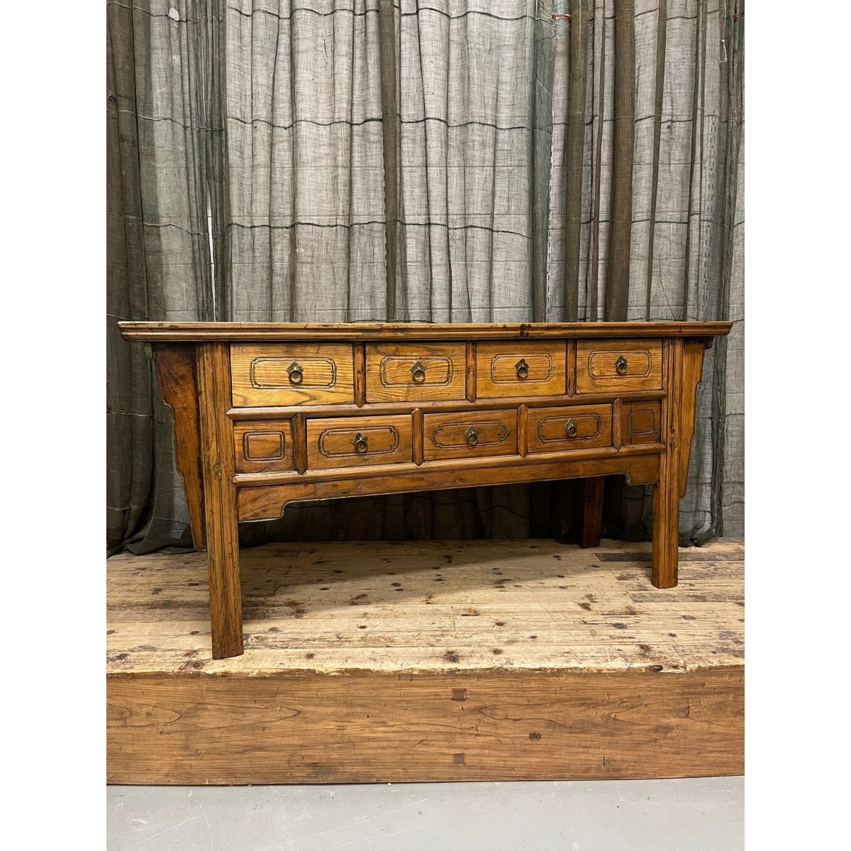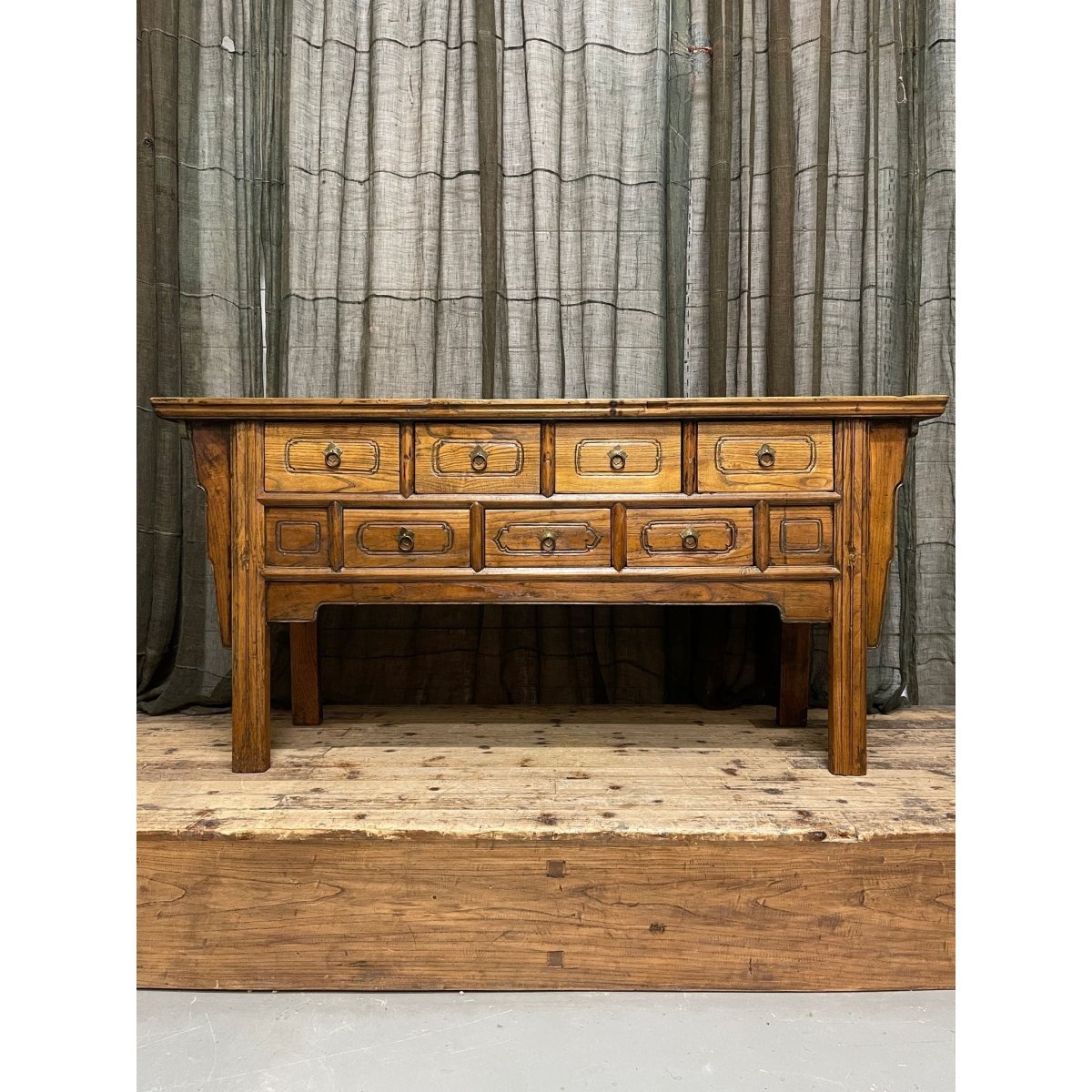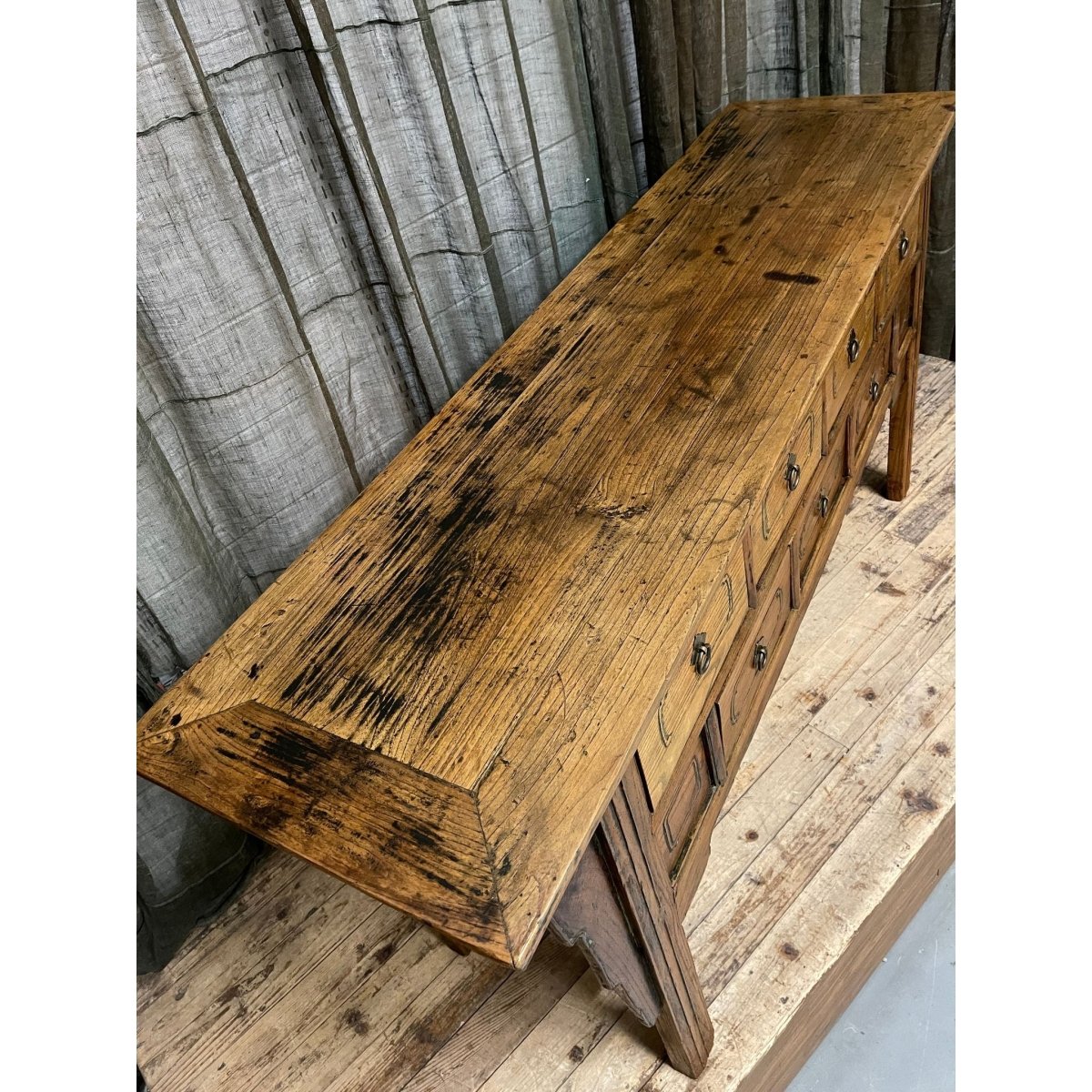 Antique provincial Chinese seven-drawer hall table made from elm wood.