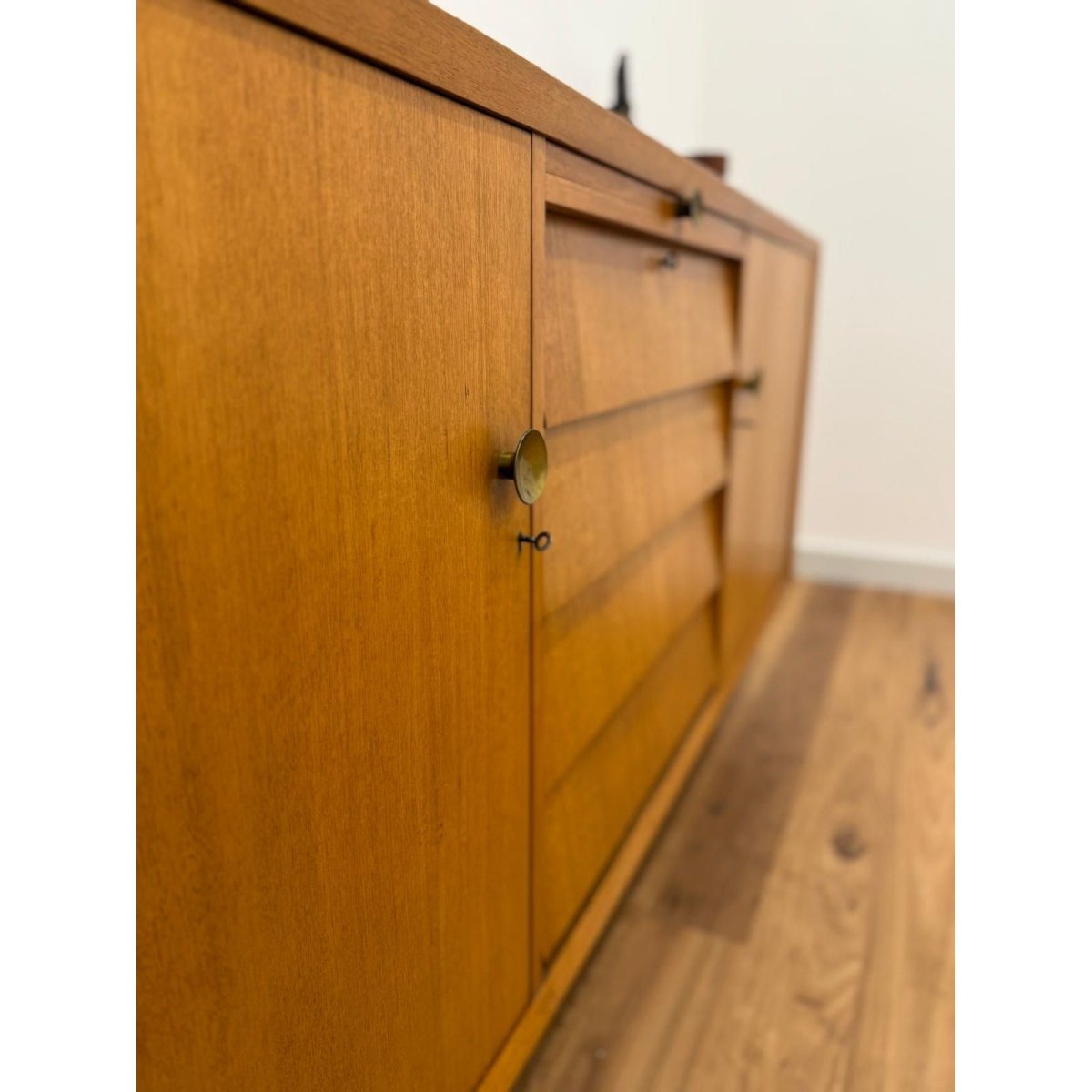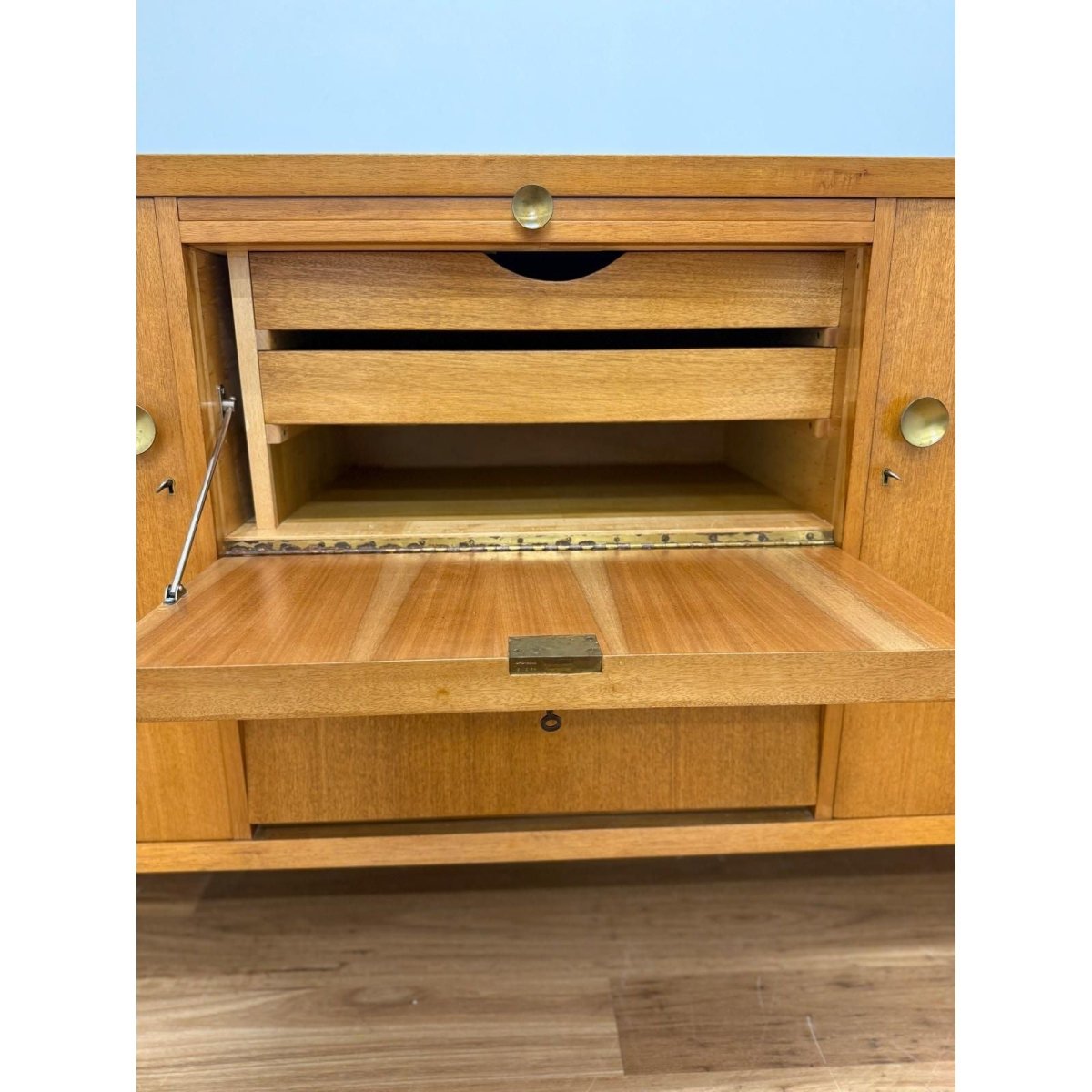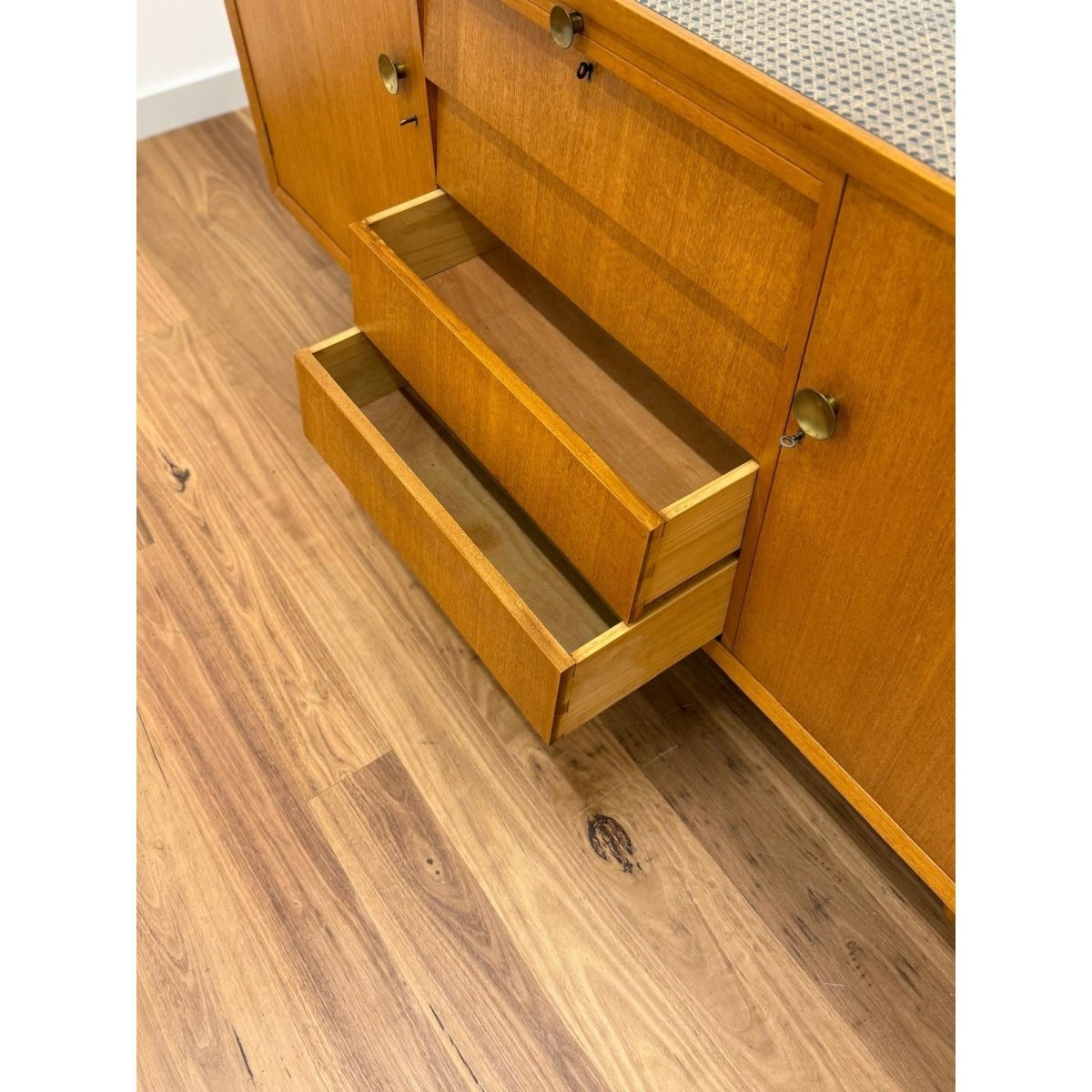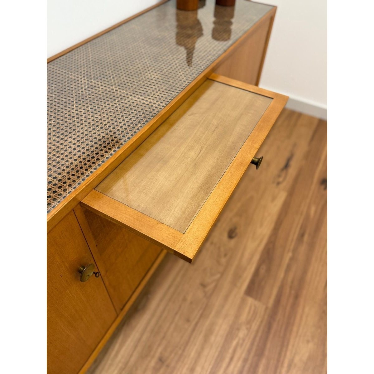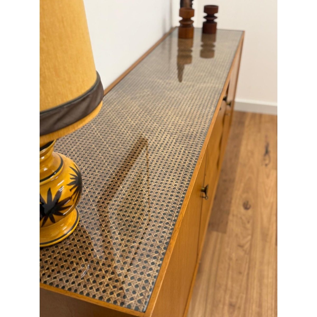 This impressive piece offers ample storage with dual cupboards, four central drawers, and a concealed drinks tray, ideal for entertaining. The concave brass handles lend a sculptural accent, while the woven rattan top with glass detail adds texture and refinement.