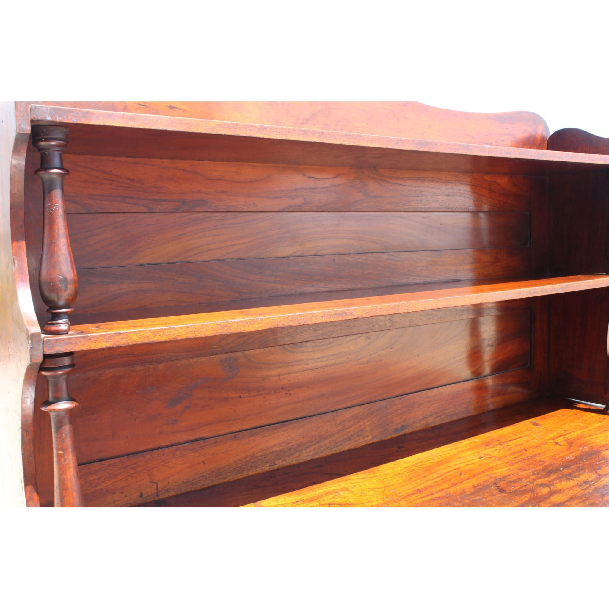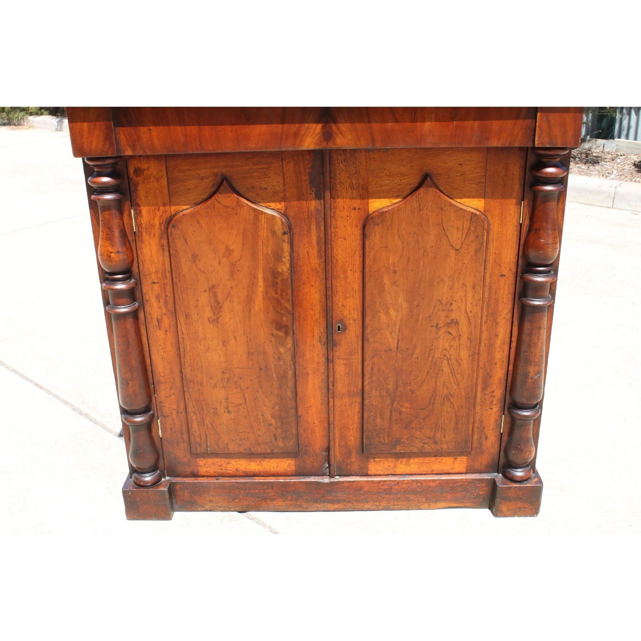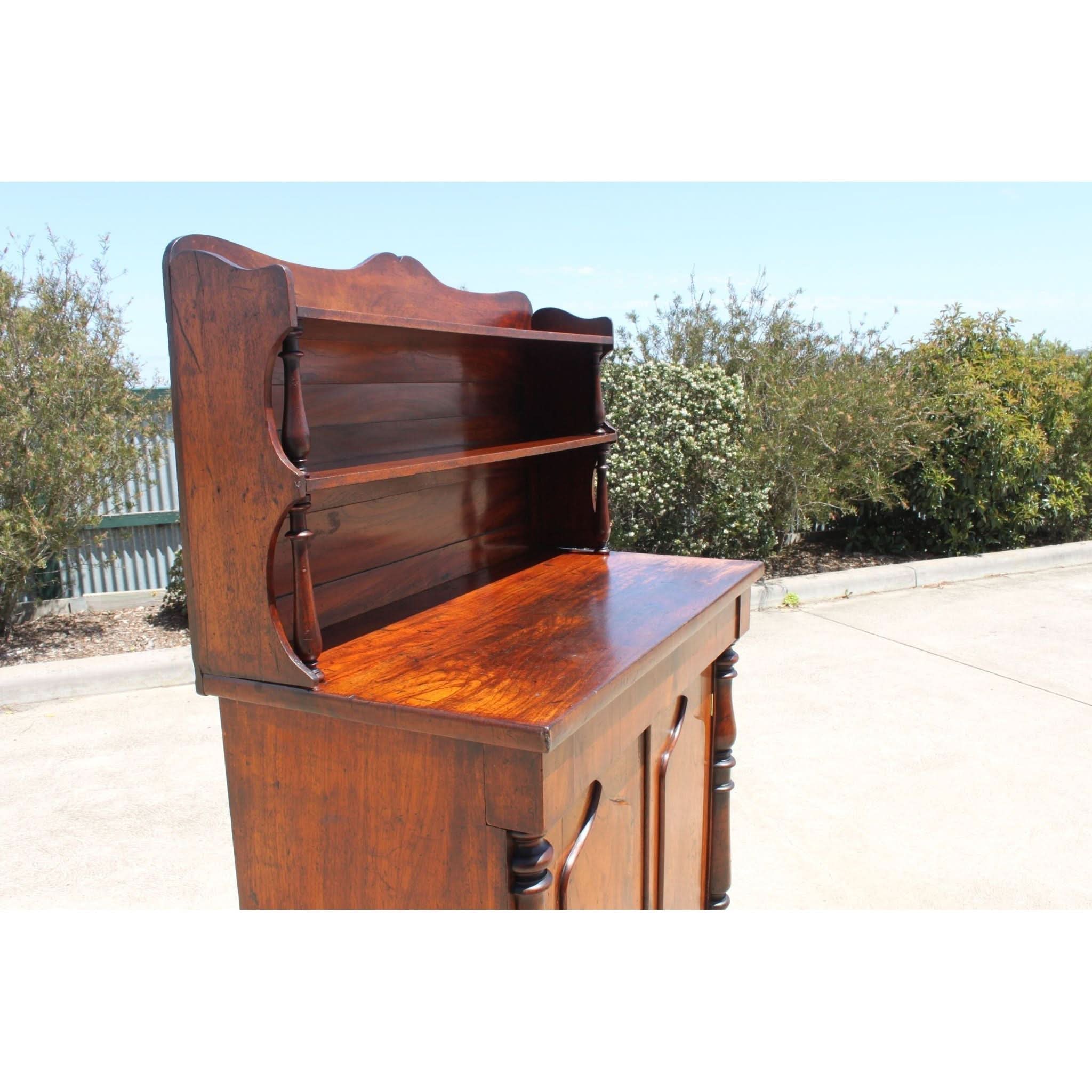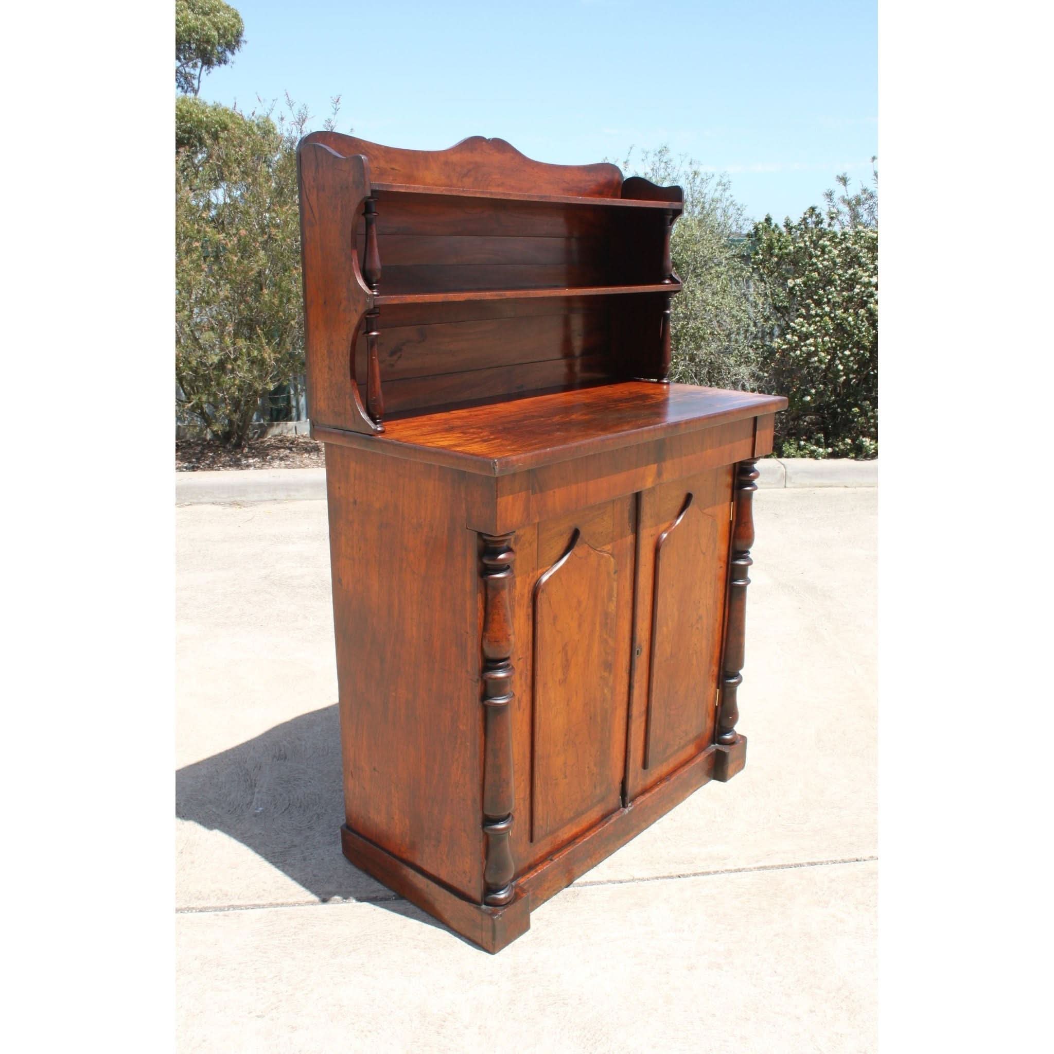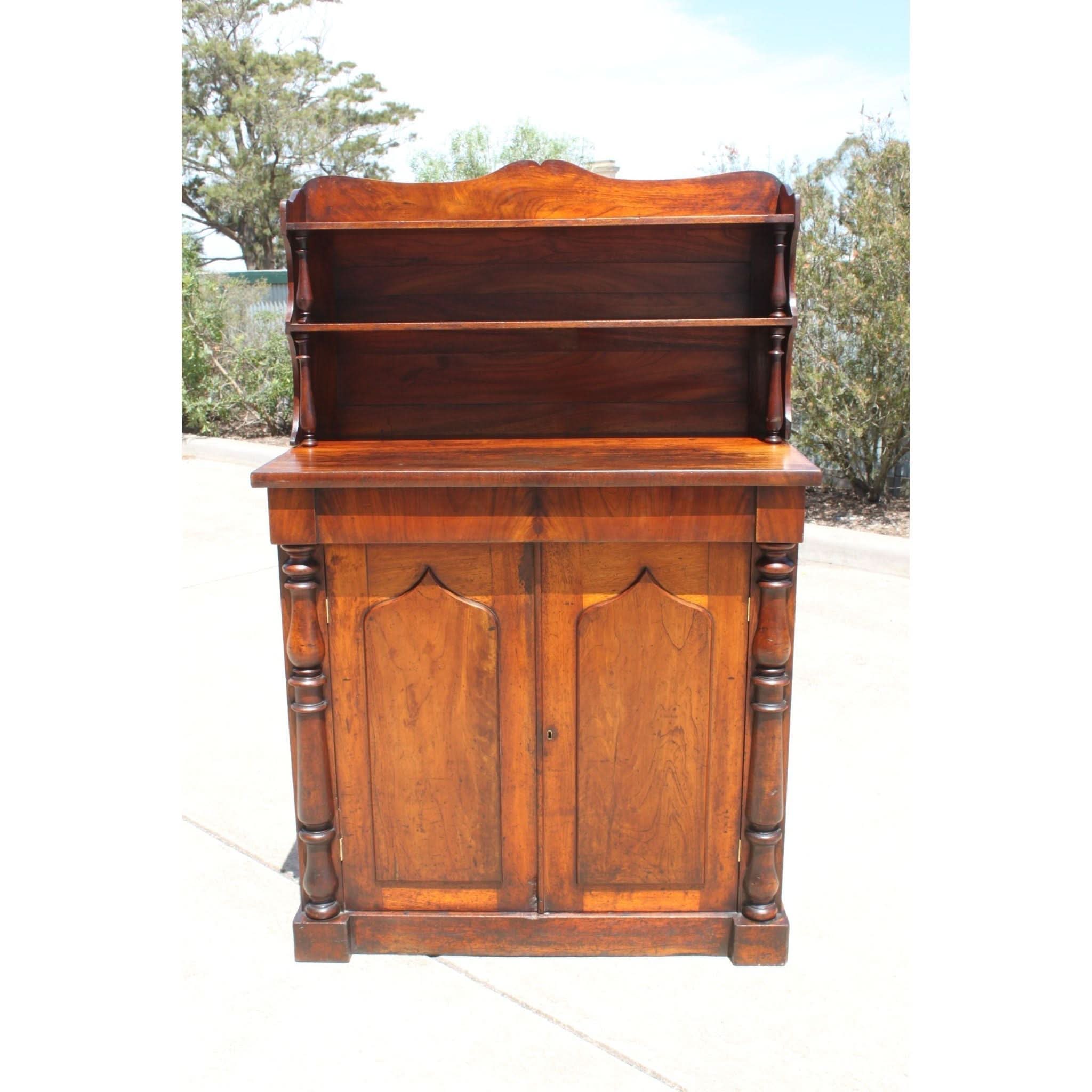 By 1840, it is estimated that there were only around 140,000 settlers in the whole of Australia. Given this small market, and a natural attrition rate, this makes any goods made in Australia prior to the population boom of the gold rush years, very scarce indeed. The base of this cedar chiffoniere dates from around 1840 and the top is around the same age, if not slightly earlier. Both the top and the base show a wonderfully rich, mellow colour. The two shield shape doors in the base are flanked by half turned baluster shaped pilasters. Above the doors, the front of the drawer is veneered in book matched flame cedar. The top features two shelves supported by baluster shaped supports and the shaped back has fielded panels. The side panels to the top were added later, but, as the hand forged nails attest, not long after it was made. Even though it is a marriage, the base and top go together to form a very pleasing piece of early Australian furniture. It stands 1755 mm high, is 1120 mm wide and has a depth of 555 mm.